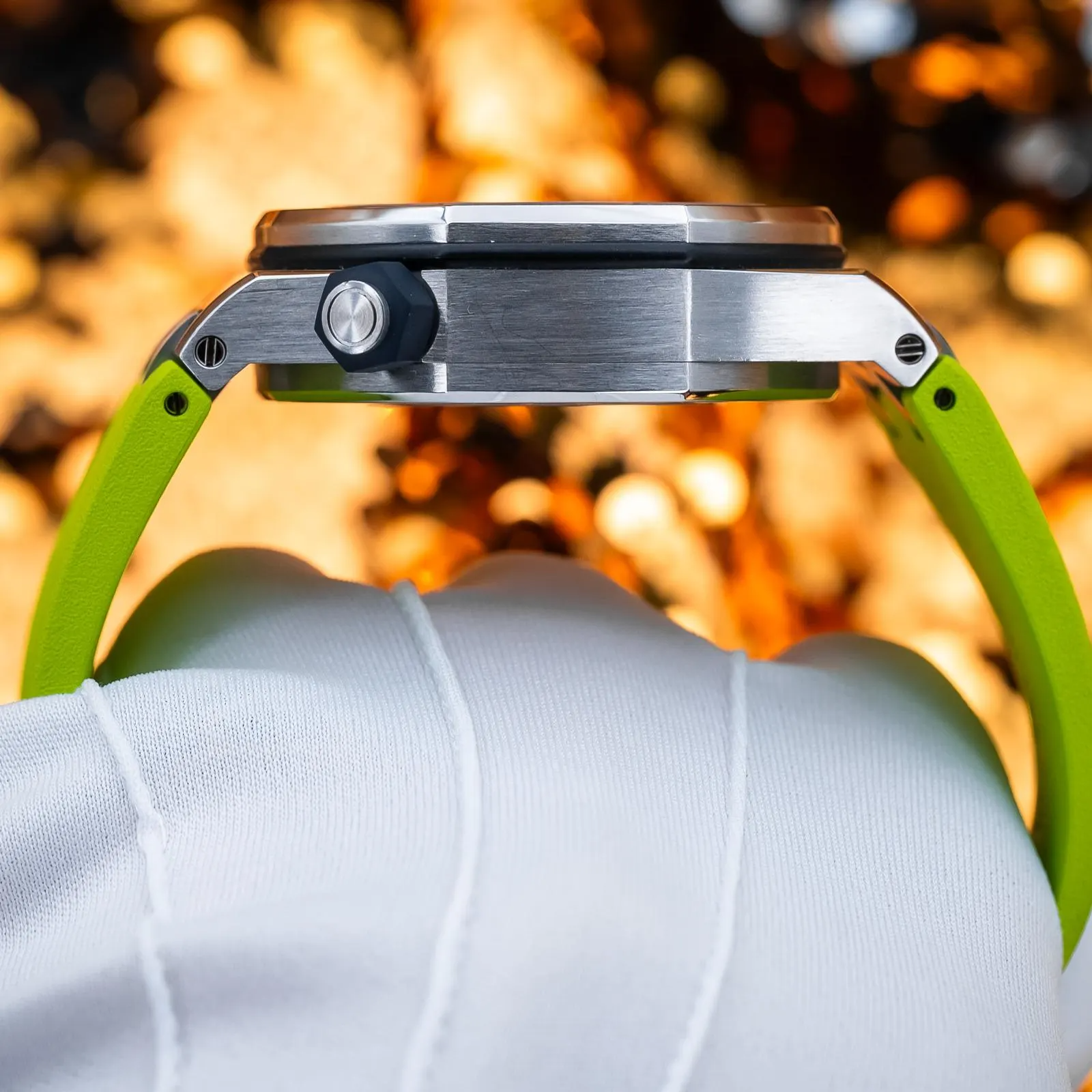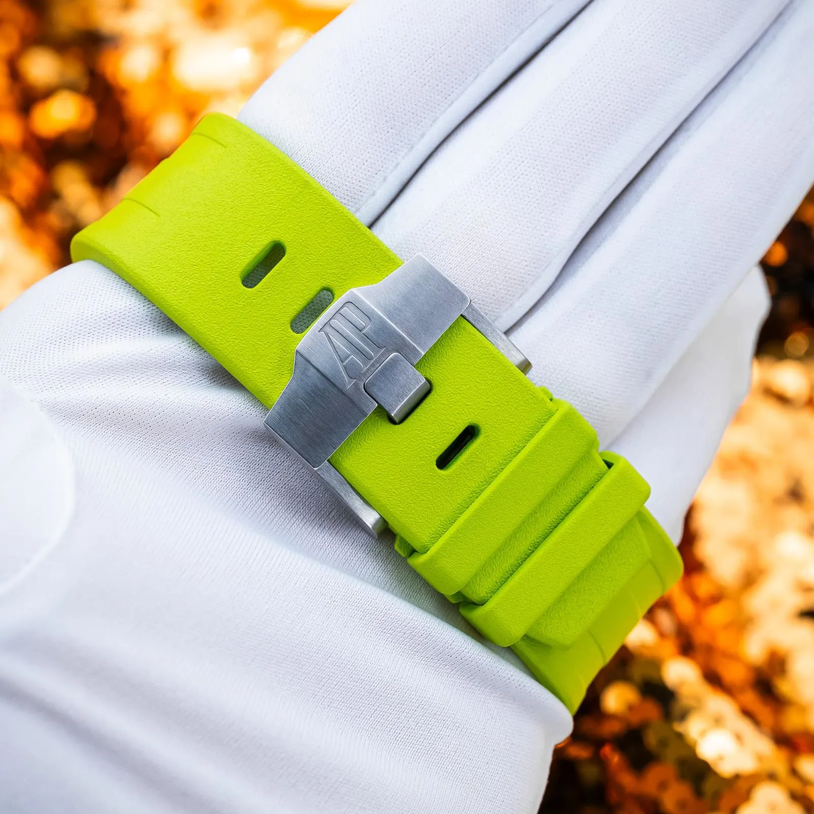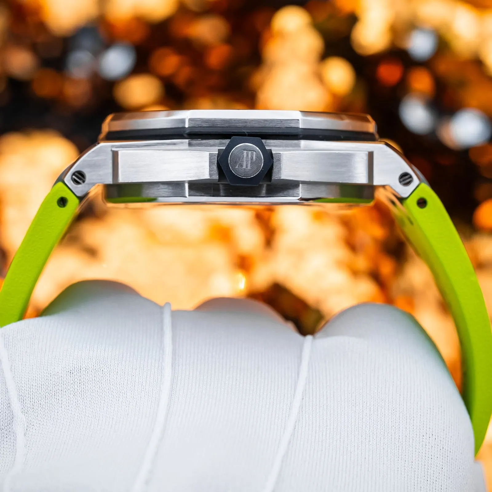 Green dial with “Méga Tapisserie” pattern, white gold applied hour-markers and Royal Oak hands with luminescent coating, blue rotating inner bezel with diving scale and zone from 60 to 15 minutes in yellow green.