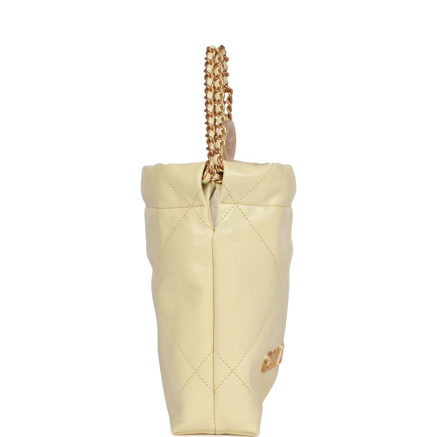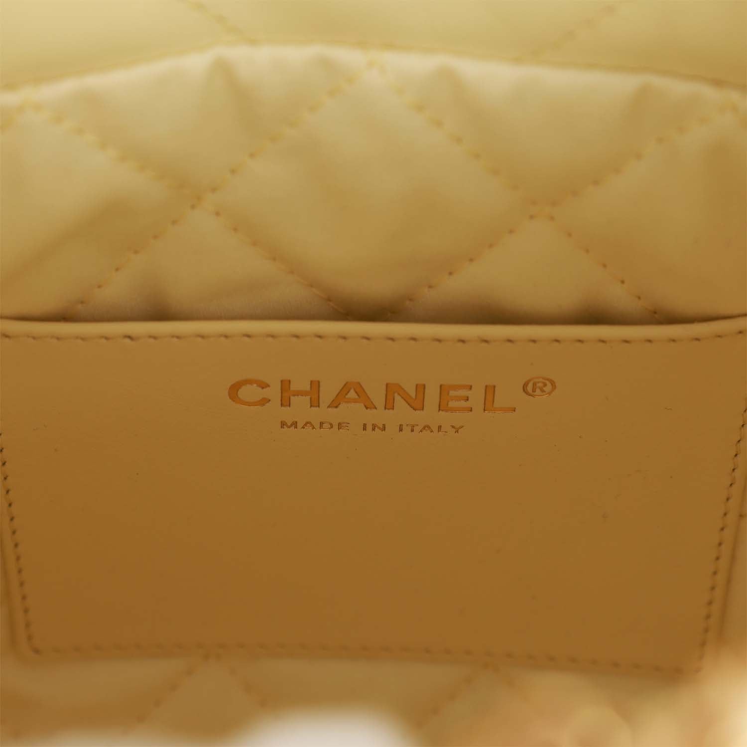 This mini 22?hobo bag in?yellow calfskin with?gold tone hardware and has the signature diamond quilting, CHANEL on the front in gold metal, and long?gold tone and?yellow leather interwoven chain.