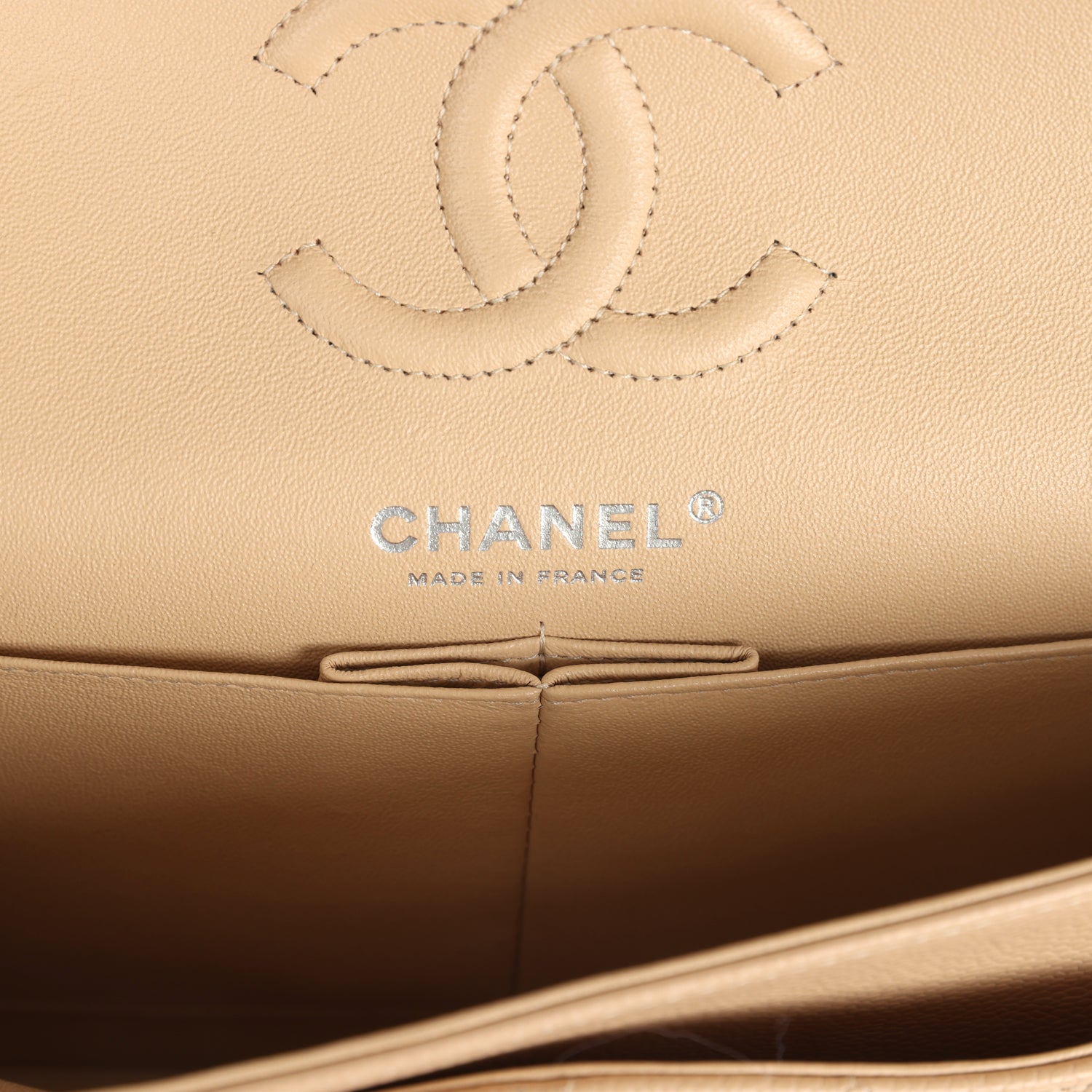 The interior is lined in beige leather with the "love letter" zipper compartment underneath the first flap, an "outer" slit pocket under the second flap, and an interior compartment with two open pockets separated by a "lipstick" compartment.