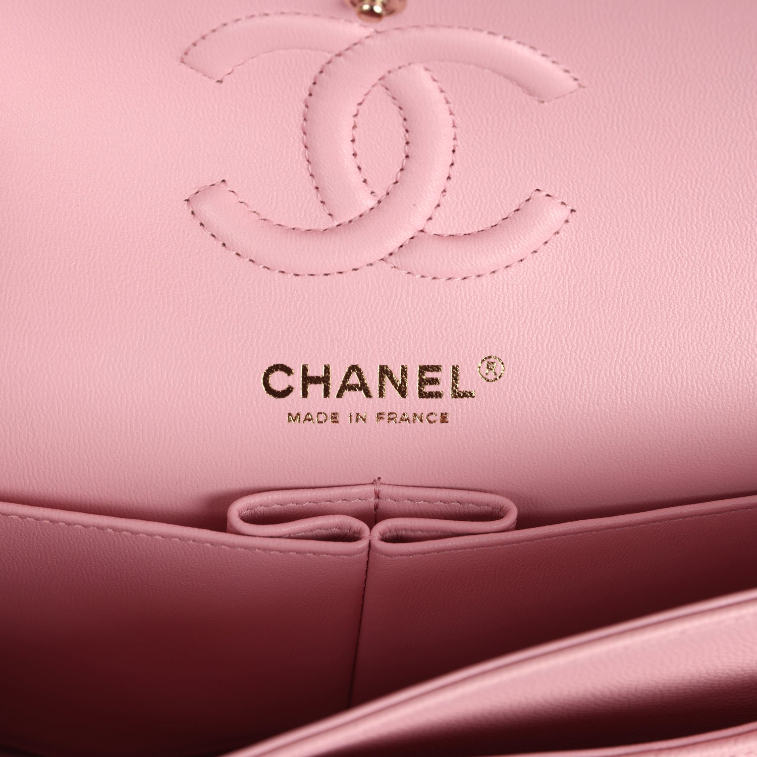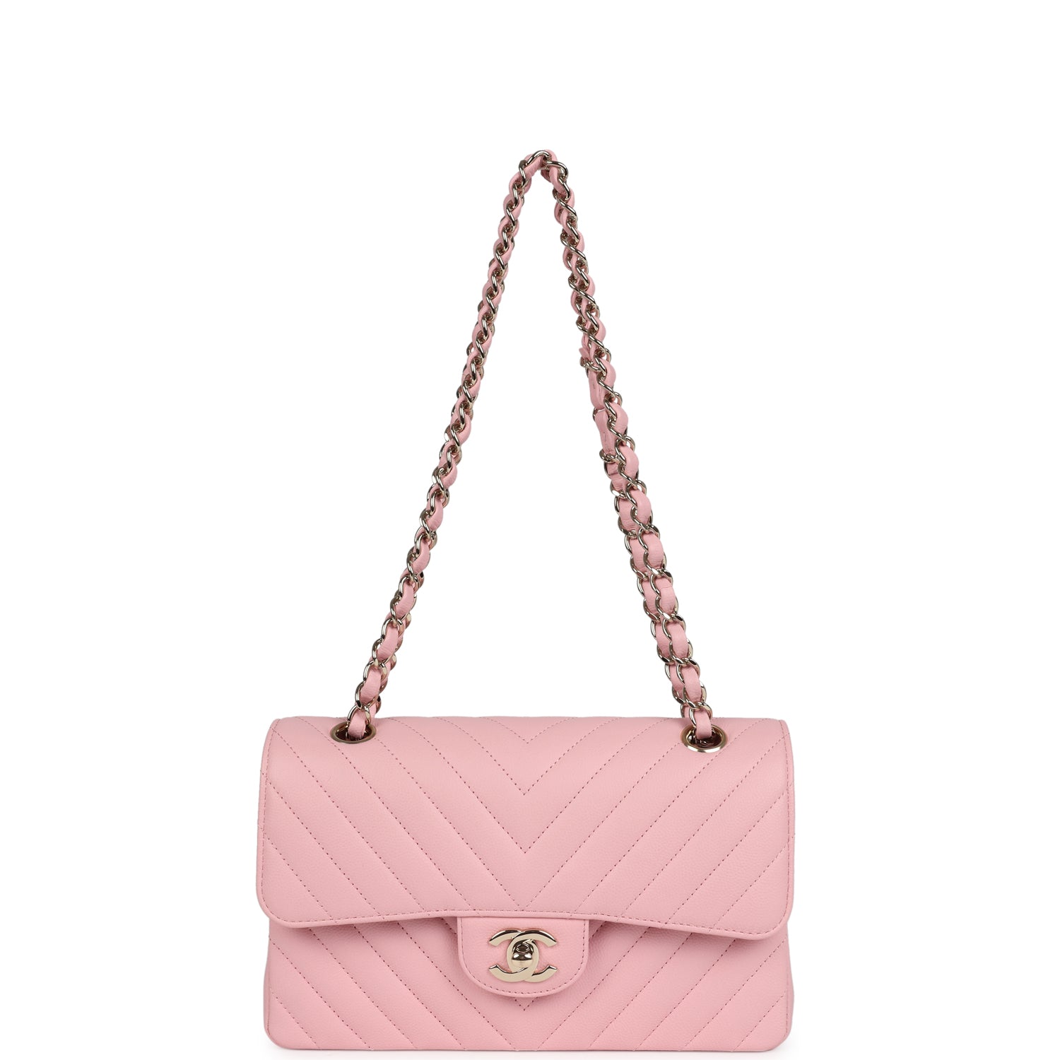 This small Classic Chevron Double Flap bag is in light pink caviar leather with light gold tone hardware and features a front flap with signature CC turnlock closure, chevron quilted leather, half moon back pocket, and adjustable interwoven light gold tone chain link and Light Pink leather shoulder/crossbody strap.