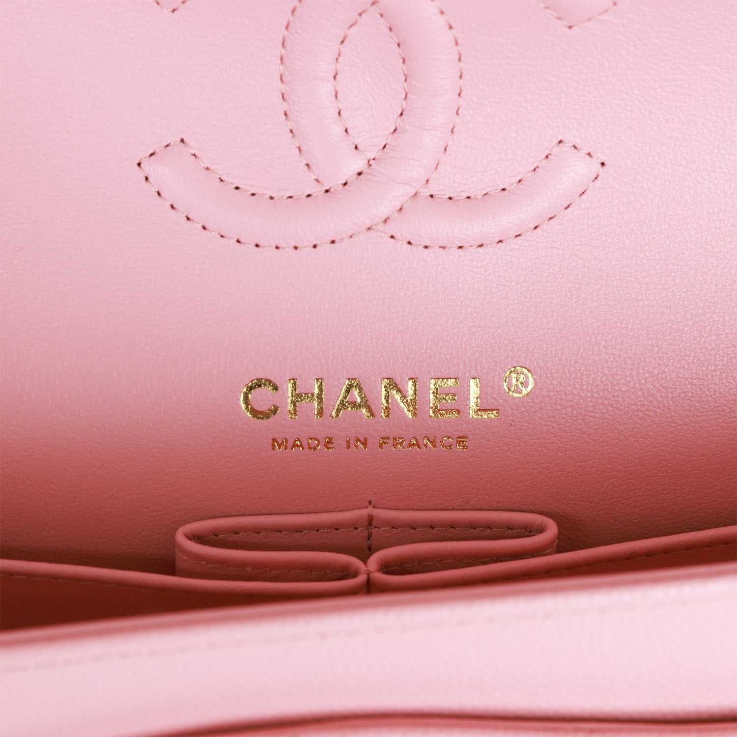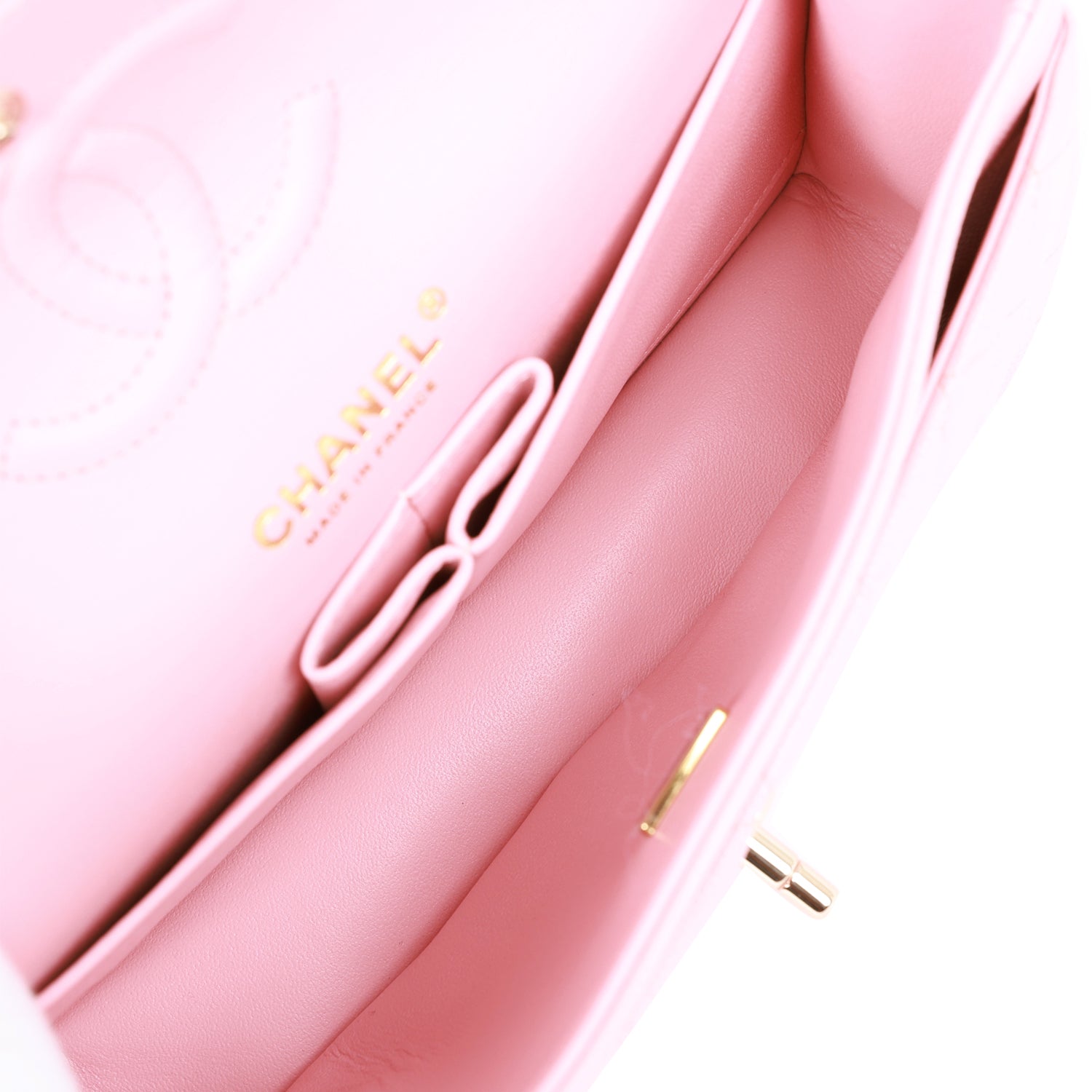 The interior is lined in?pink leather with the "love letter" zipper compartment underneath the first flap,?an "outer" slit pocket under the second flap, and an interior compartment with two open pockets separated by a "lipstick" compartment.
