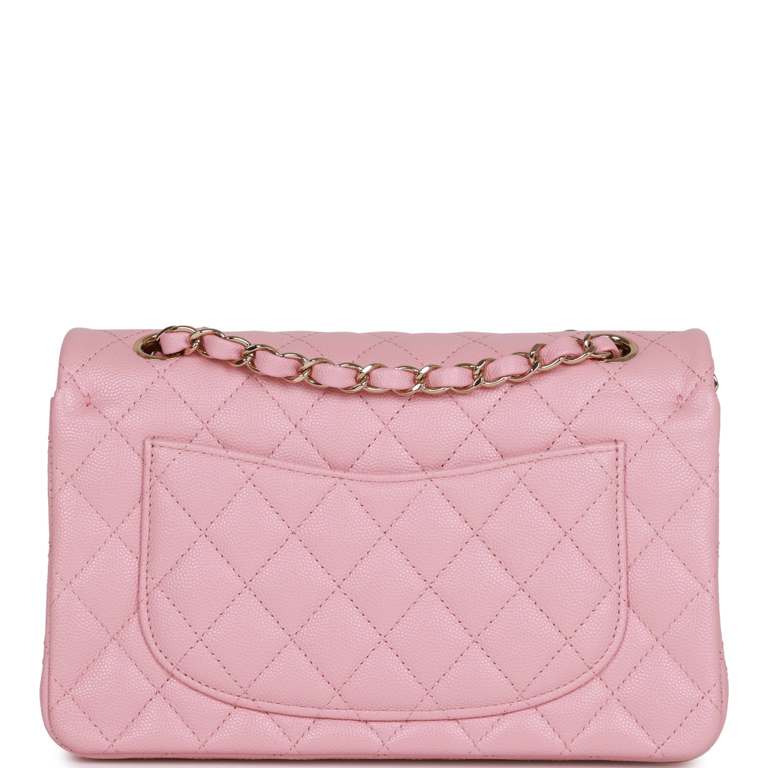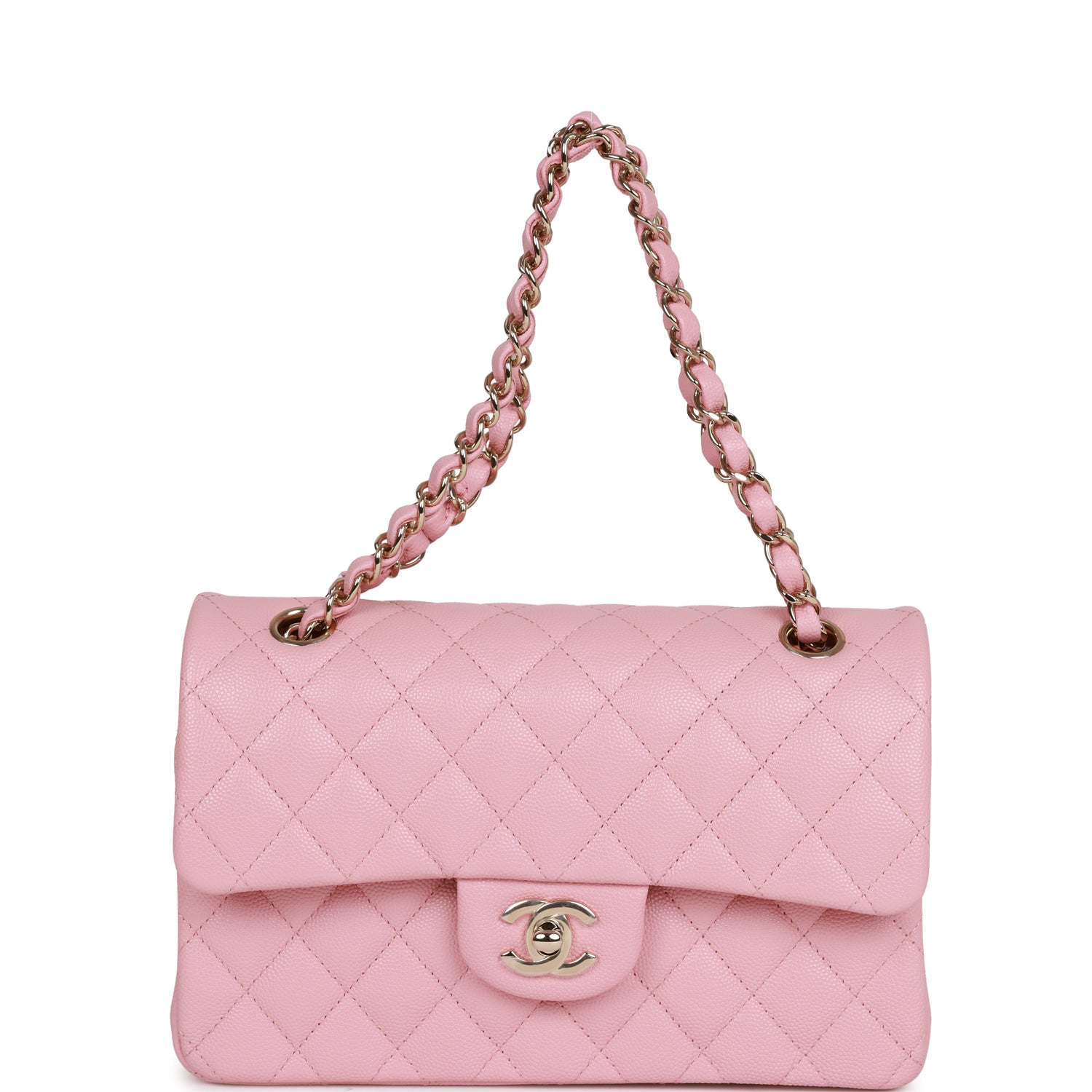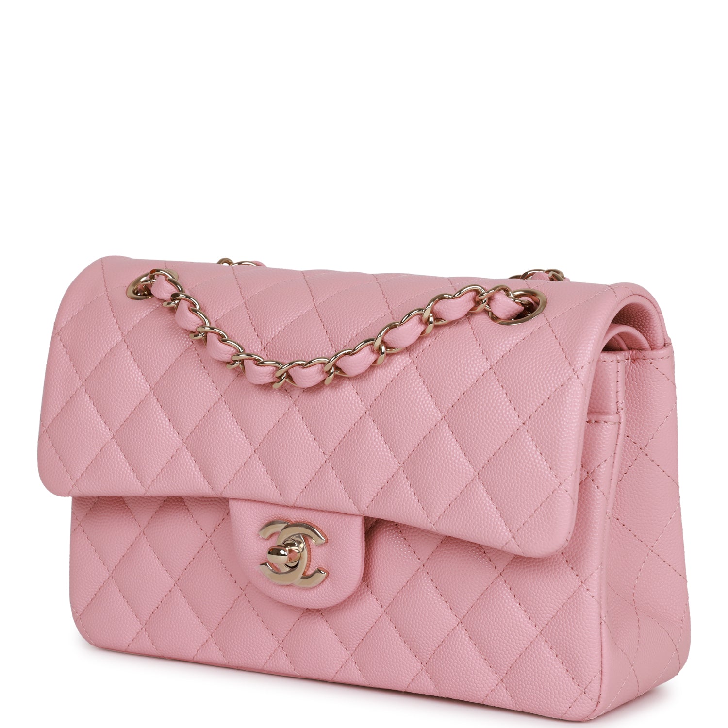 This Small Classic Flap Bag is in pink caviar leather with light gold hardware and features a front flap with CC turnlock closure, halfmoon back pocket and adjustable interwoven light gold tone chain link and pink leather shoulder/crossbody strap.