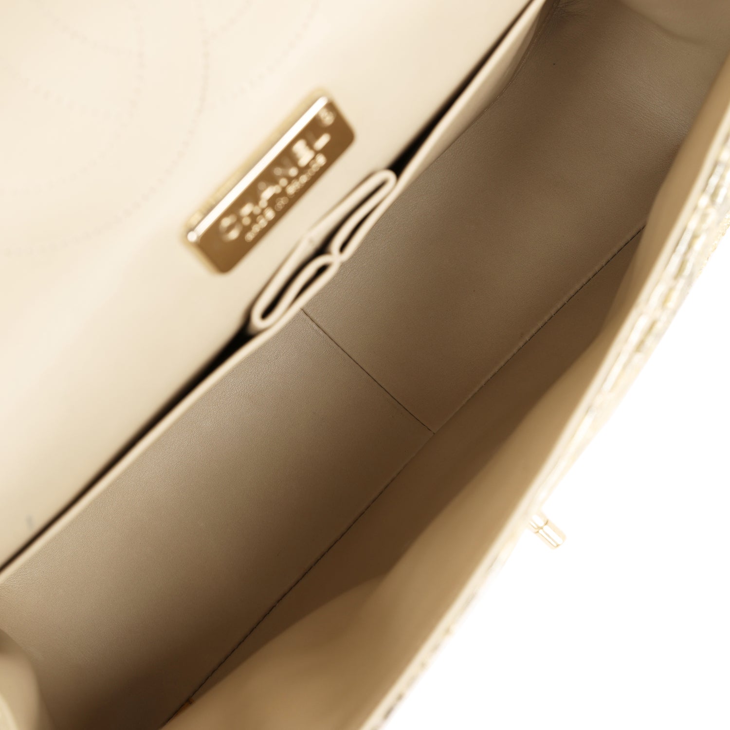 The interior is lined in?beige leather with the "love letter" zipper compartment underneath the first flap,?an "outer" slit pocket under the second flap, and an interior compartment with two open pockets separated by a "lipstick" compartment.