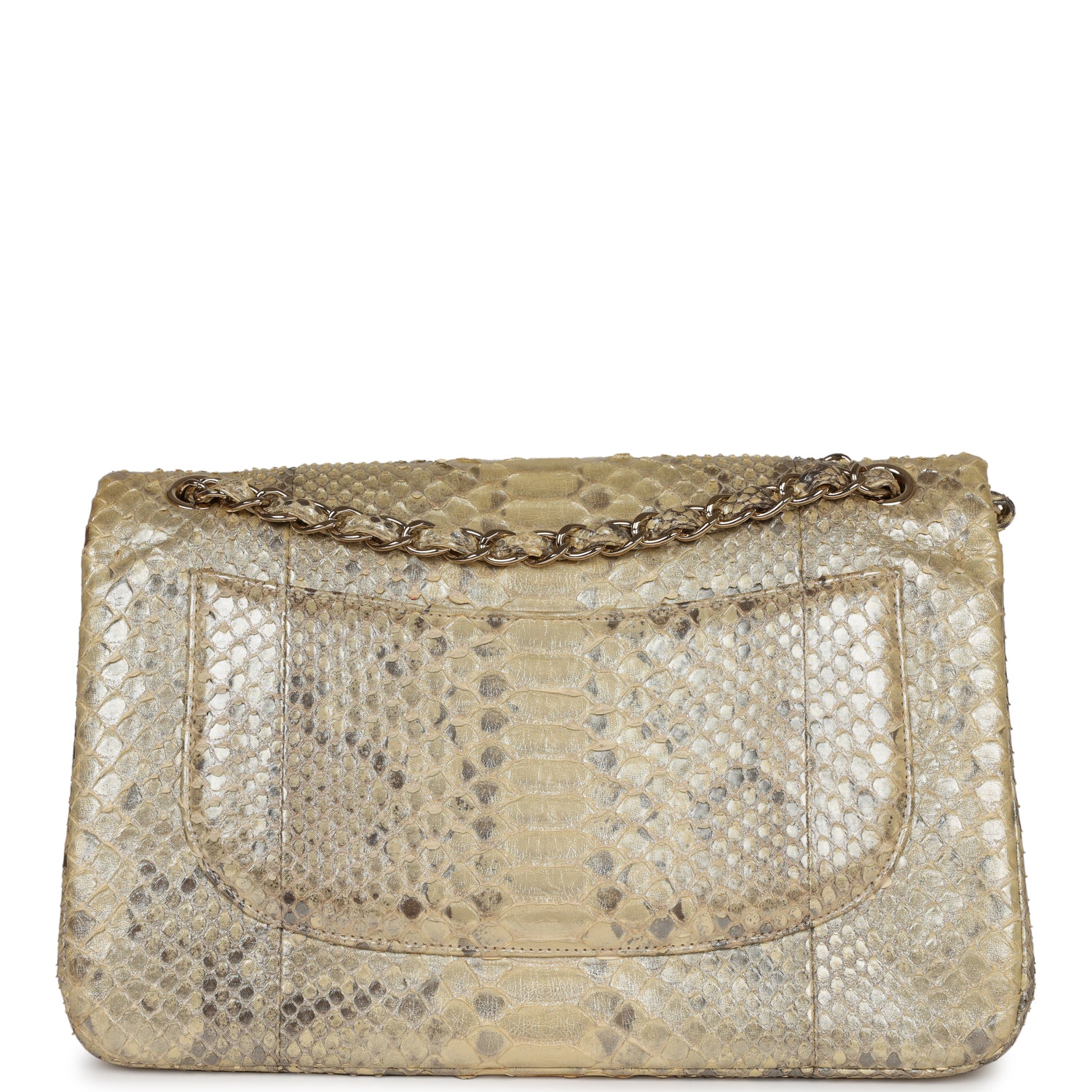 This Chanel Jumbo Classic Double Flap bag in Gold metallic python?leather with gold tone hardware, front flap with CC turnlock closure, half moon back pocket and adjustable interwoven gold tone chain link and gold python leather shoulder/crossbody strap.