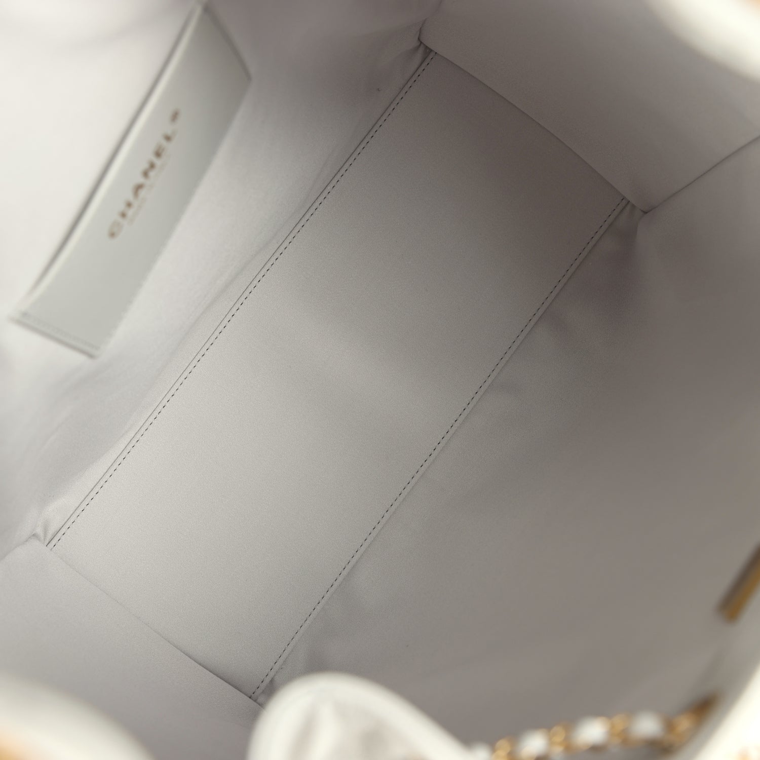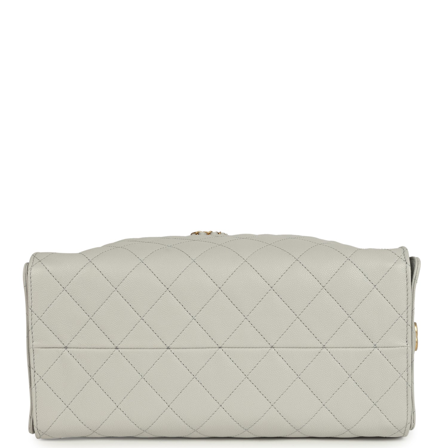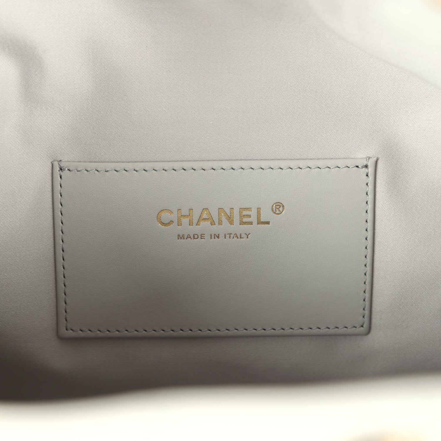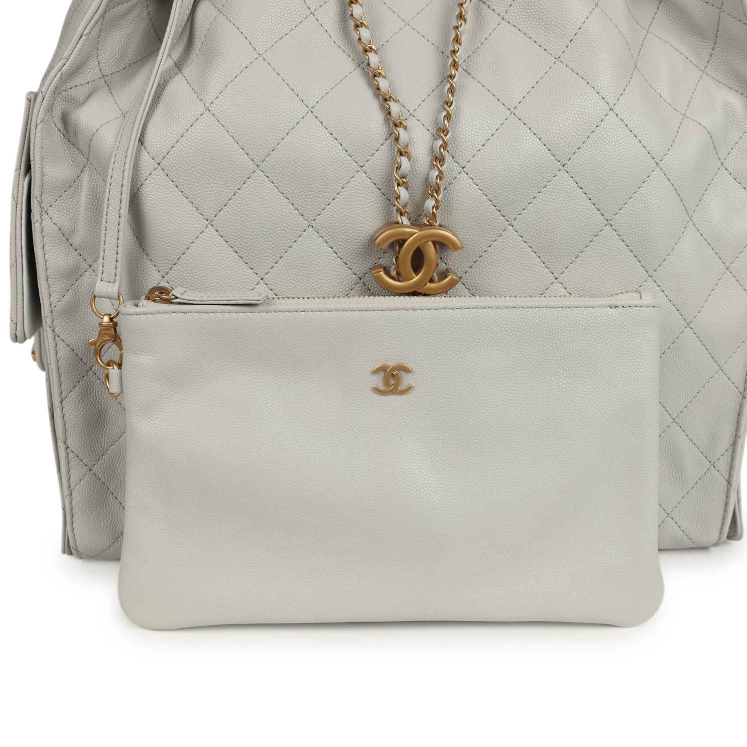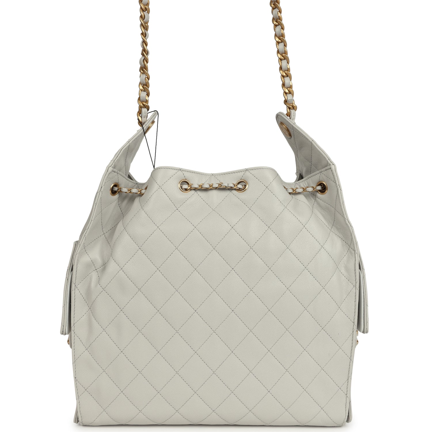 This Chanel Medium 25 Hobo Bag is in light grey?caviar leather with antique gold hardware, features signature diamond quilt, two exterior side pockets, drawstring closure, a removable pouch, and a single interwoven antique gold and light grey leather shoulder strap.