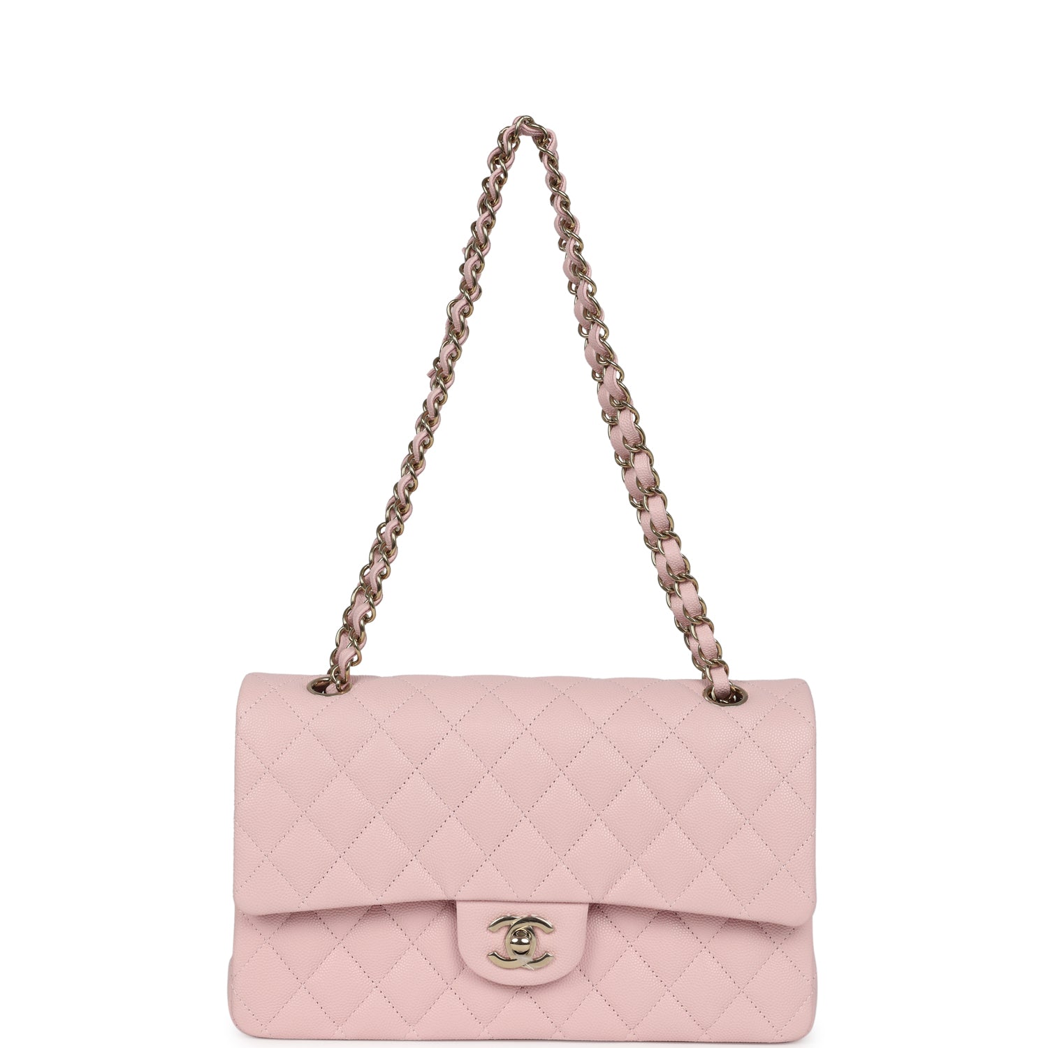 This Medium Classic Double Flap bag is in light pink caviar leather with light gold tone hardware and features a front flap with signature CC turnlock closure, half moon back pocket, and adjustable interwoven light gold tone chain link and light pink leather shoulder strap.