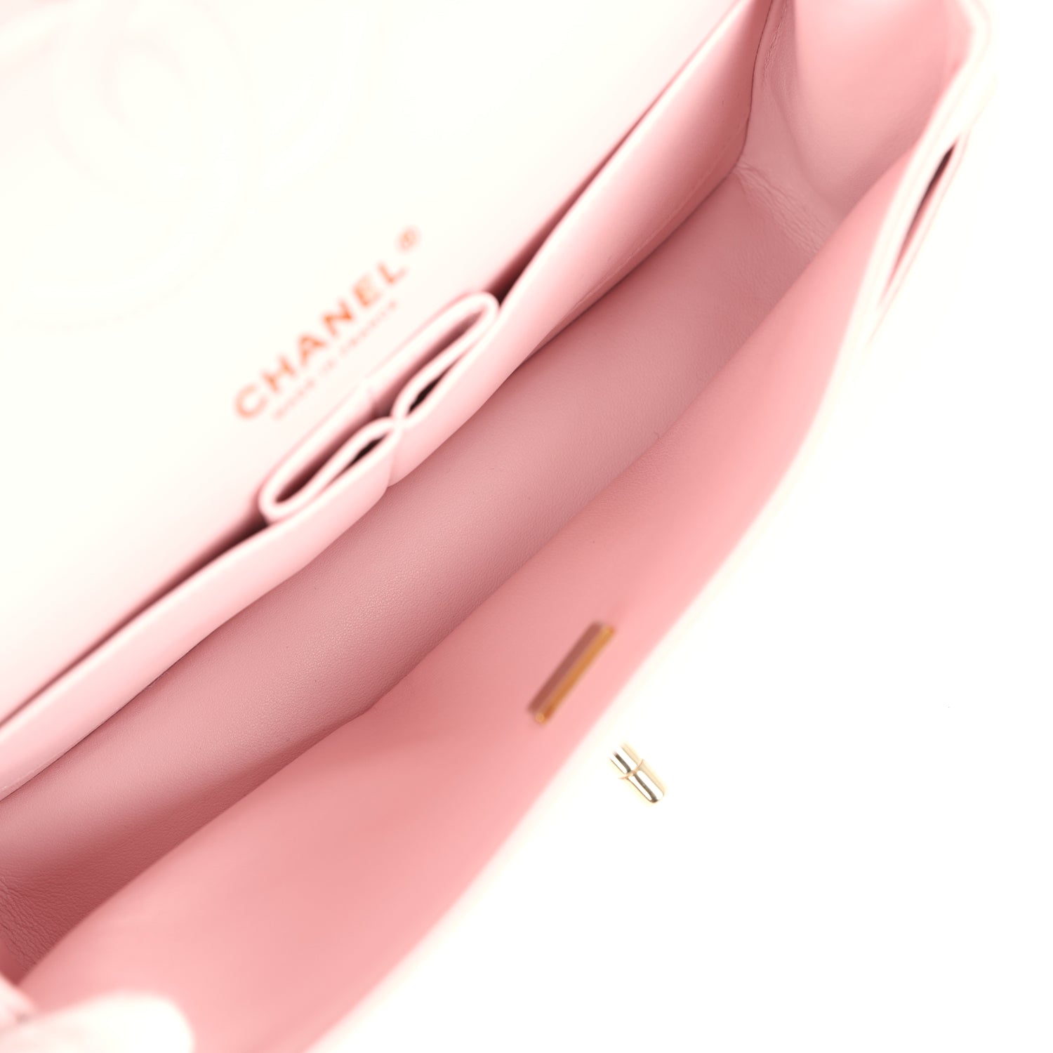 The interior is lined in light pink leather with the "love letter" zipper compartment underneath the first flap, an "outer" slit pocket under the second flap, and an interior compartment with two open pockets separated by a "lipstick" compartment.