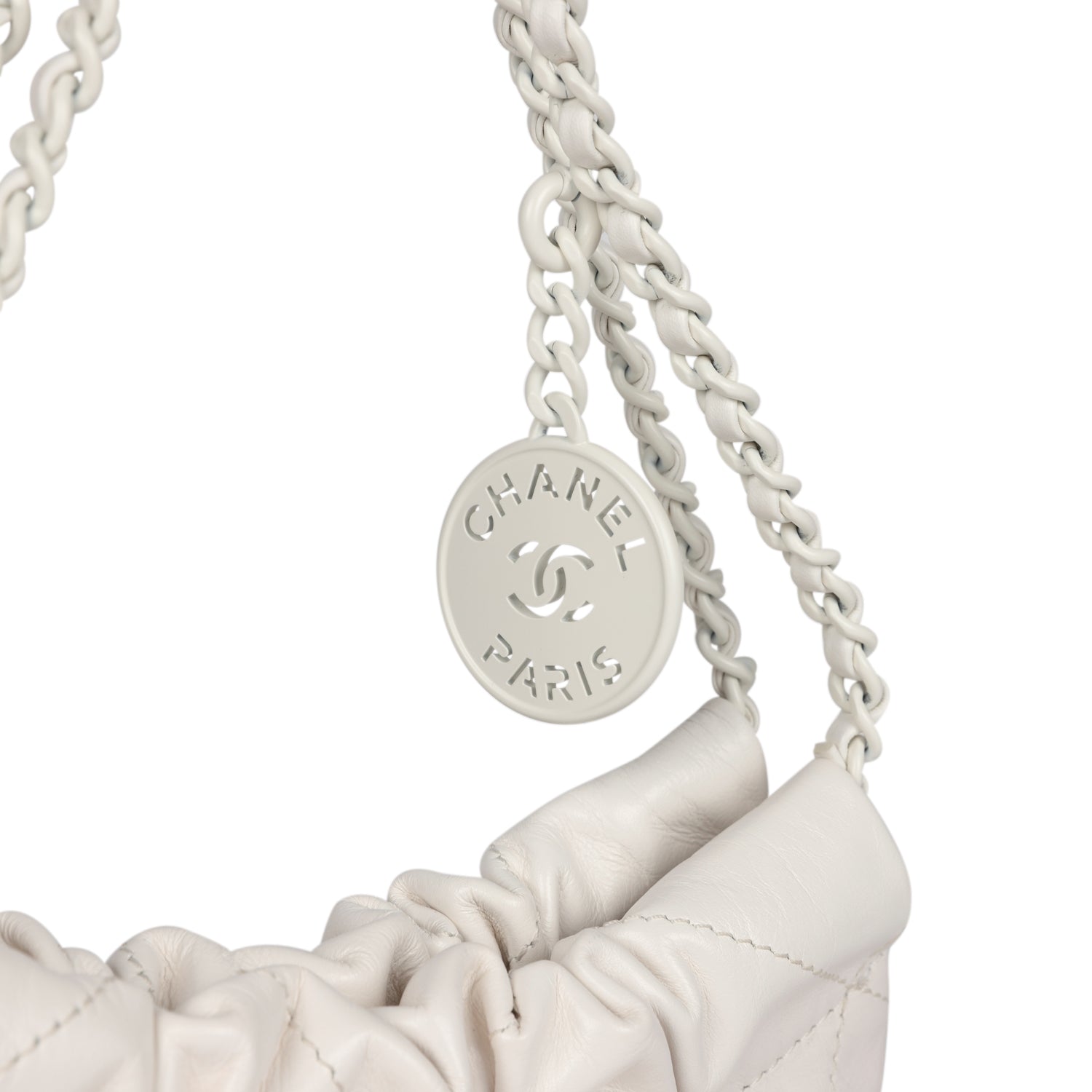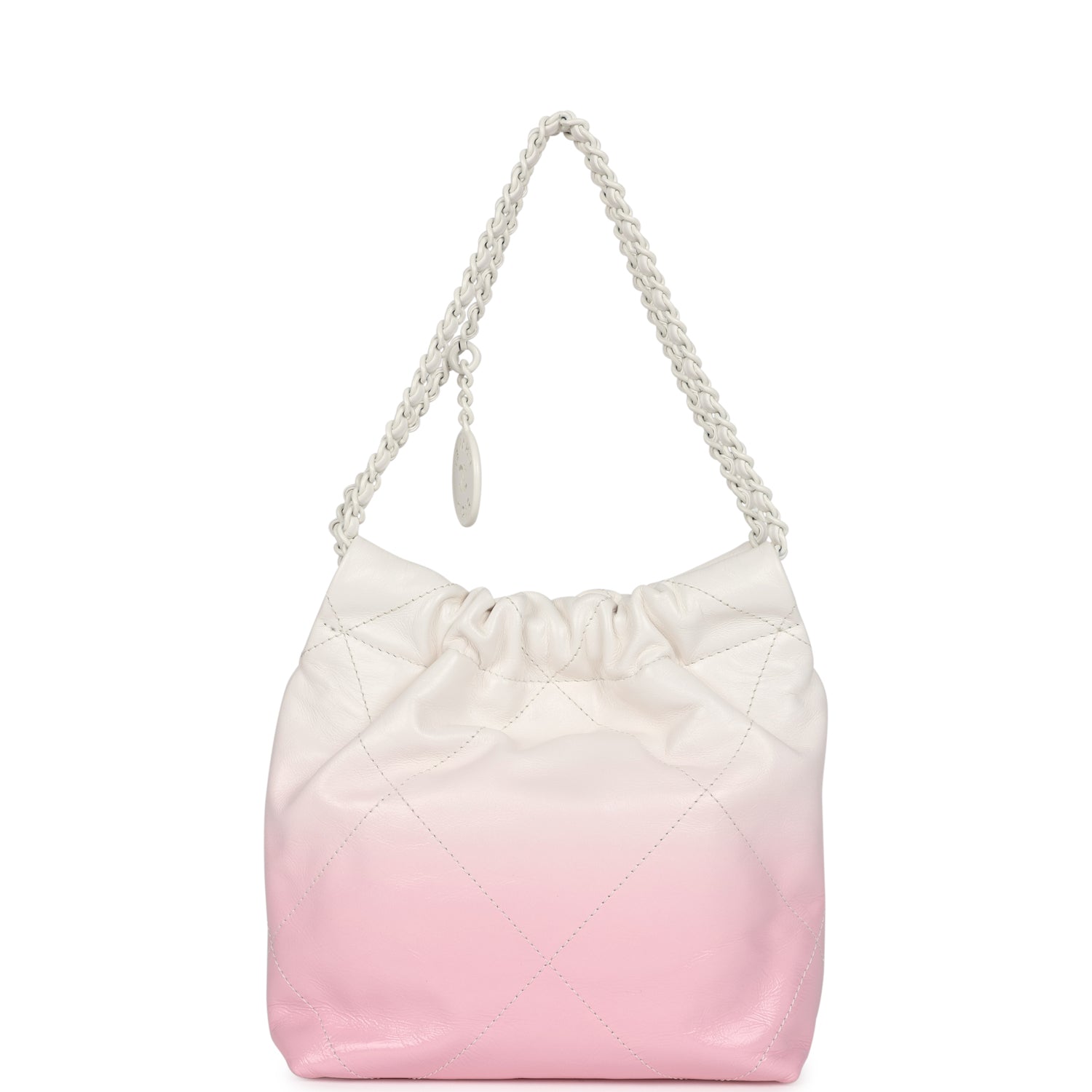 This Mini 22 Hobo Bag is in white and pink ombre patent calfskin leather with white lacquered metal hardware, has the signature diamond quilt with large tonal white stitching, white lacquered metal "Chanel" logo on front of bag, Chanel Paris metal hang tag, interwoven chain link with white/silver metal, and white leather shoulder straps and one long leather cord.