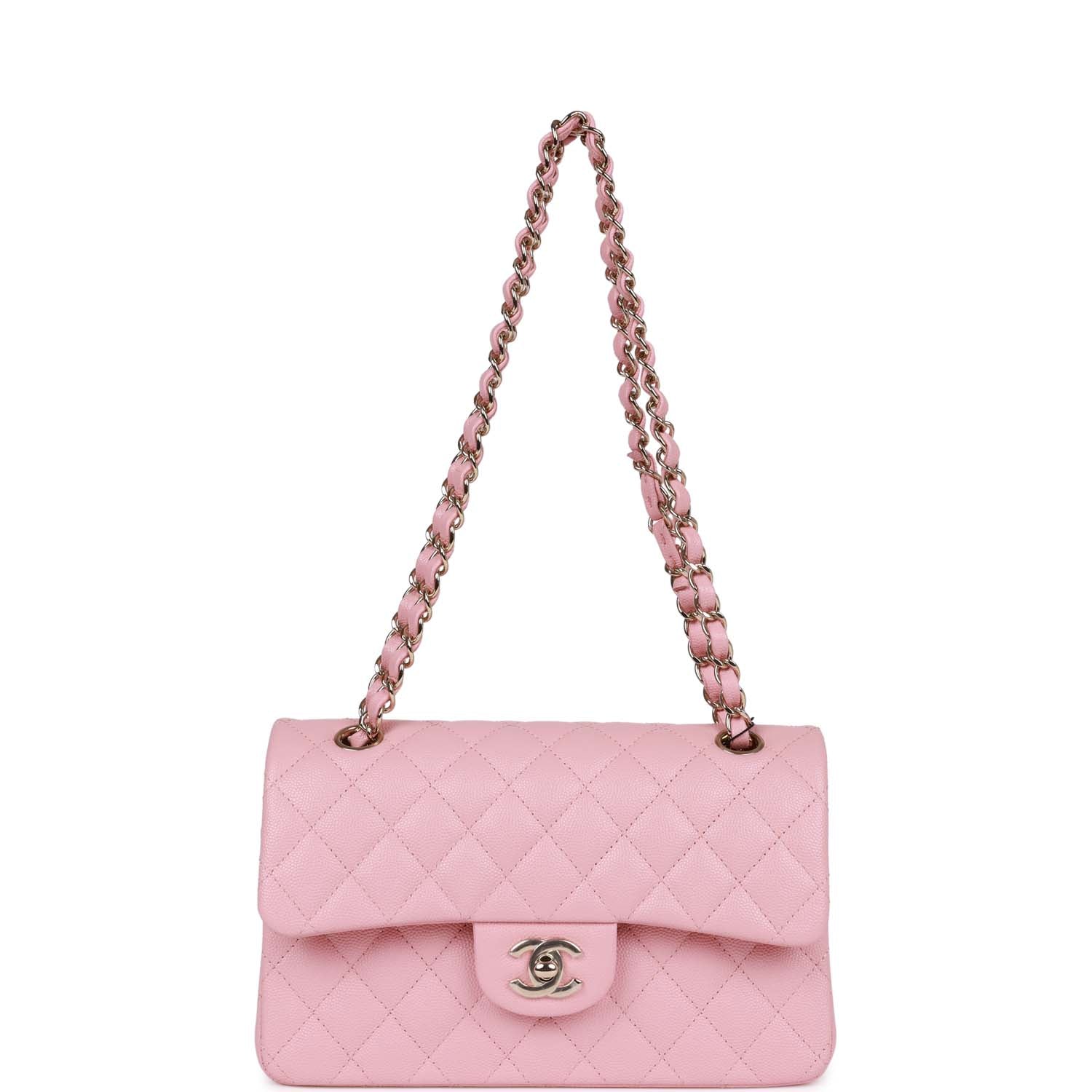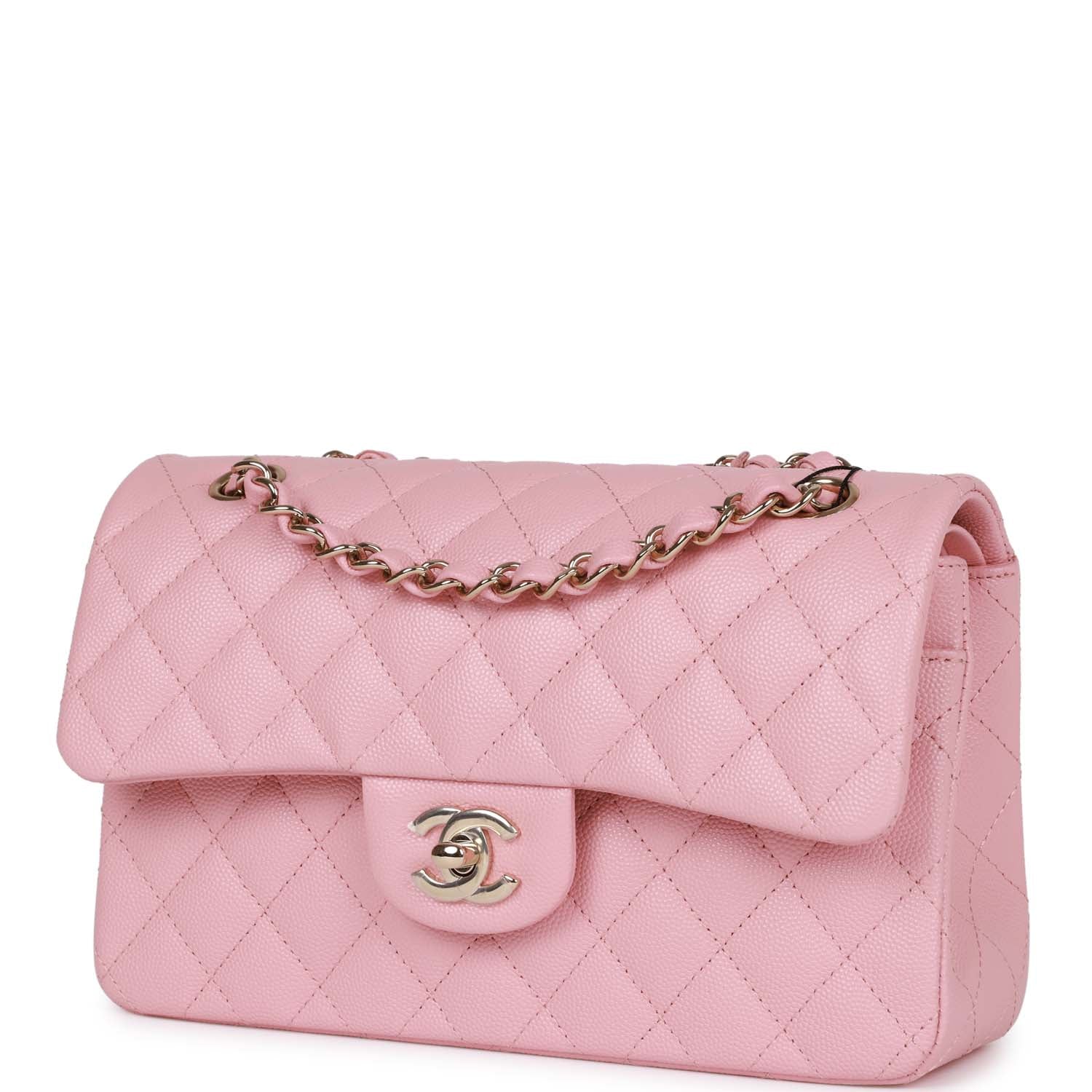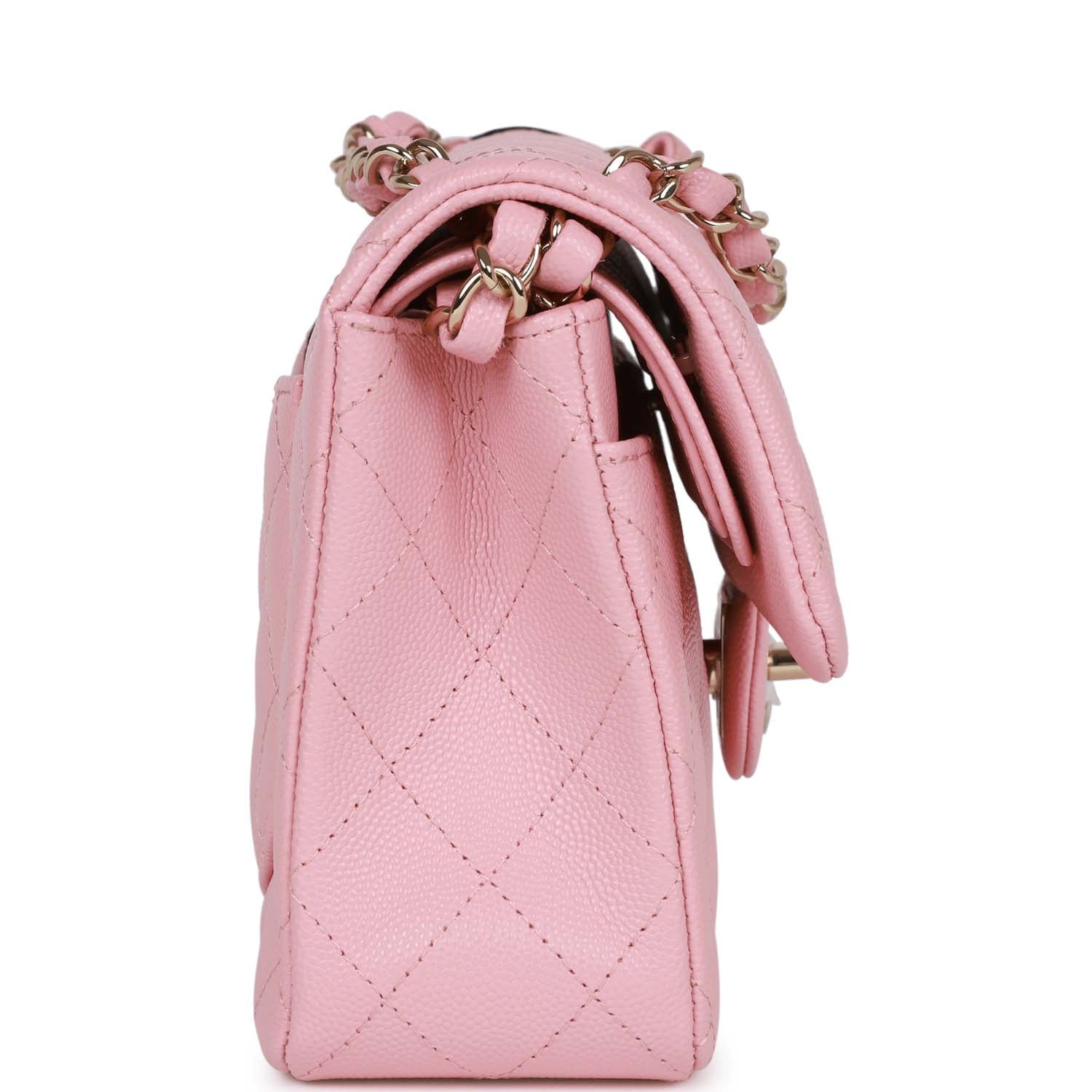 This Chanel Small Classic Flap Bag is in pink caviar leather with light gold hardware and features a front flap with CC turnlock closure, halfmoon back pocket and adjustable interwoven light gold tone chain link and pink leather shoulder/crossbody strap.