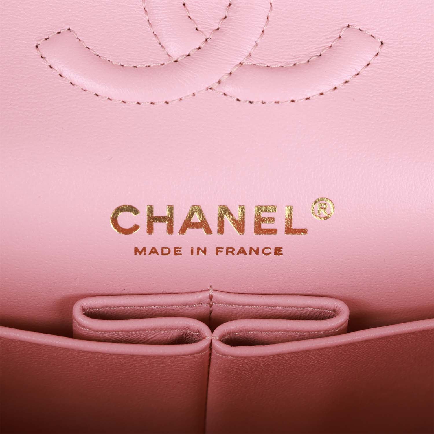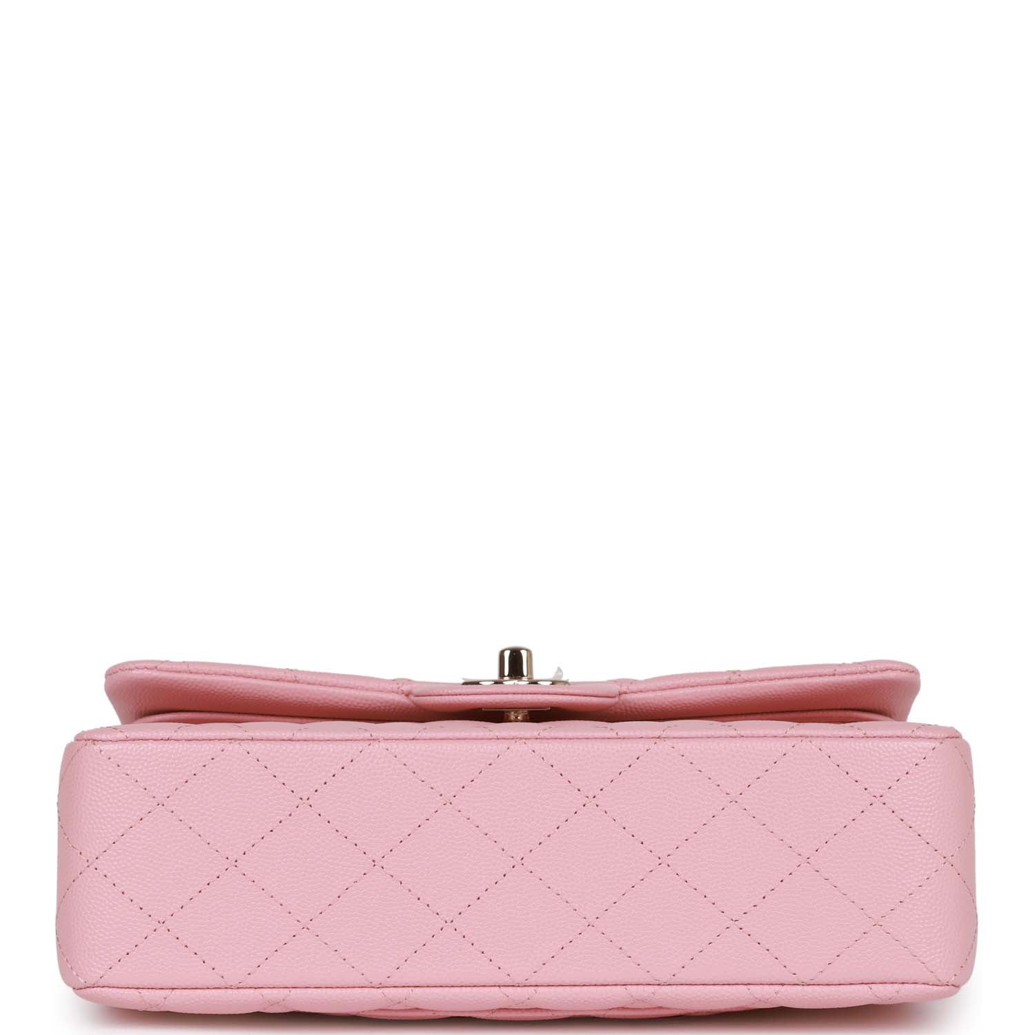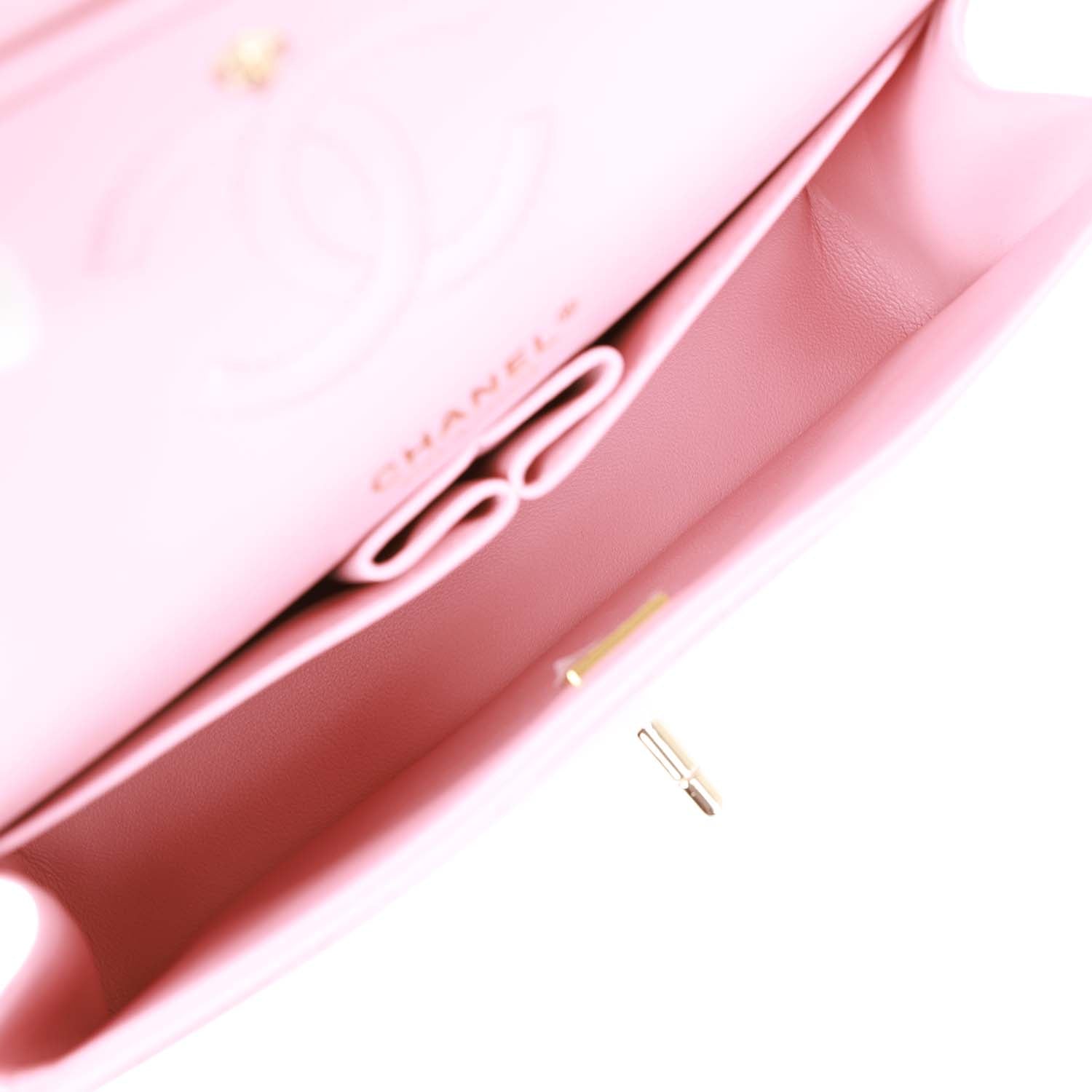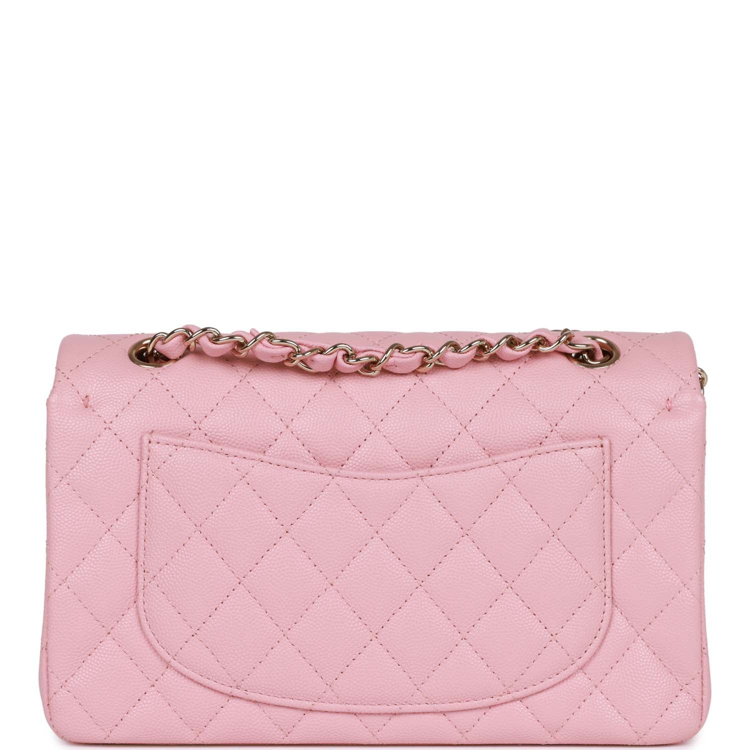 This Chanel Small Classic Flap Bag is in pink caviar leather with light gold hardware and features a front flap with CC turnlock closure, halfmoon back pocket and adjustable interwoven light gold tone chain link and pink leather shoulder/crossbody strap.
