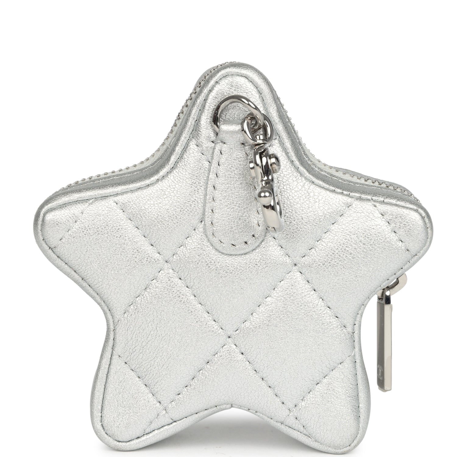 This Chanel Walk Of Fame Star Clip-On Coin Purse is in metallic silver goatskin leather with silver hardware, featuring tonal stitching, signature diamond quilt, CC logo on the front, a zip closure and silver clip clasp with the option to hook onto another bag or use as a charm.