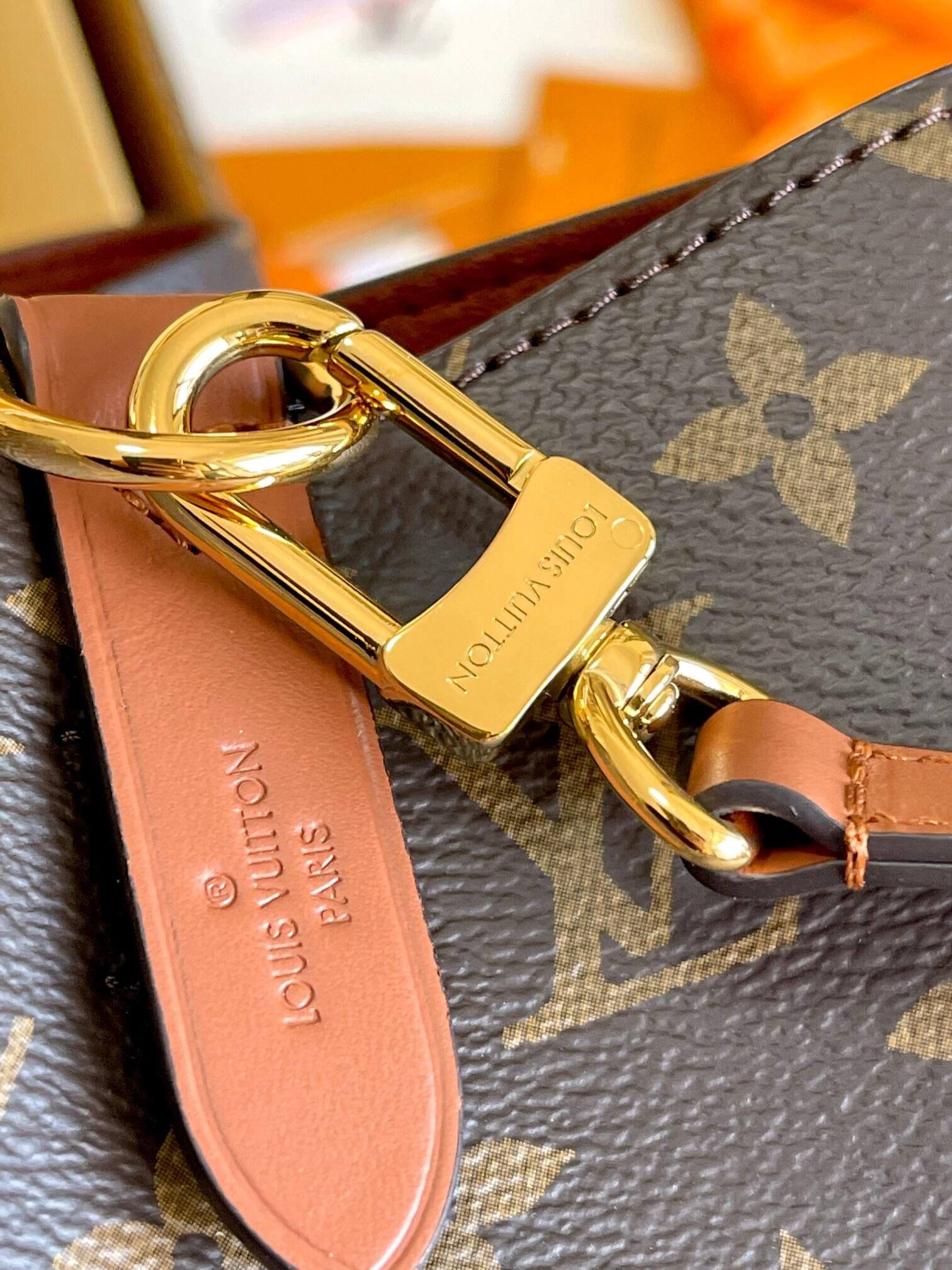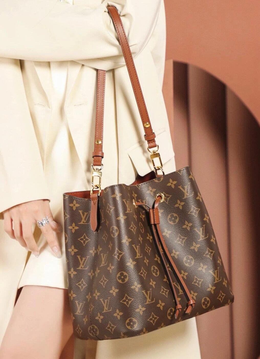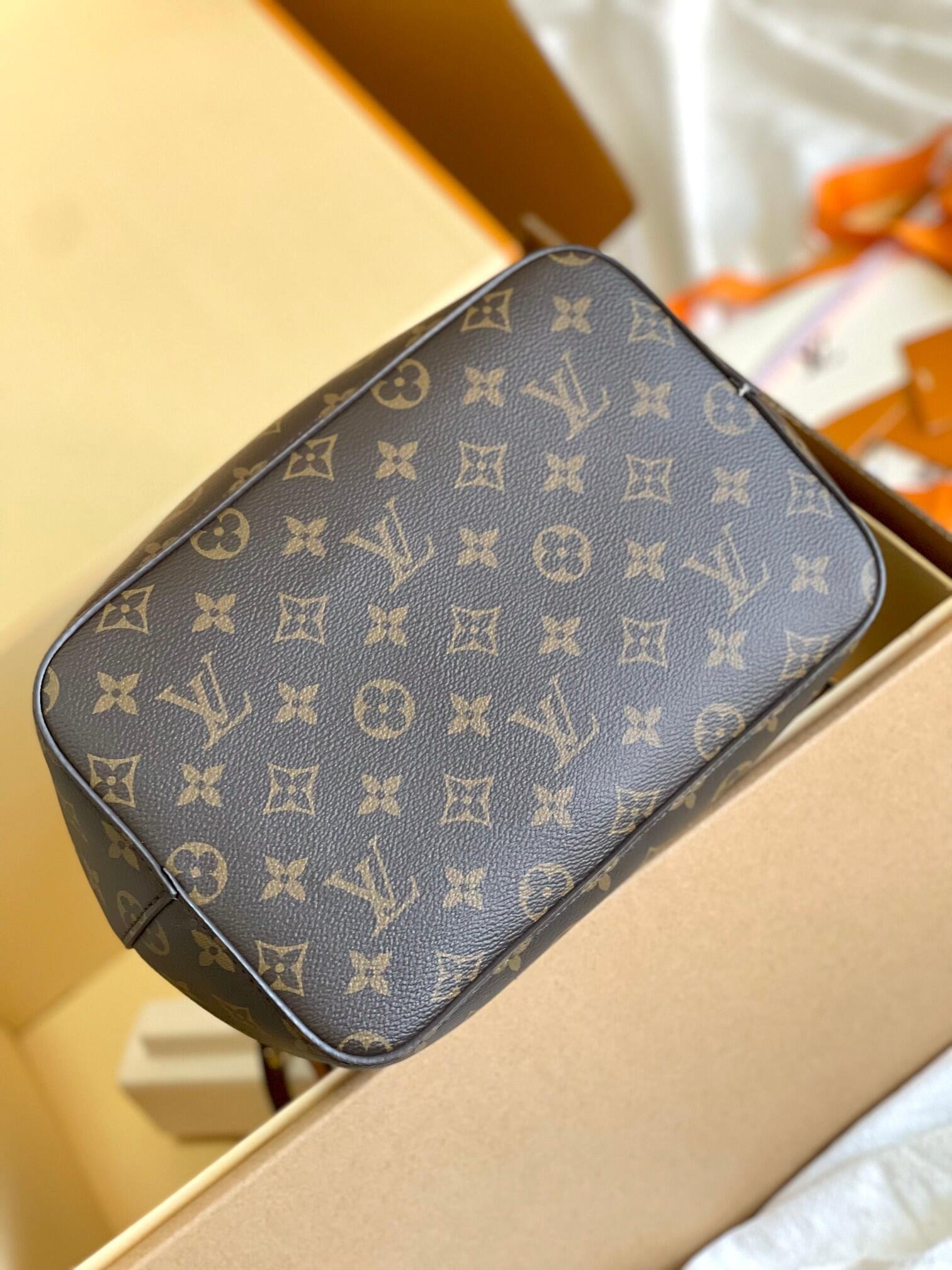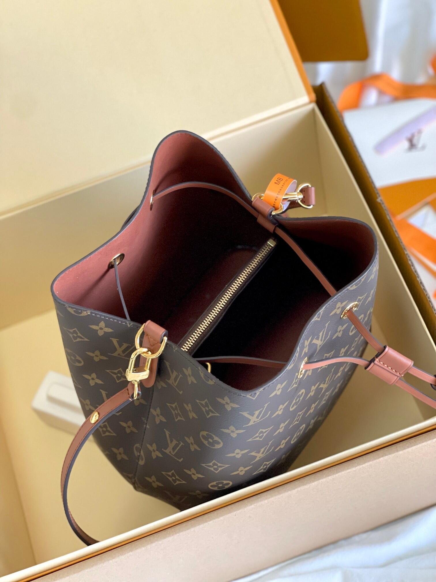 A true House icon, the NéoNoé bucket bag revisits a 1932 design by Gaston-Louis Vuitton. The original was created to transport bottles of Champagne in style; this modern version in Monogram canvas features a sleek shape, colorful leather trim and a matching bonded lining. The adjustable smart strap can be slung over the shoulder or lengthened for a trendy cross-body carry.