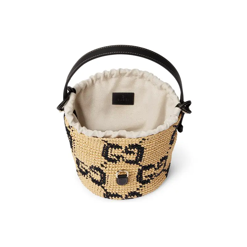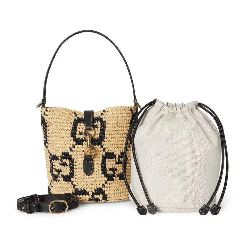 Materials, textures and patterns combine to create a warm-weather feel throughout the Cruise 2025 collection. This mini bag is presented in natural and black raffia-effect fabric and features an allover GG pattern.