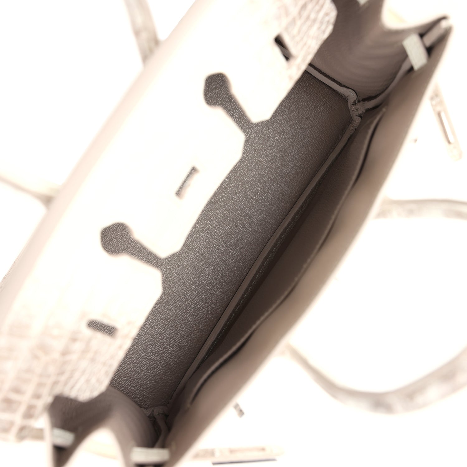 The interior is lined with Gris Tourterelle chevre and has one zip pocket with an Hermès engraved zipper pull and an open pocket on the opposite side.