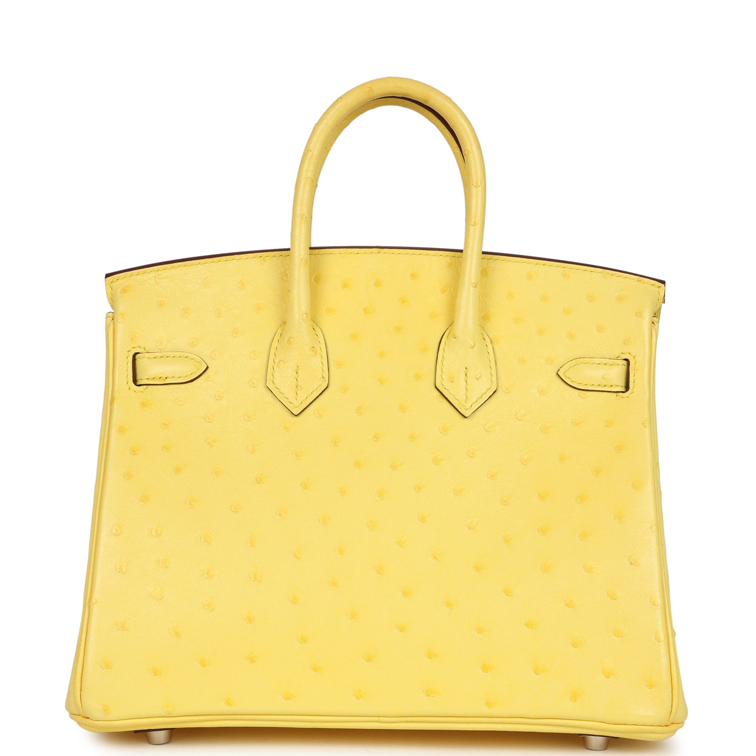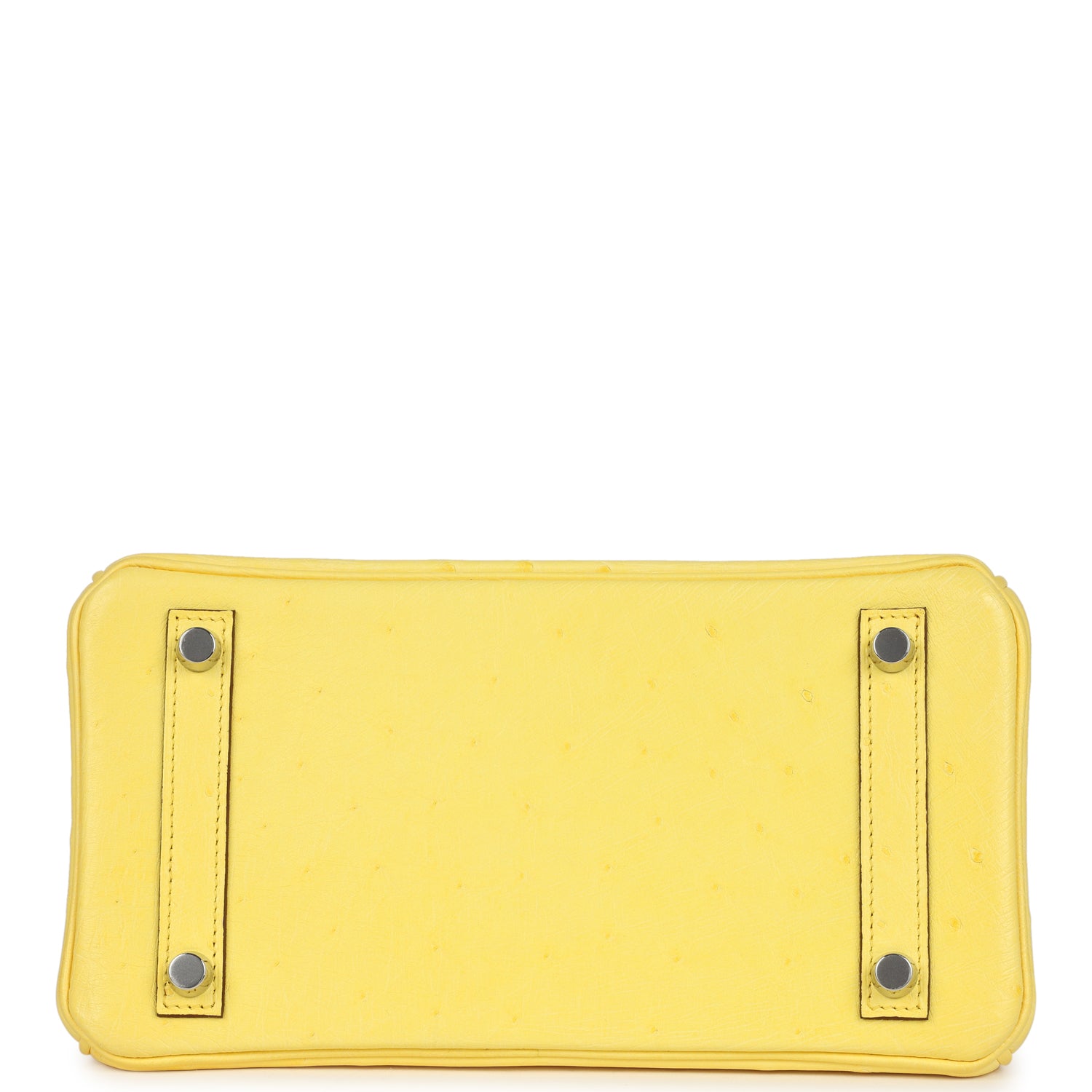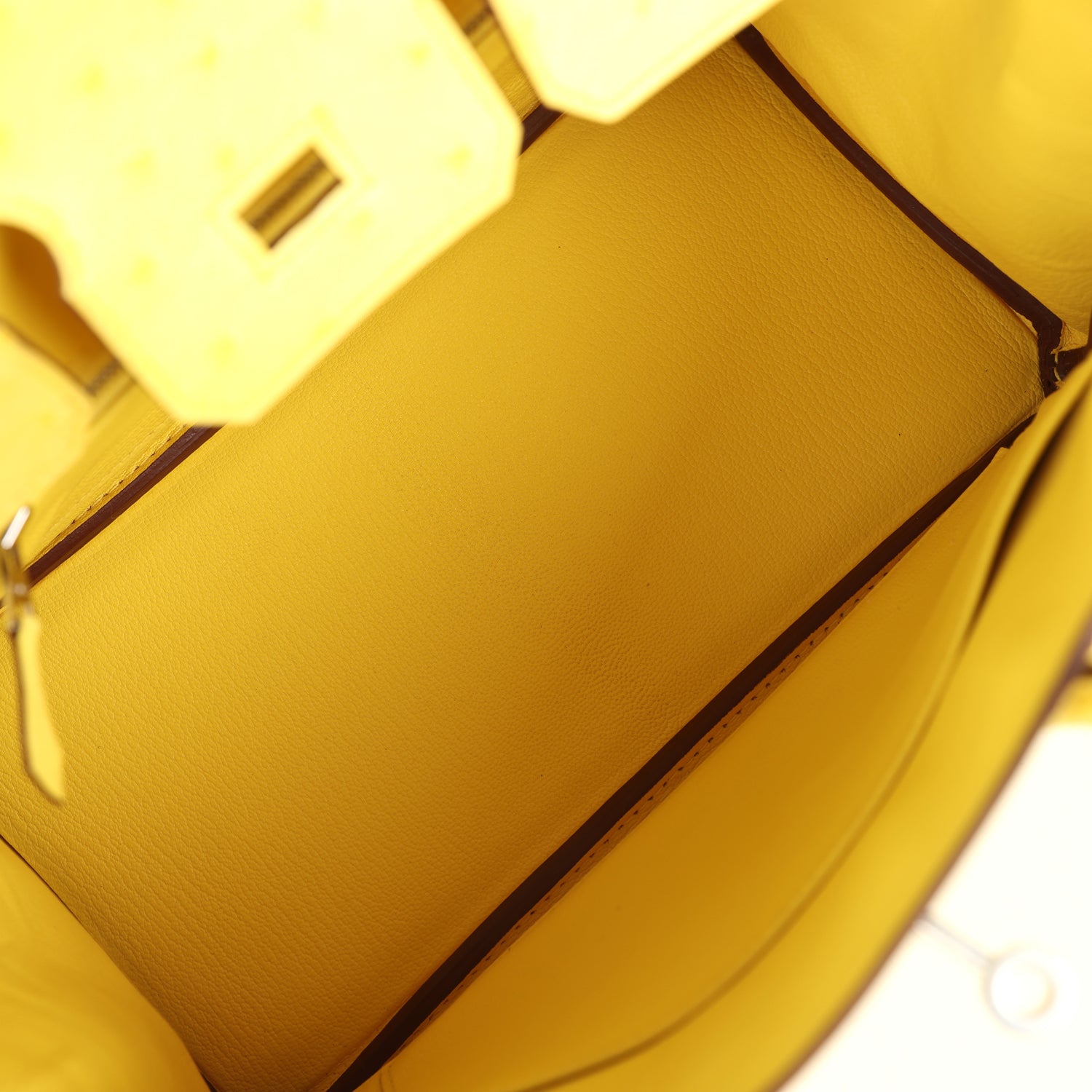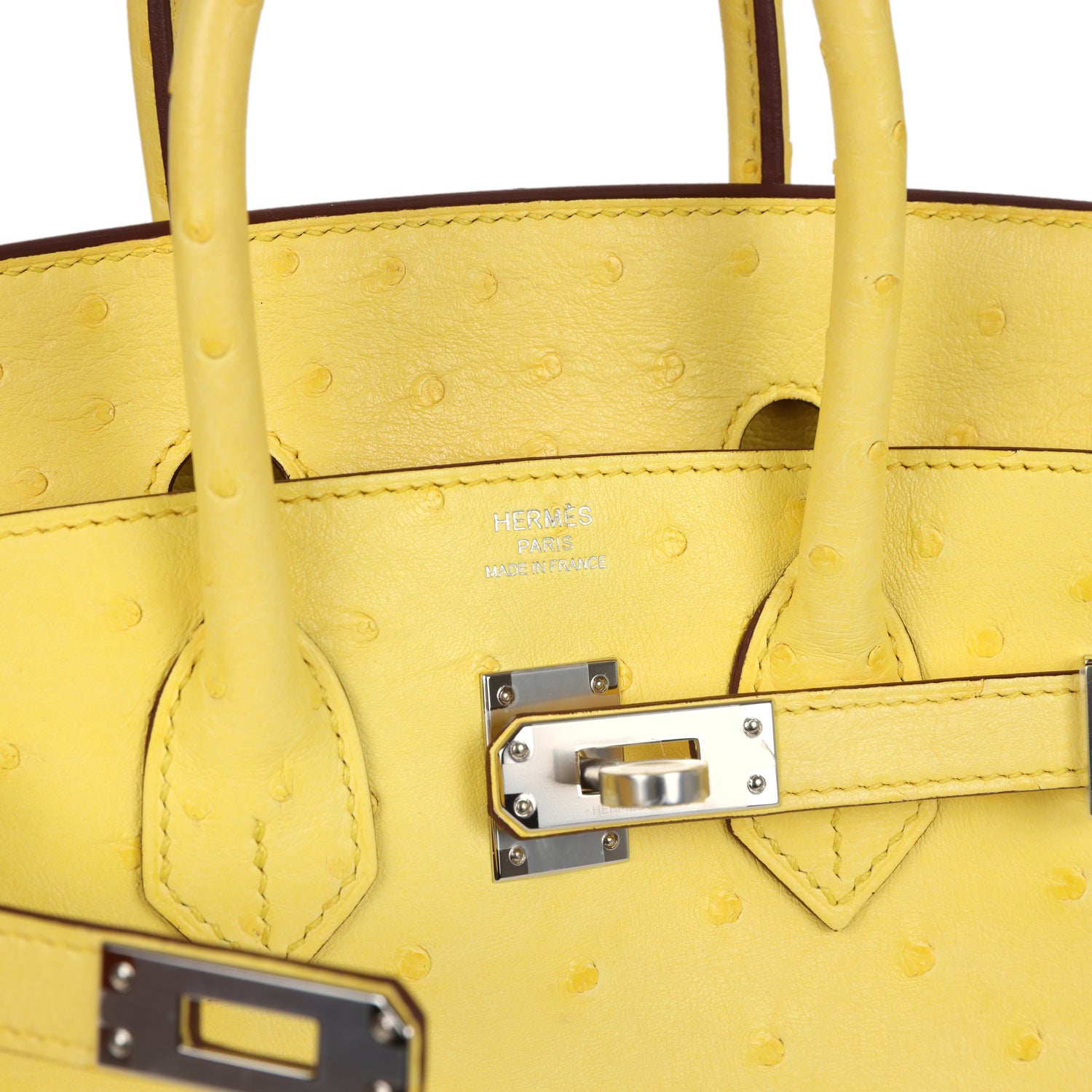 This Birkin is in Jaune Citron Ostrich leather with palladium hardware, tonal stitching, front flap with two straps, front toggle closure, clochette with lock and two keys, and two rolled handles.