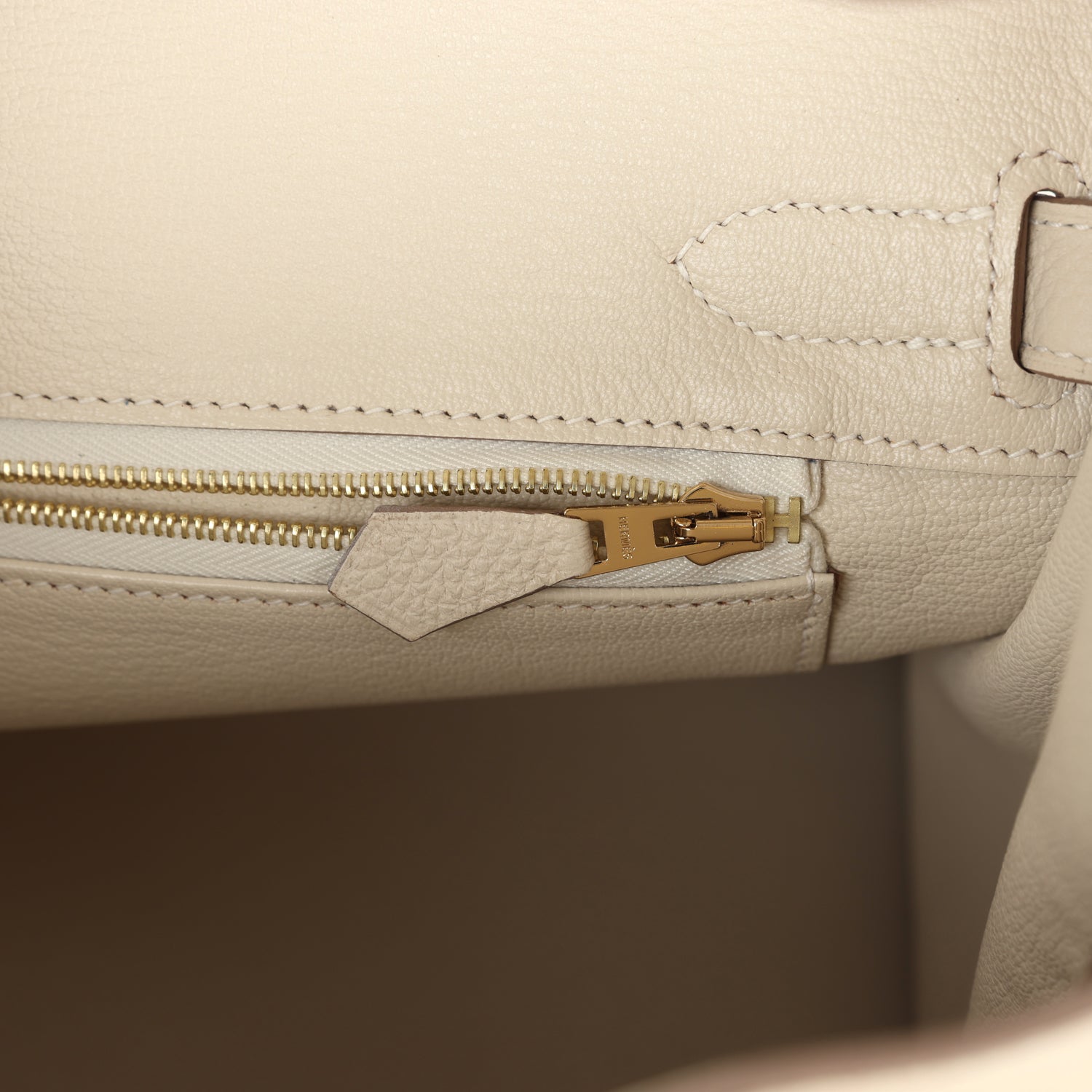 The interior is lined with Craie chevre and has one zip pocket with an Hermes engraved zipper pull and an open pocket on the opposite side.