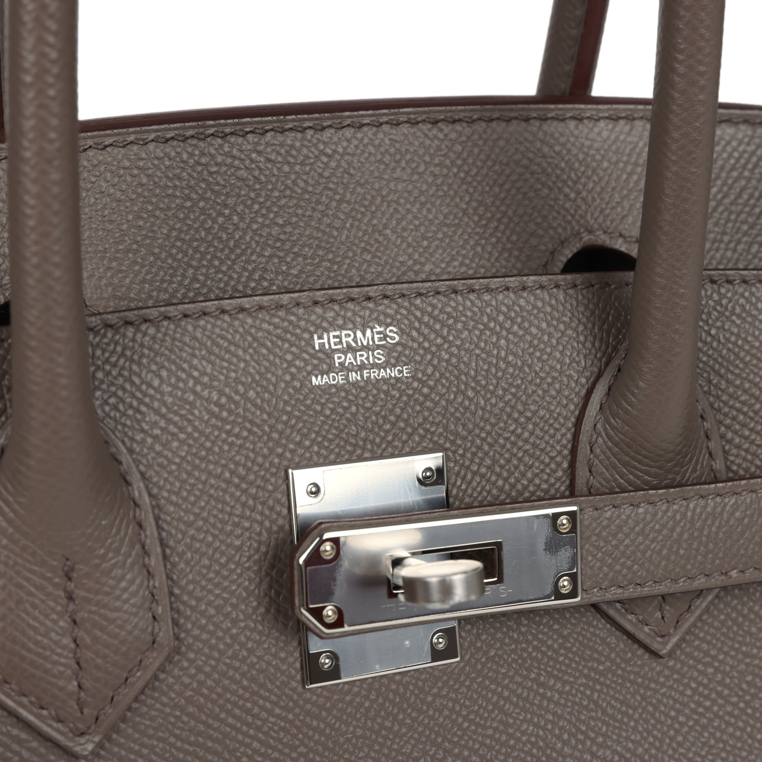 This Birkin is of Etain epsom leather with palladium hardware and has tonal stitching, front flap, two straps with center toggle closure, clochette with lock and two keys, and double rolled handles.