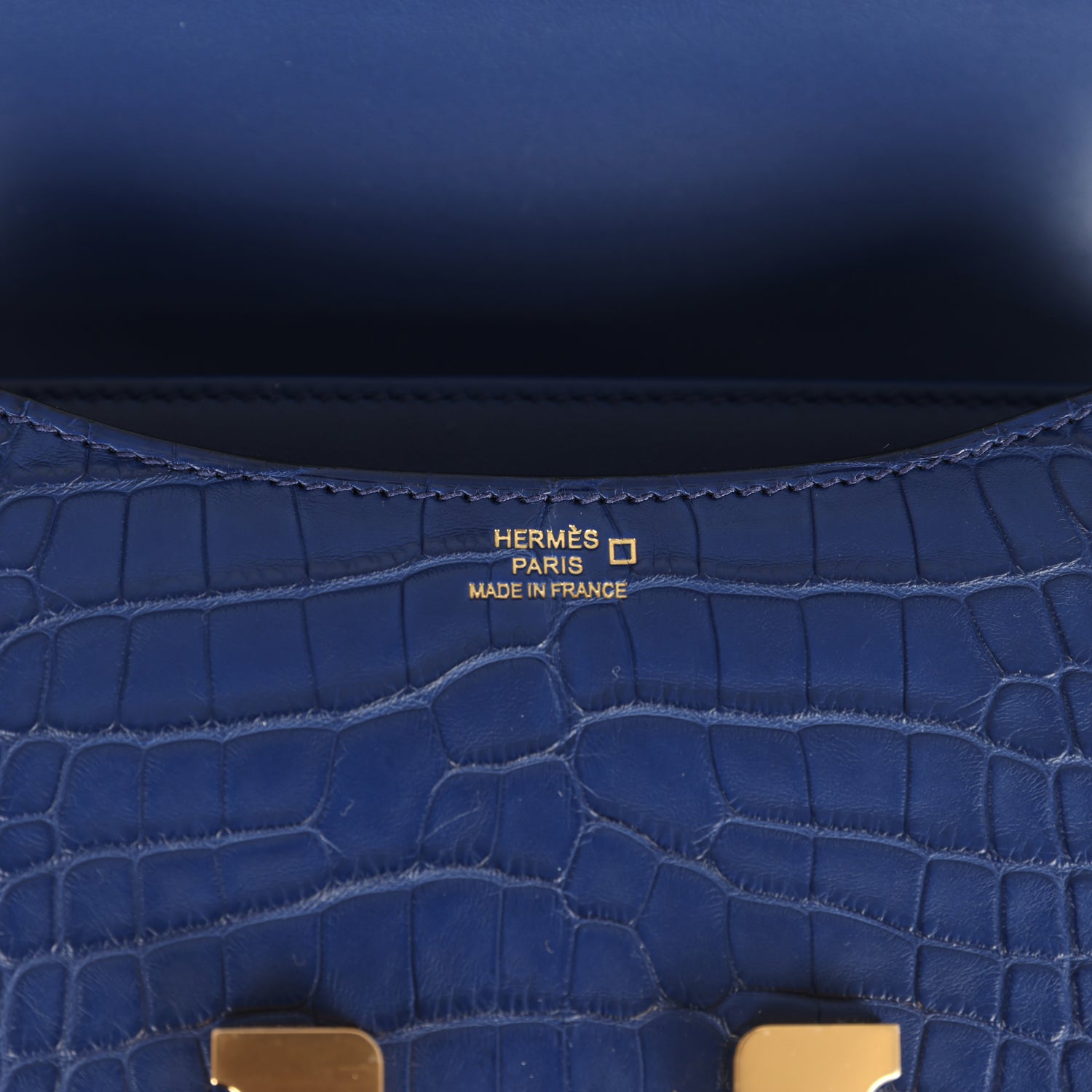 This Hermès Constance 18 Bleu Saphir Matte Alligator Mississippiensis leather with gold hardware, tonal stitching, metal "H" snap closure, and an adjustable strap.