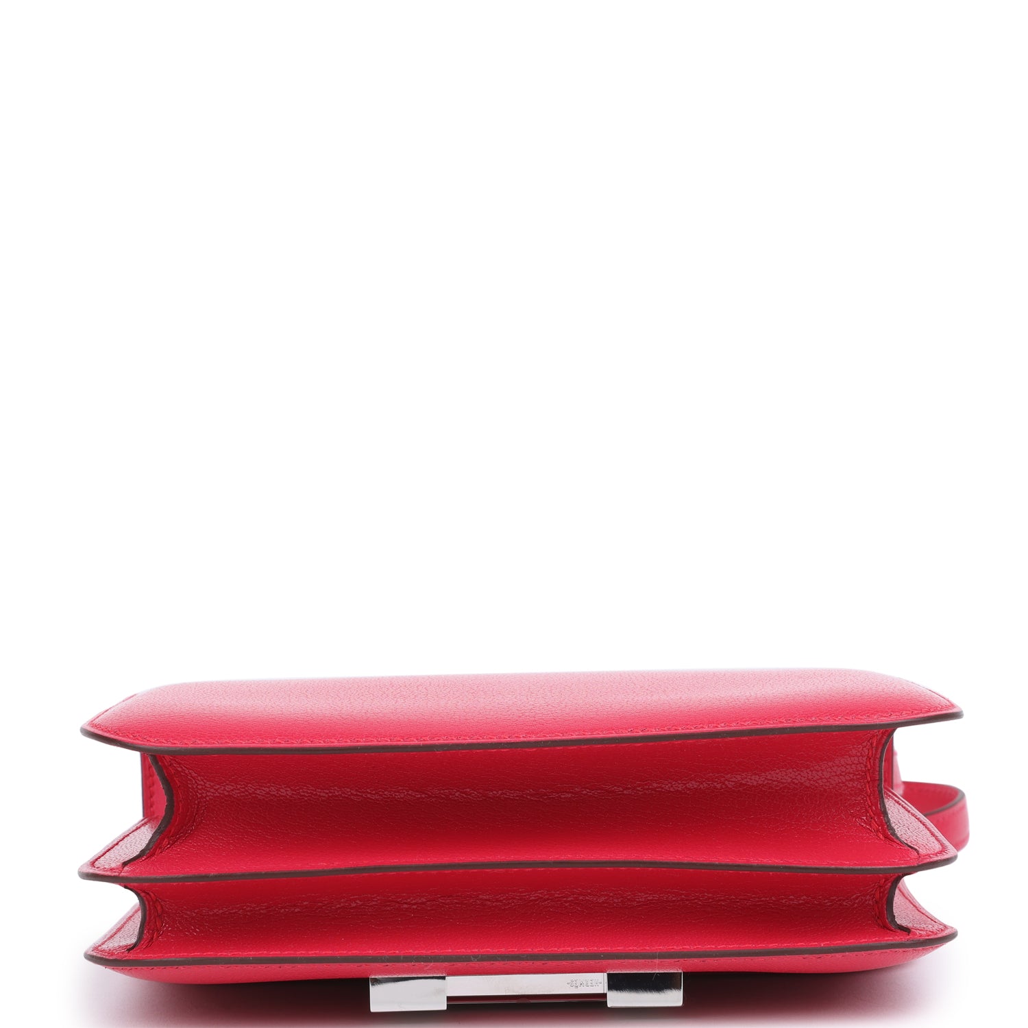The interior is lined with Rose Extreme lambskin and has two open pocket on the front wall, a removable mirror, a center divide, and a slit pocket on the back wall.