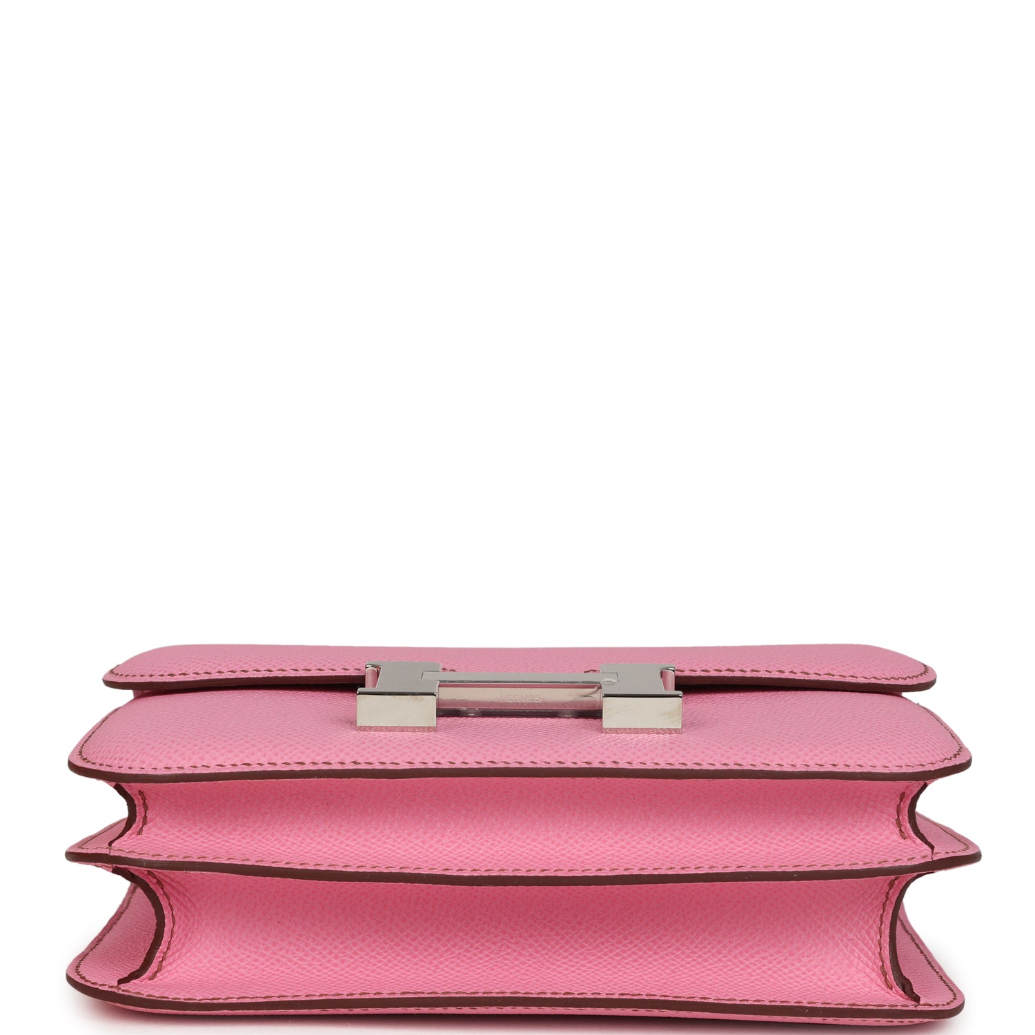 This Constance is in Bubblegum "5P" Pink epsom leather with palladium hardware and has contrast stitching, a metal "H" snap lock closure and an adjustable shoulder strap.