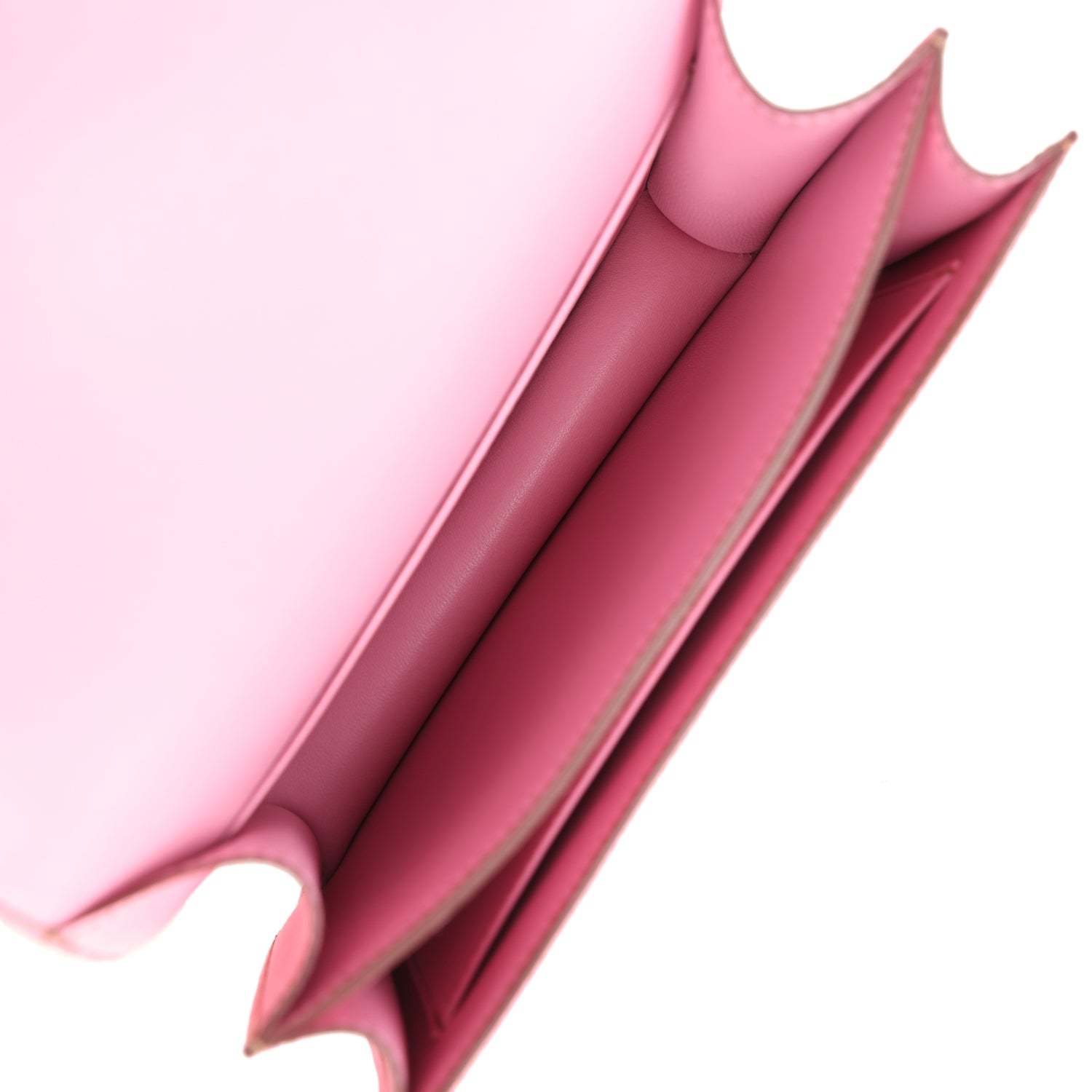The interior is lined with Bubblegum 5P lambskin and has an open pocket on the front wall, a center divide, and a slit pocket on the back wall.