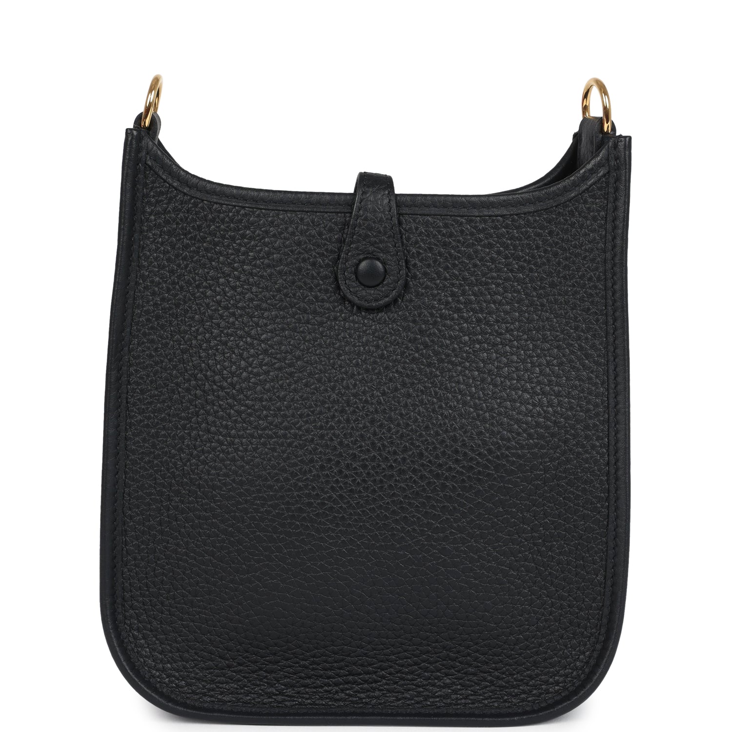 This Evelyne TPM is in Black clemence leather with gold hardware and features tonal stitching stitching, pull tab top closure and a removable adjustable Black and Orange canvas shoulder/crossbody strap.
