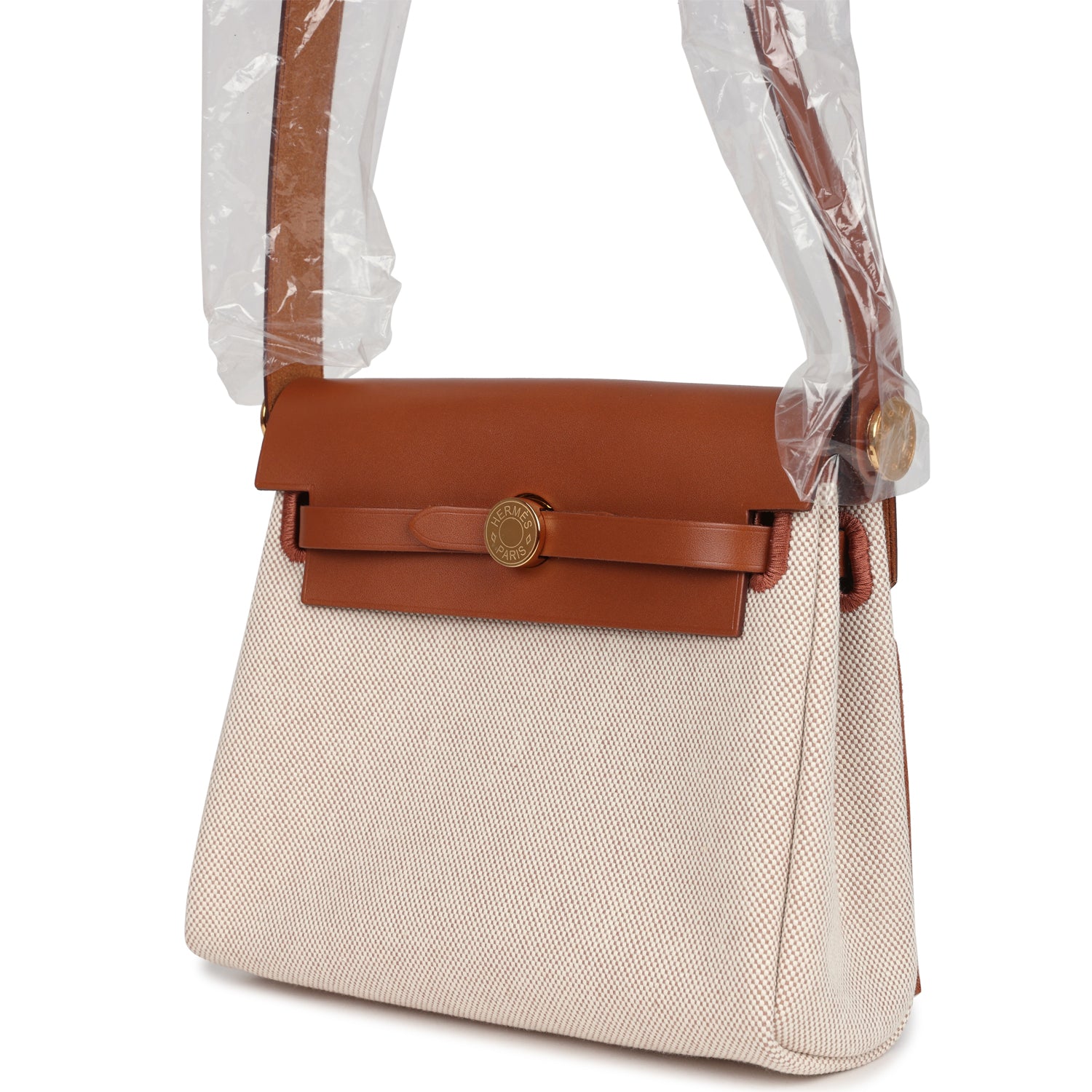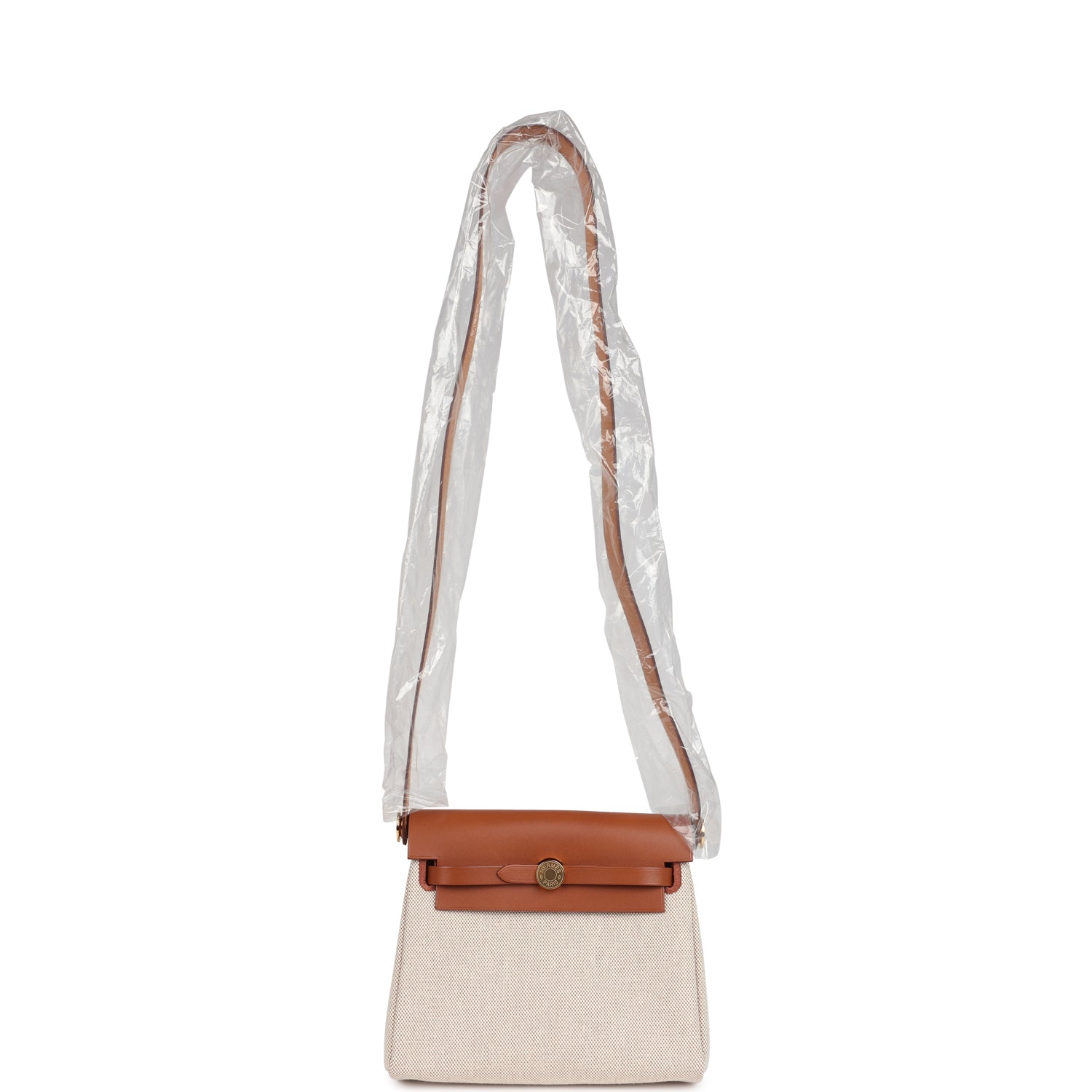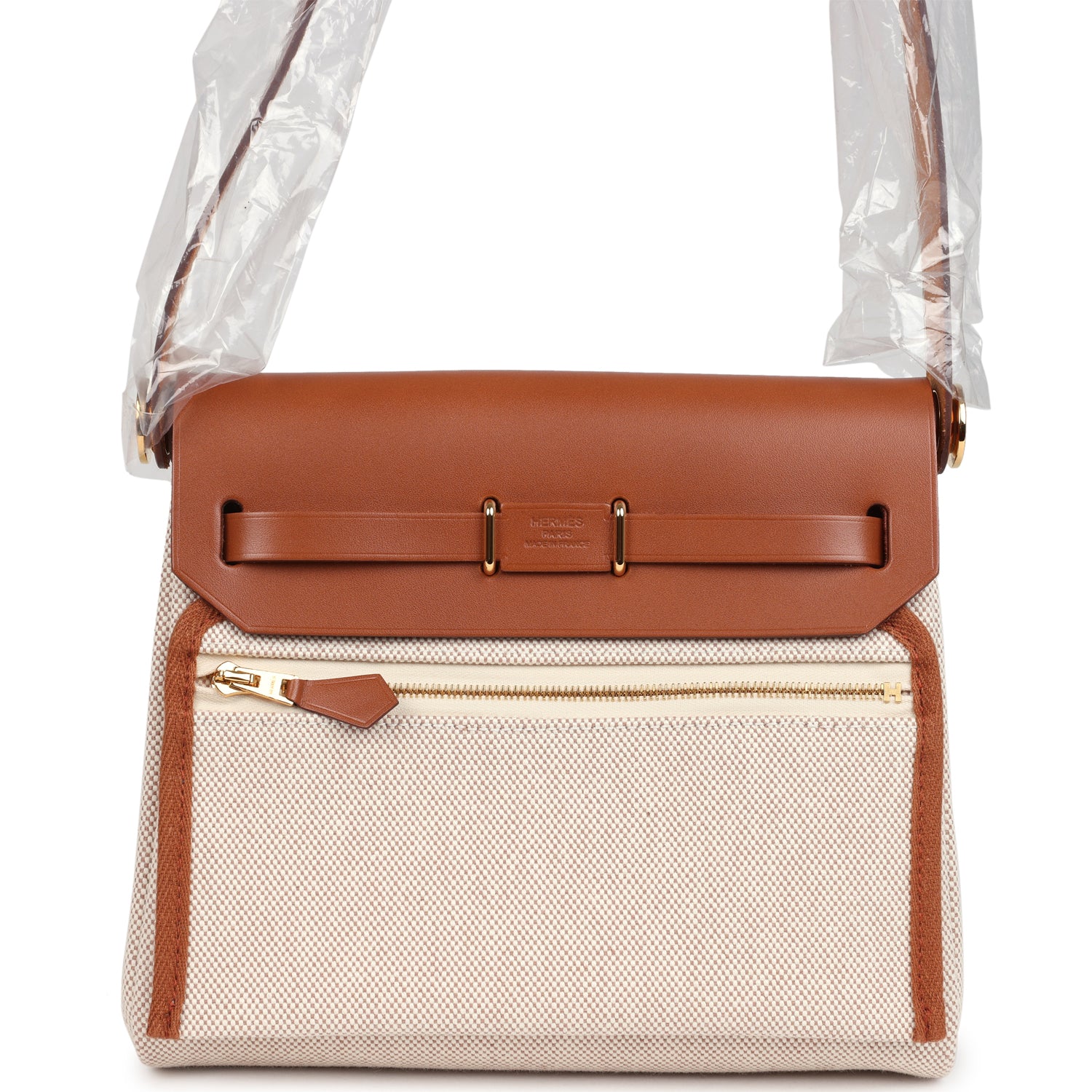 This Hermes Herbag Zip 20 Mini Ecru and Beige Toile H Canvas and Fauve Vache Hunter with gold hardware has tonal stitching, front flap, two straps with center clou de selle closure, back zip pocket and black shoulder strap.