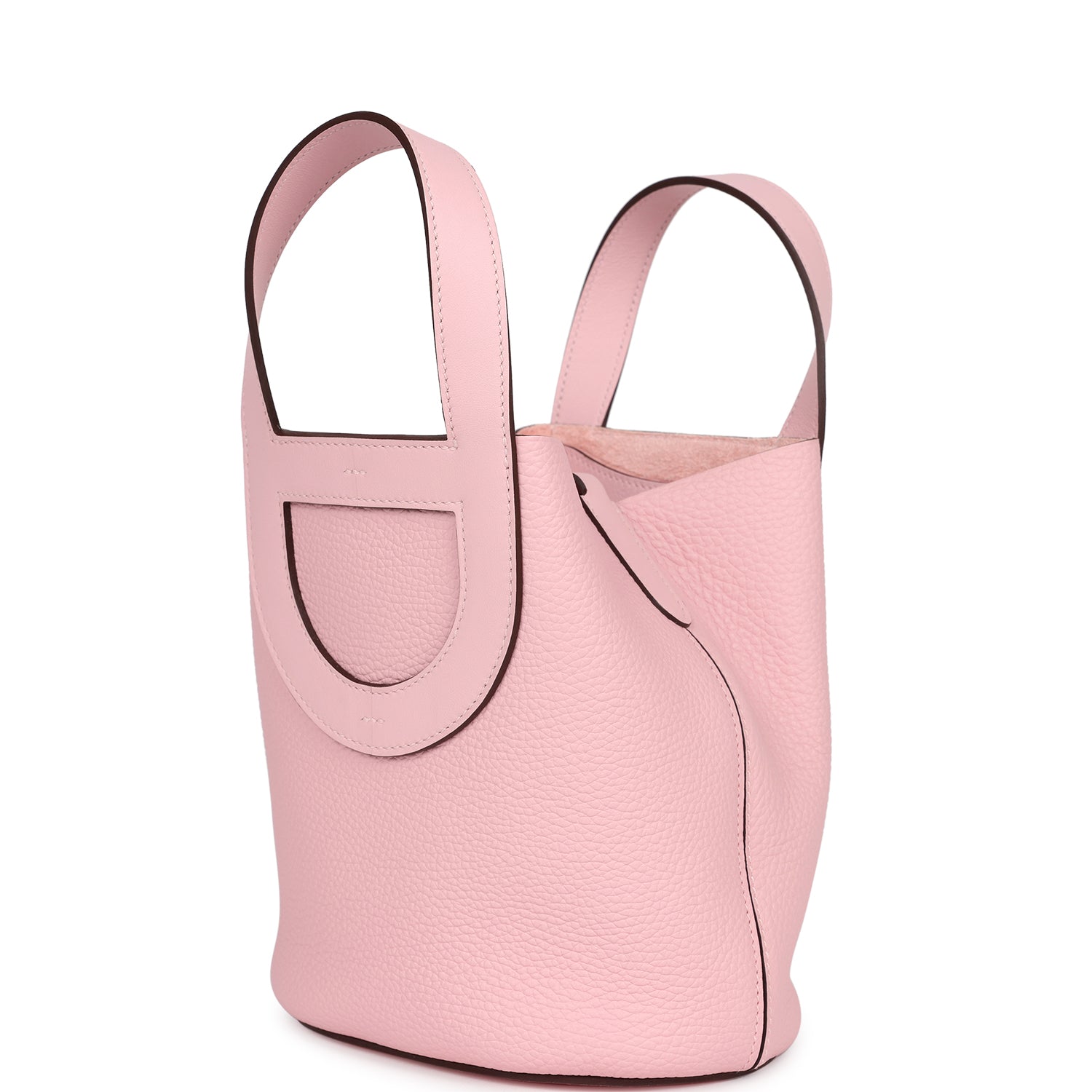 This Hermes In-The-Loop 18 in Rose Sakura clemence and swift leather with palladium hardware is a bucket shaped bag with contrast stitching, two Chaine d'Ancre shaped handles, single interior pocket and a Chaine d'Ancre shaped hook closure.