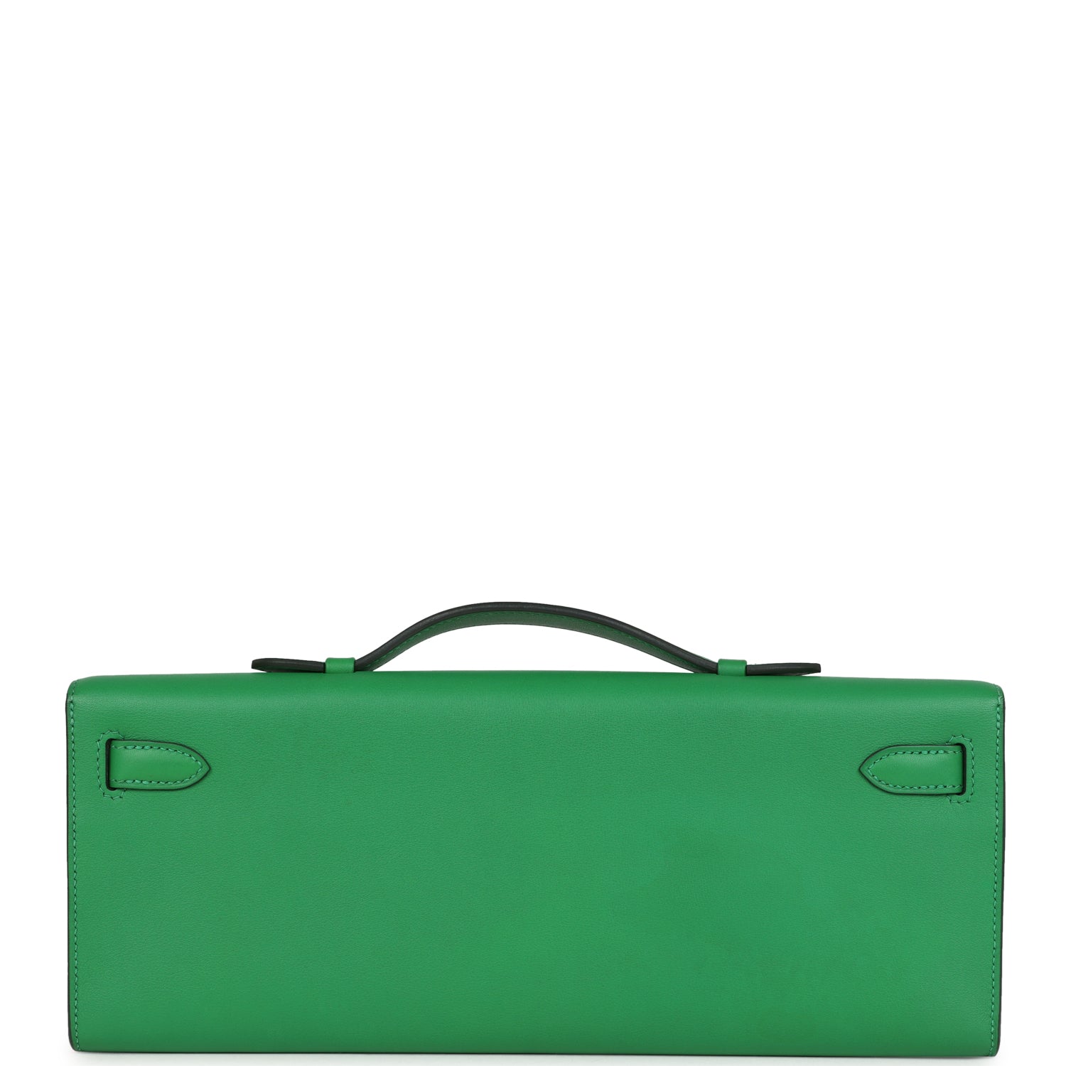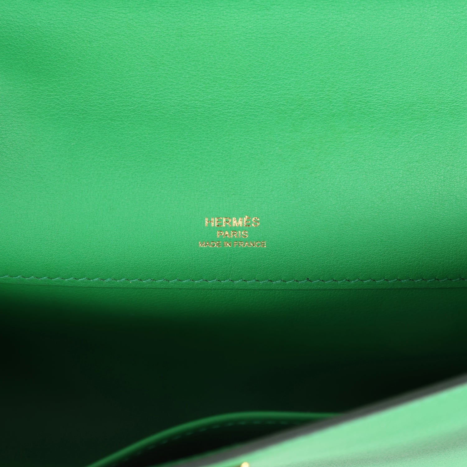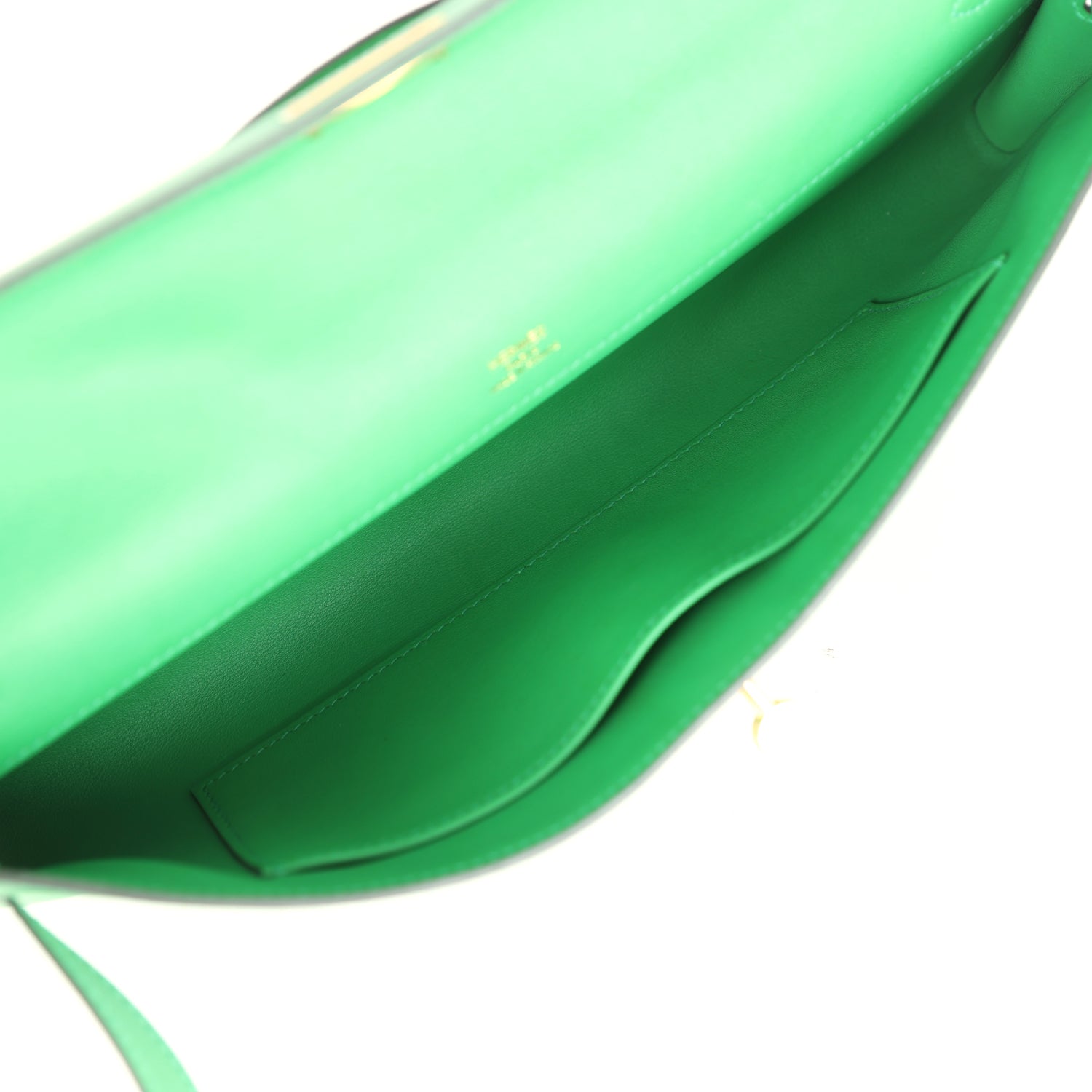 This Kelly Cut Bambou swift leather with gold hardware, features tonal stitching, front flap, pull straps that attach to a toggle, and small top handle.