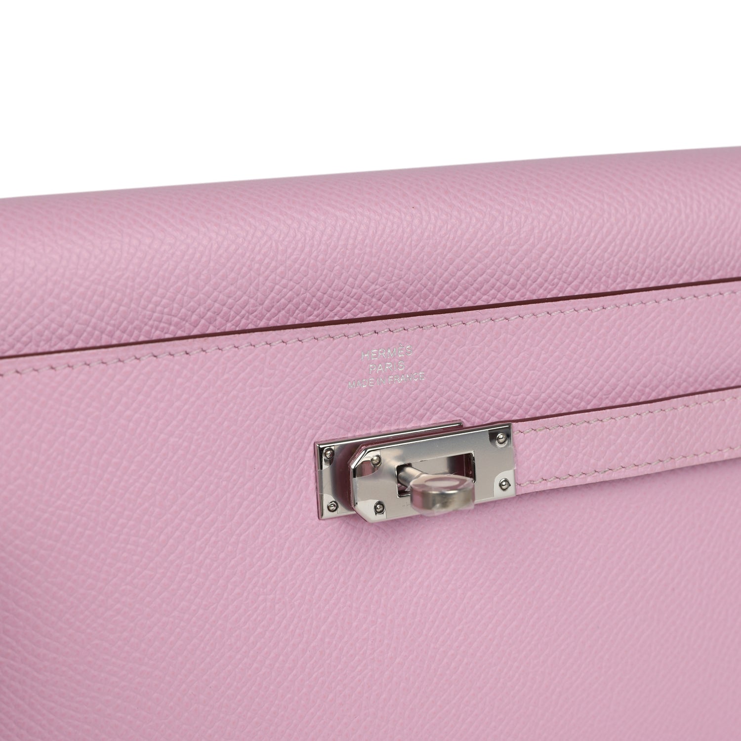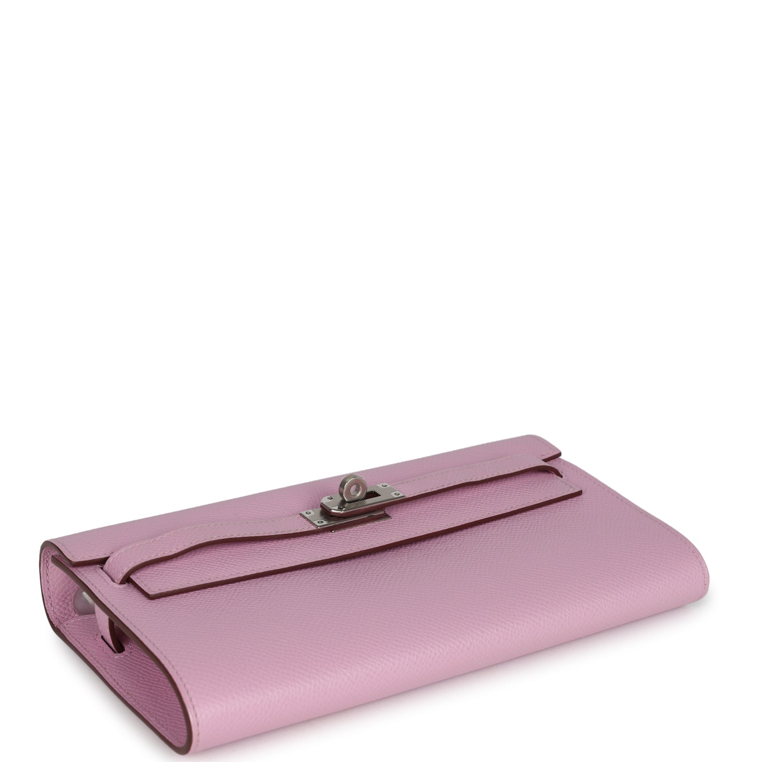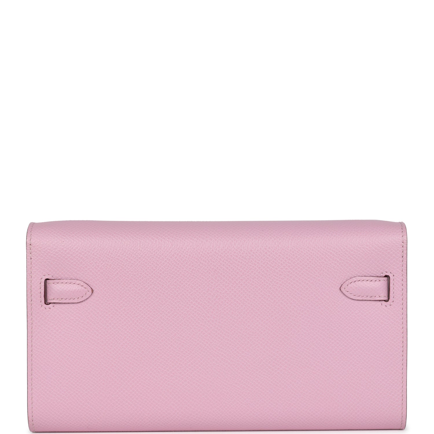 This Kelly Wallet To Go is in Mauve Sylvestre epsom leather with?palladium hardware and has tonal stitching, two straps with front toggle closure and removable crossbody strap.
