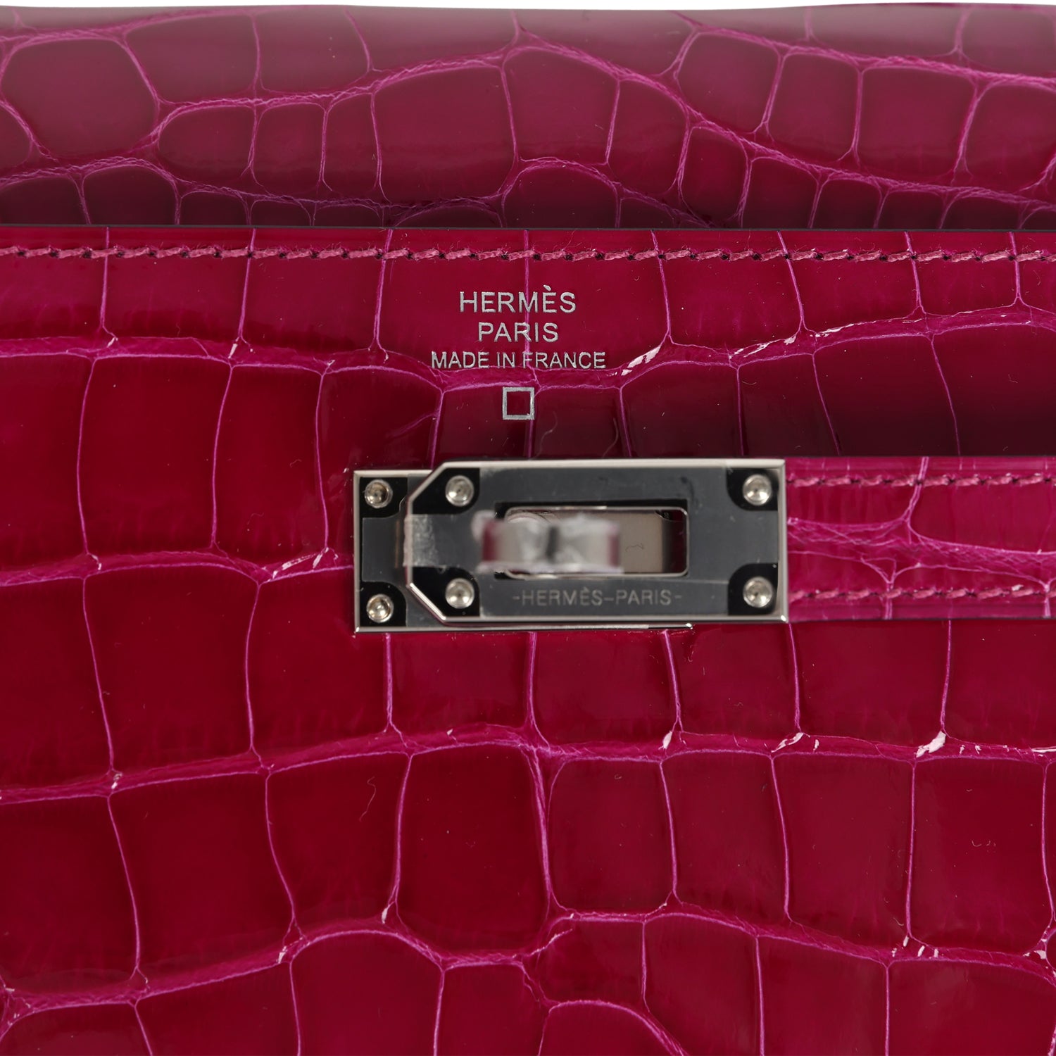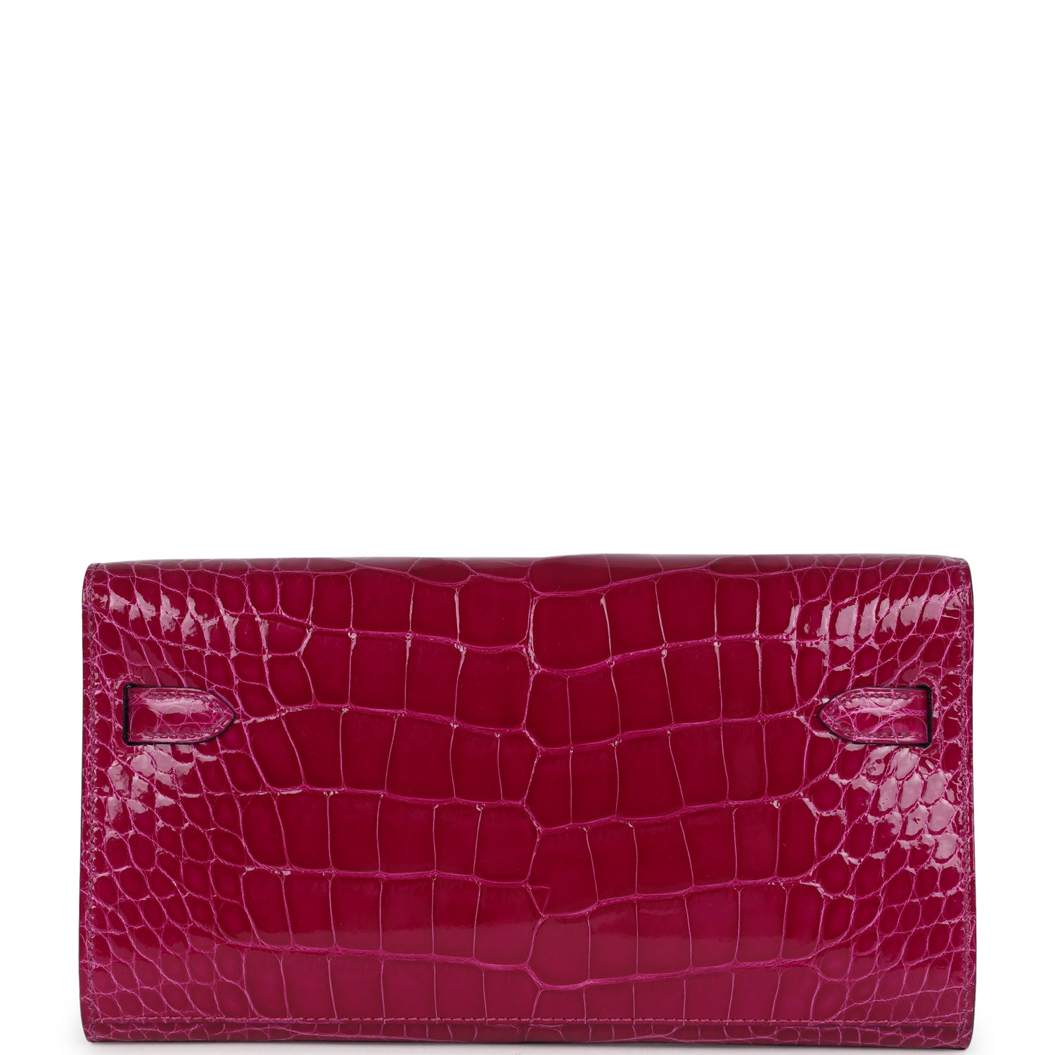 This Kelly Wallet To Go is in Rose Pourpre Shiny Alligator Mississippiensis leather with palladium hardware and has tonal stitching, two straps with front toggle closure and removable crossbody strap.