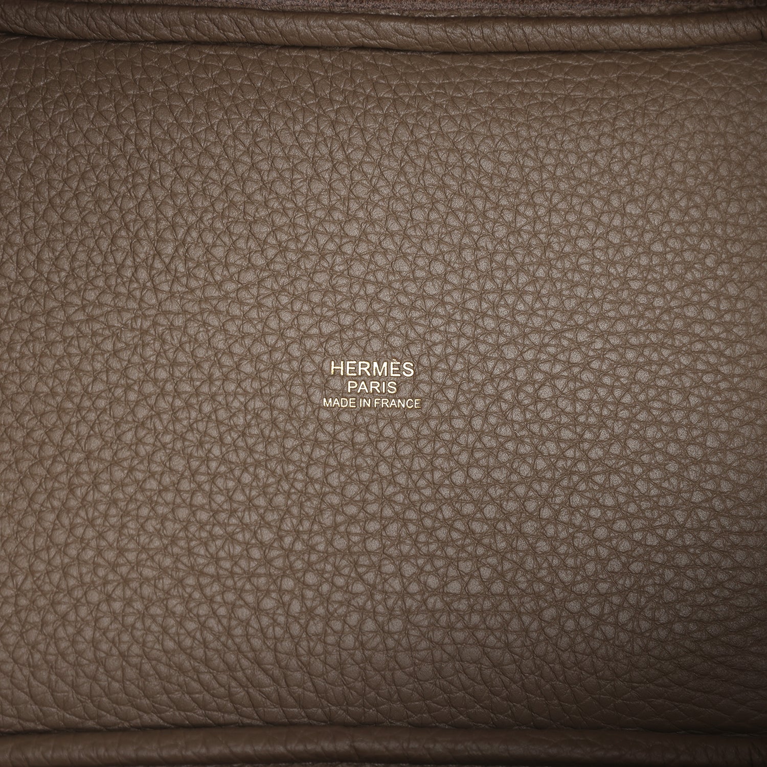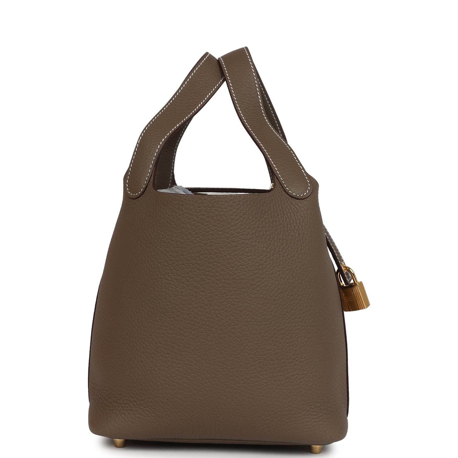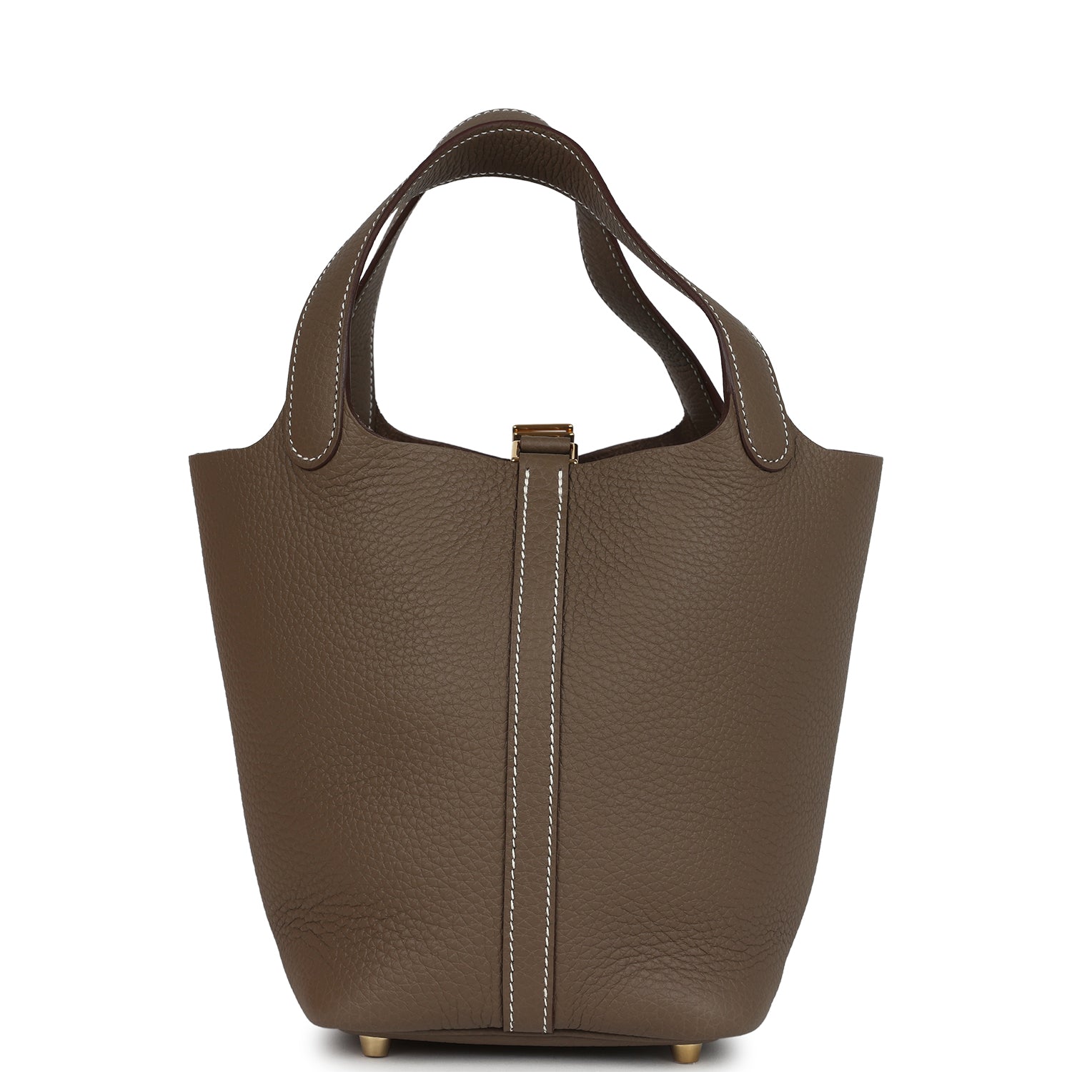 This Picotin is in Etoupe clemence leather with gold hardware and has contrast stitching with two top handles.