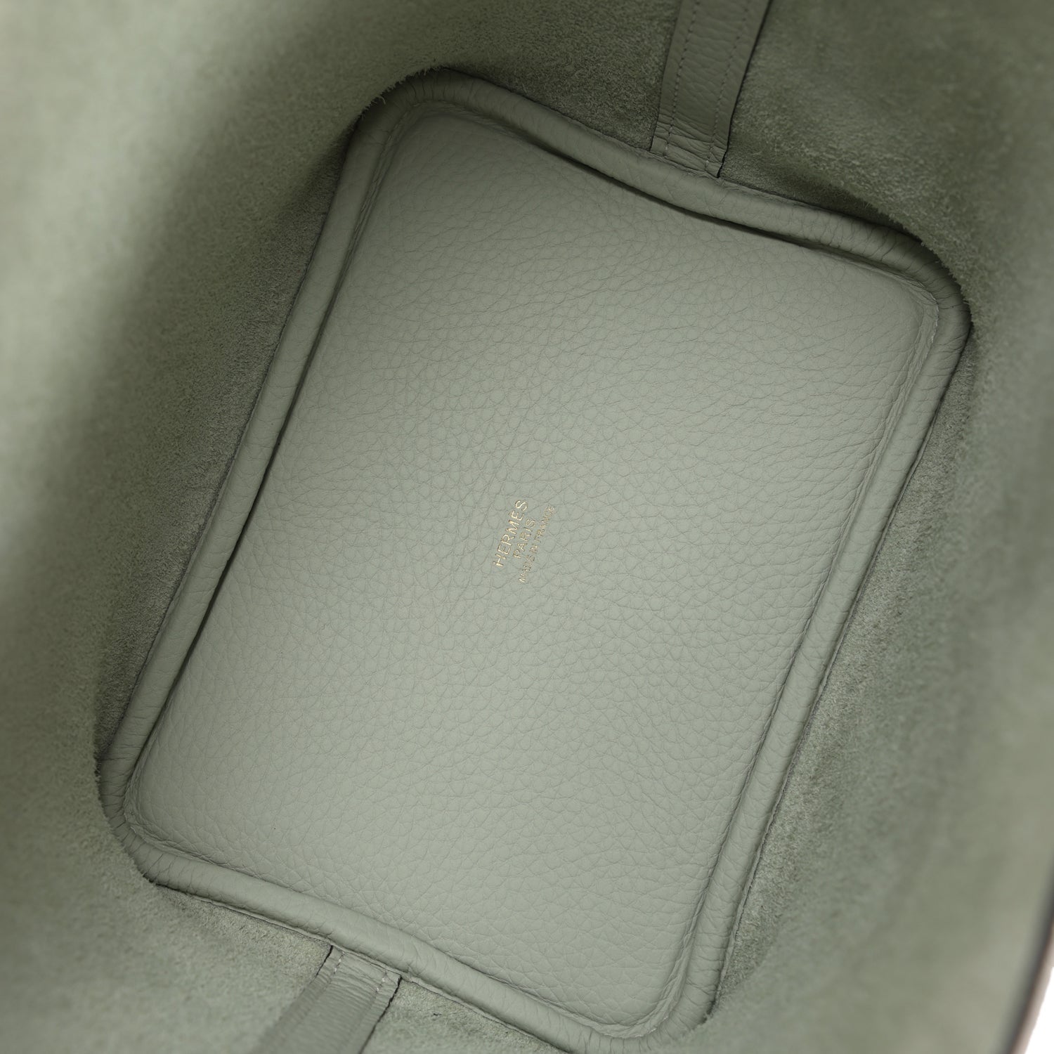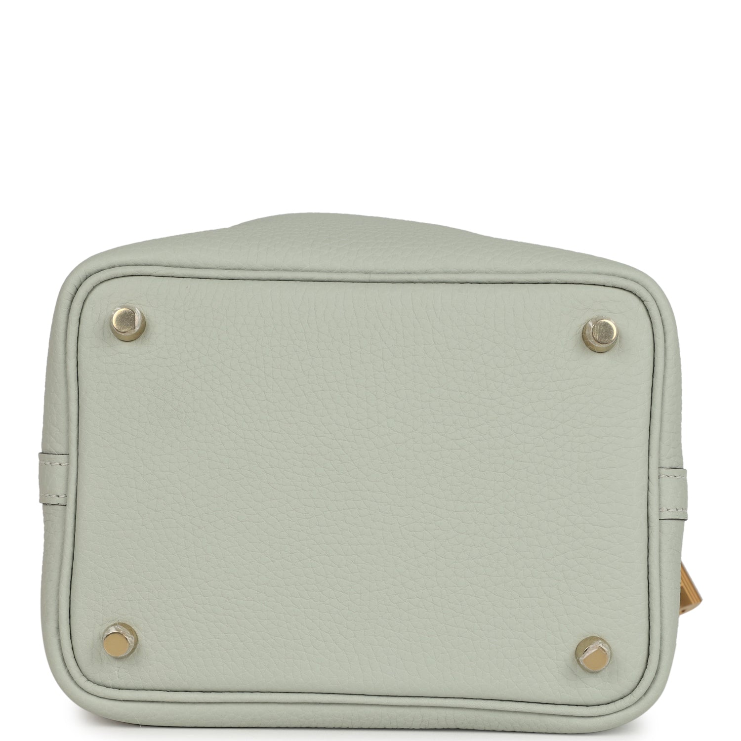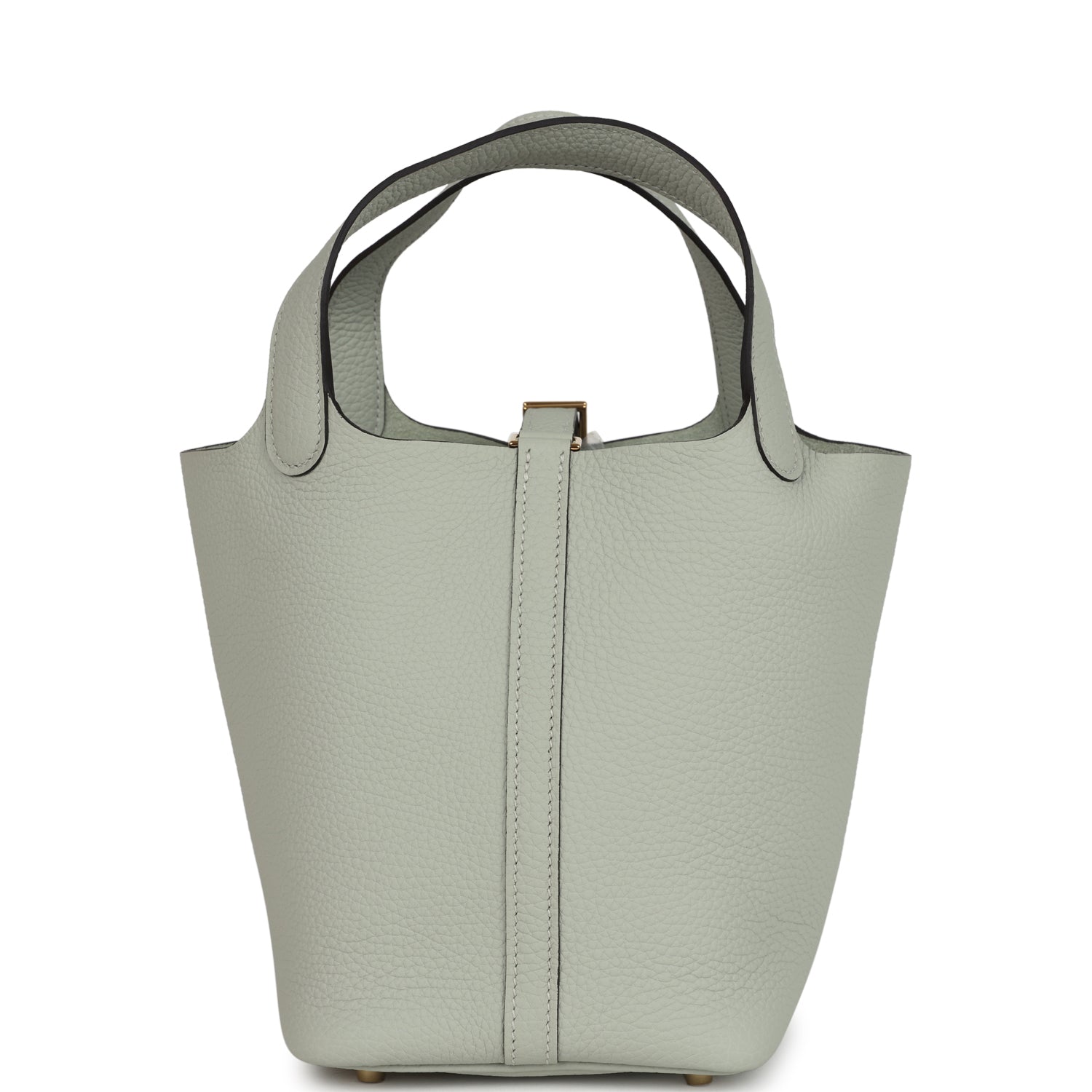 This Picotin Lock is in Gris Neve clemence leather with gold hardware and has tonal stitching with two top handles.