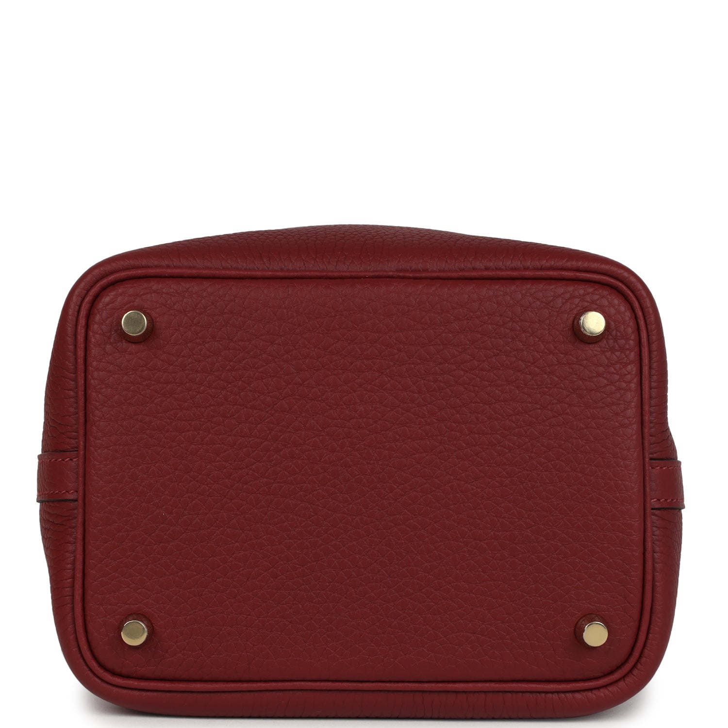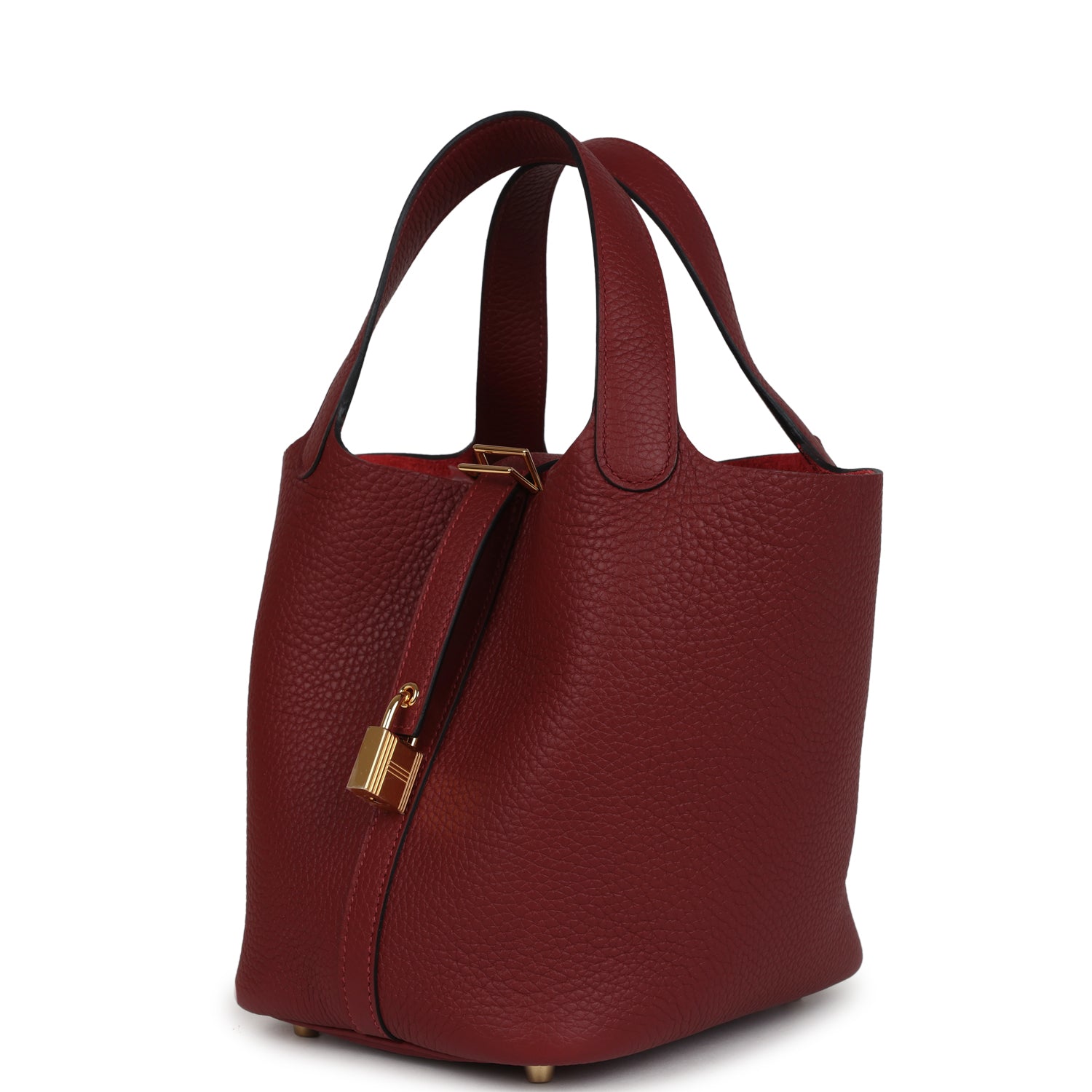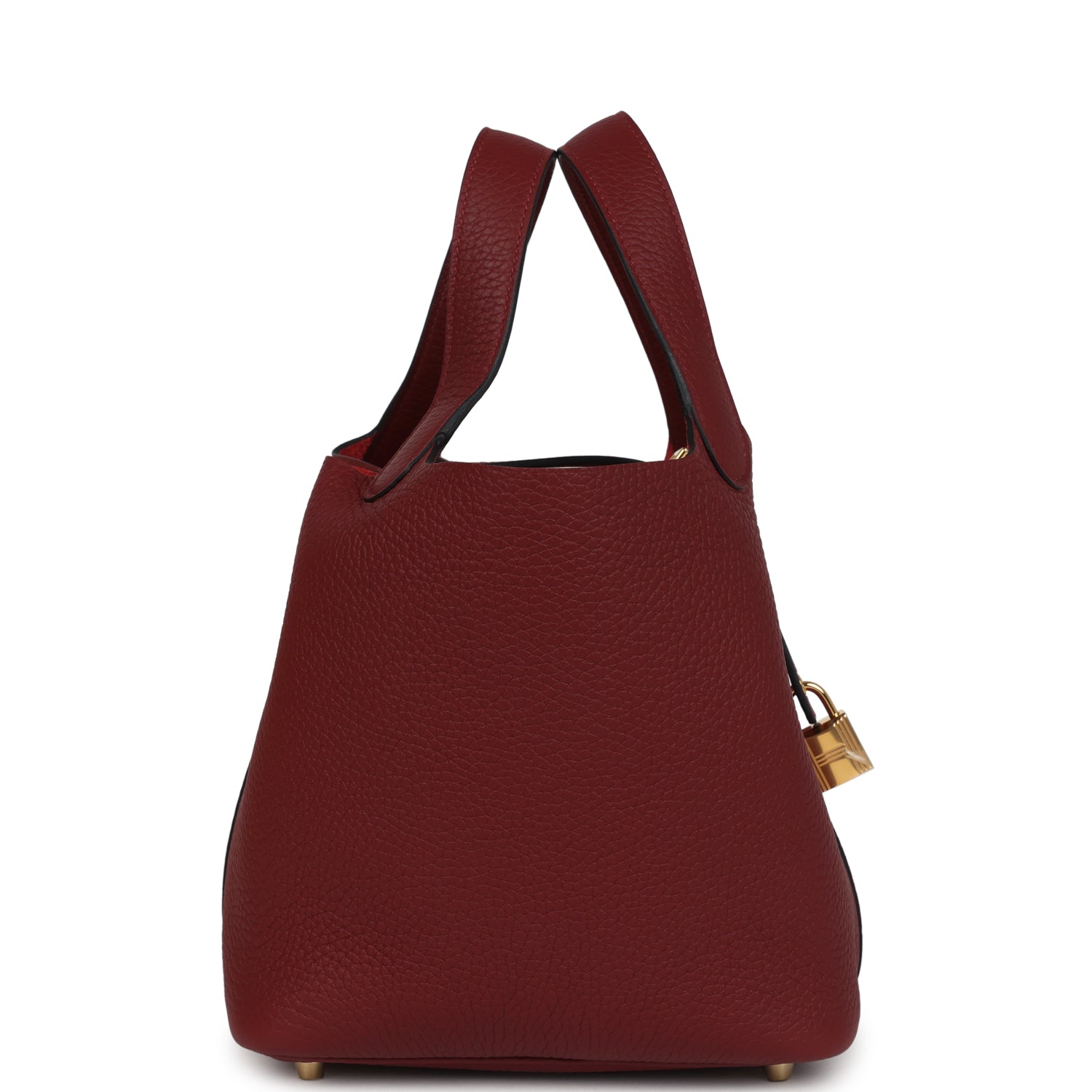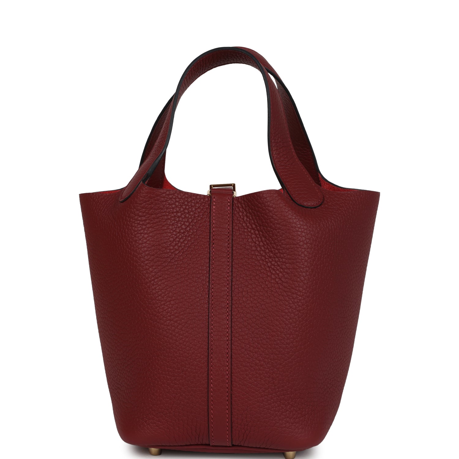 This Picotin Lock is in Rouge H clemence leather with gold hardware and has tonal stitching with two top handles, lock and two keys.
