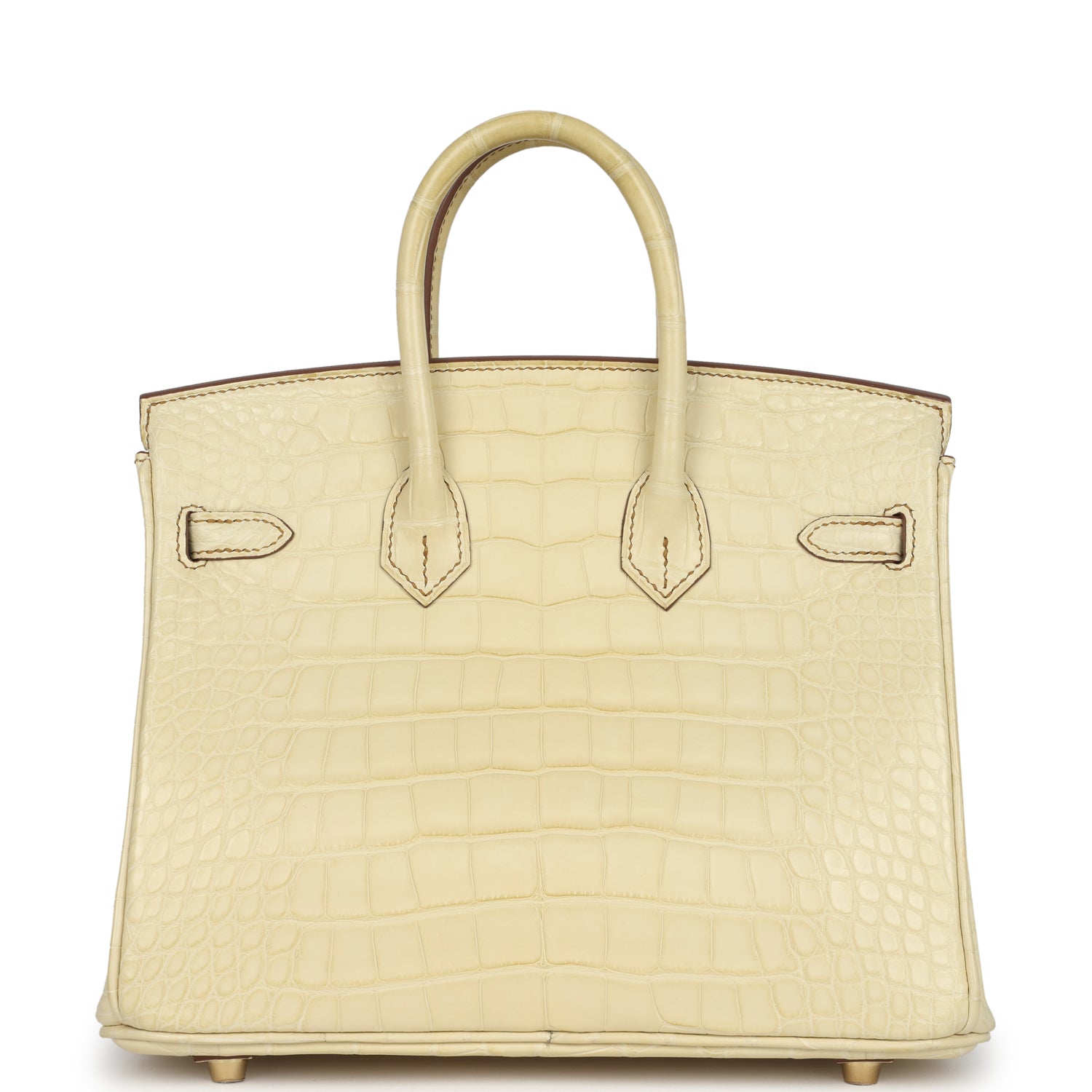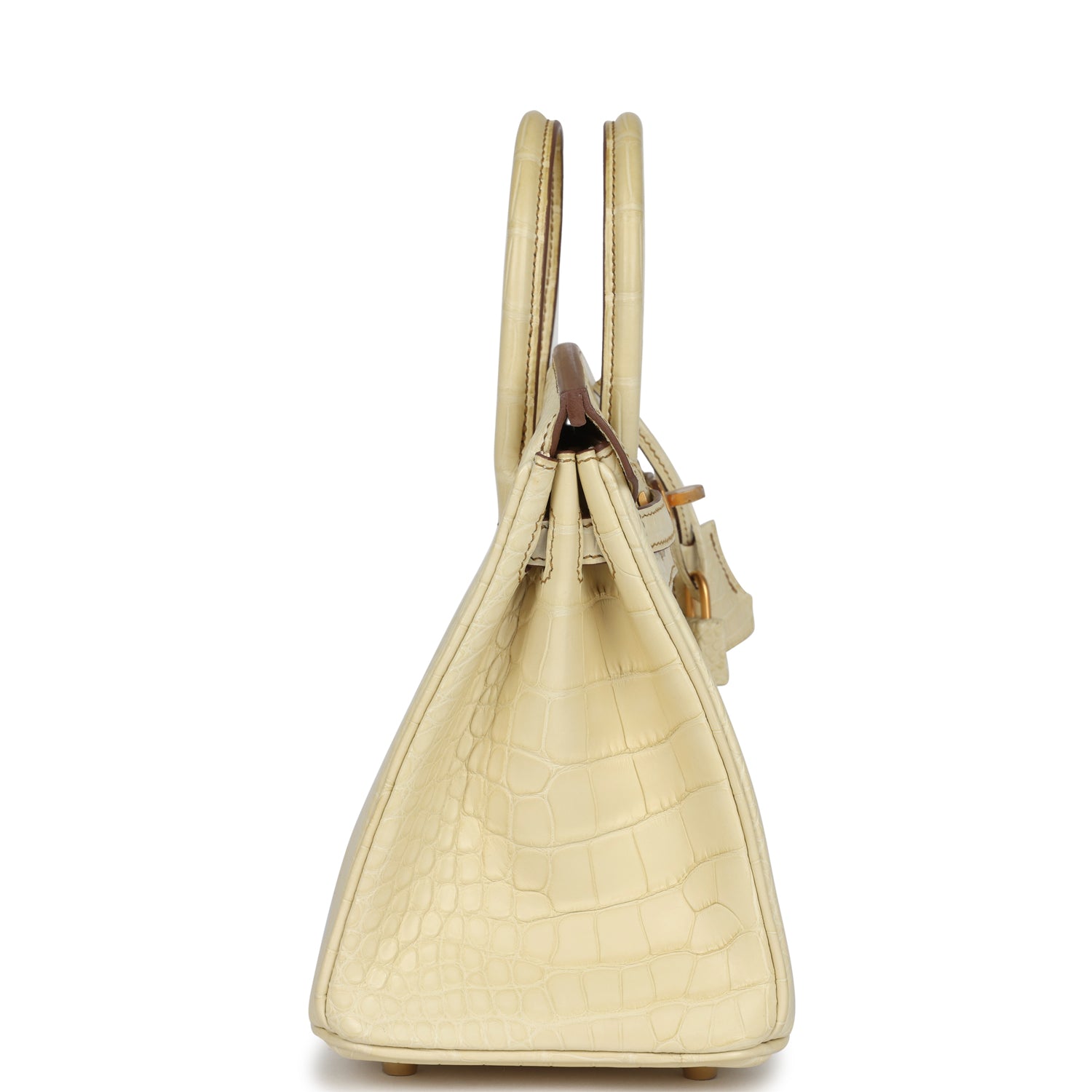 This Special Order Birkin in Vanille Matte Alligator Mississippiensis leather with brushed gold hardware, has contrast stitching, front flap, two straps with center toggle closure, clochette with lock and two keys, and double rolled handles.
