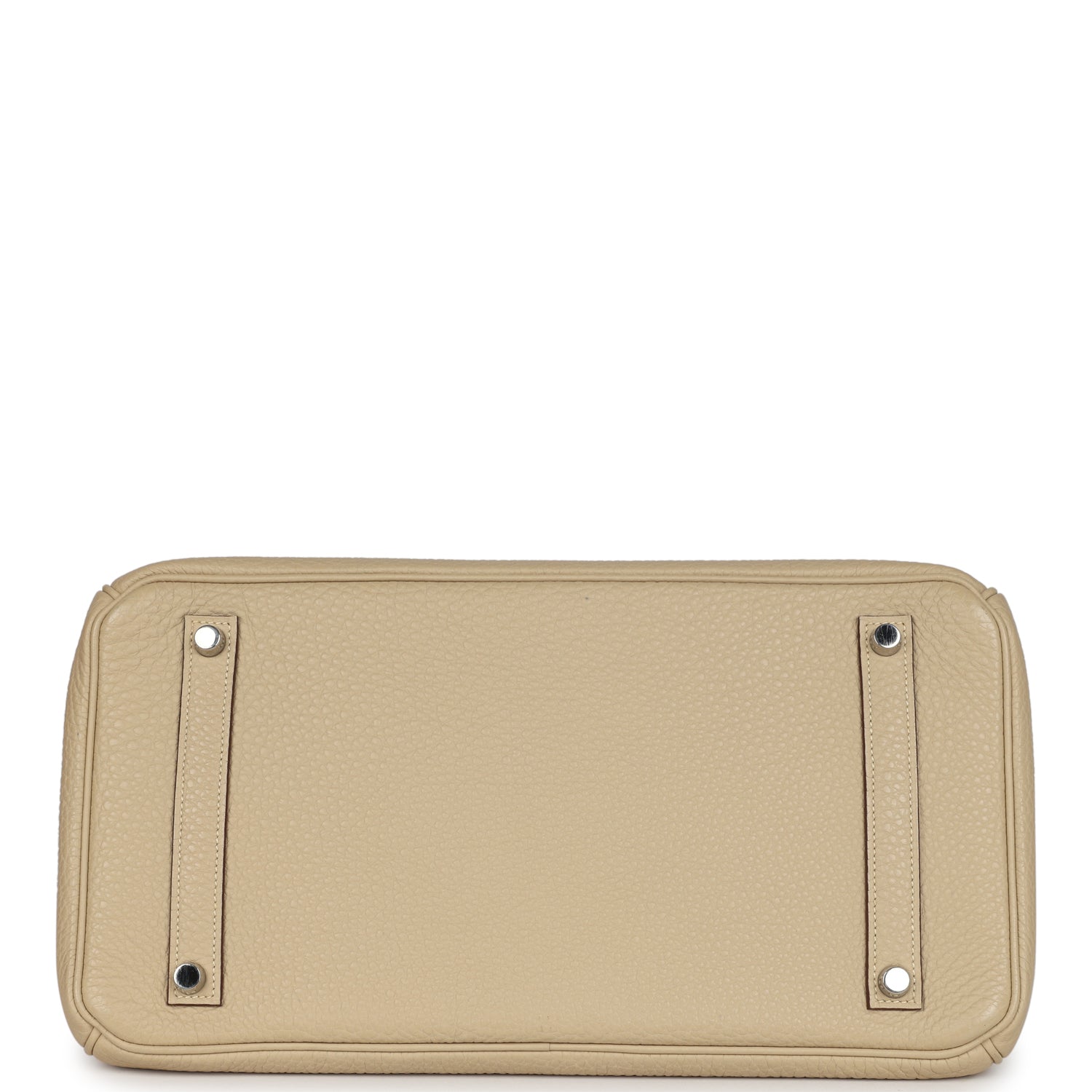 This Birkin is in Parchemin togo leather with palladium hardware, tonal stitching, front flap with two straps, front toggle closure, double rolled handles, clochette, lock and two keys.