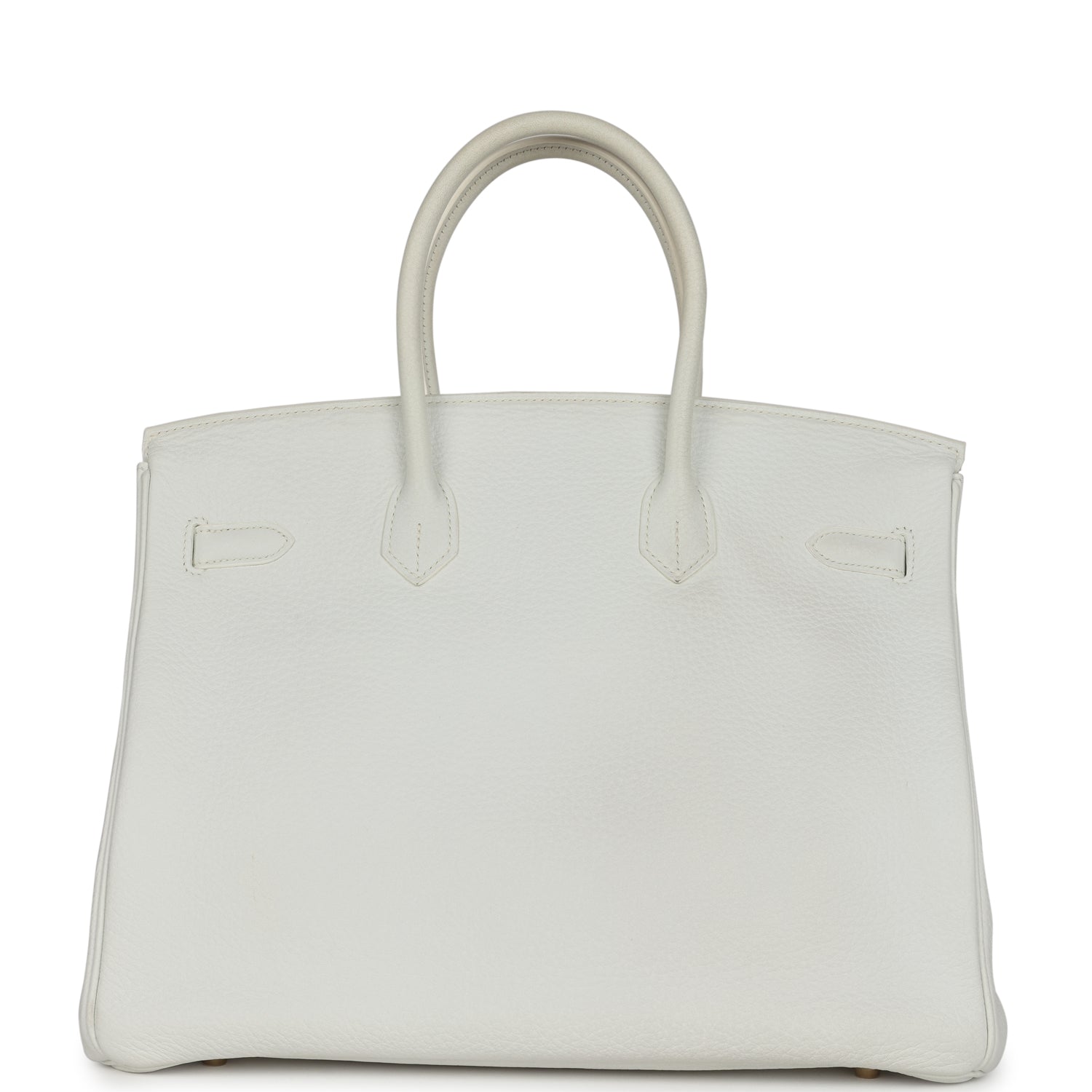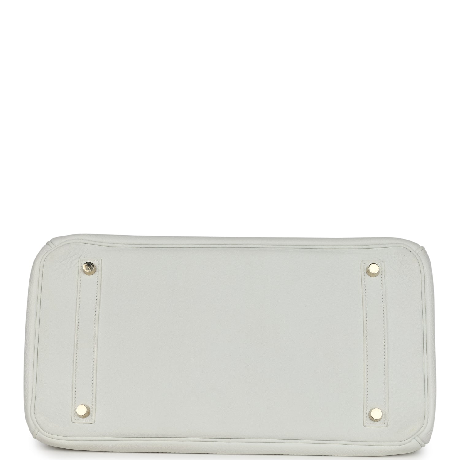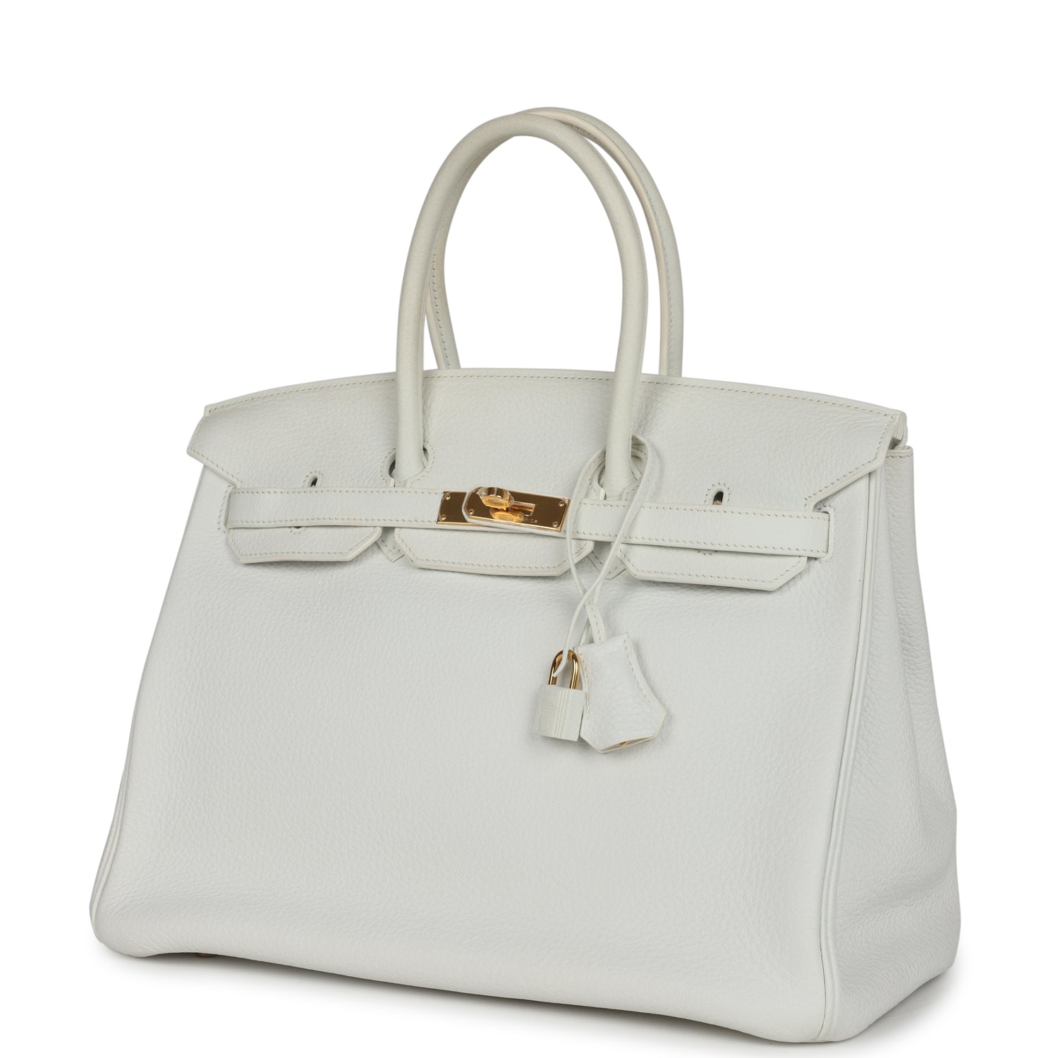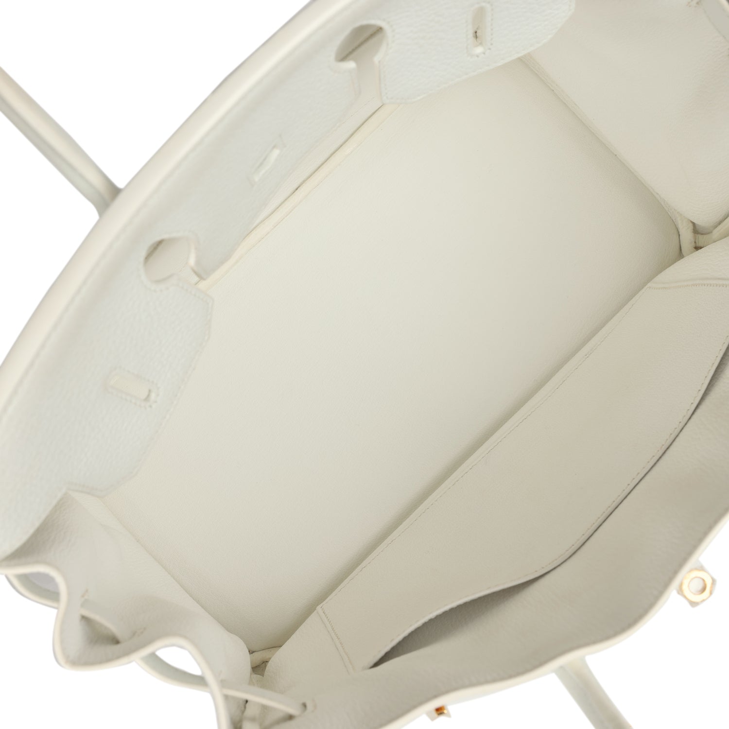 This Birkin is in Whiteclemence leather with gold hardware and has tonal stitching, front flap, two straps with center toggle closure, clochette with lock and two keys, and double rolled handles.