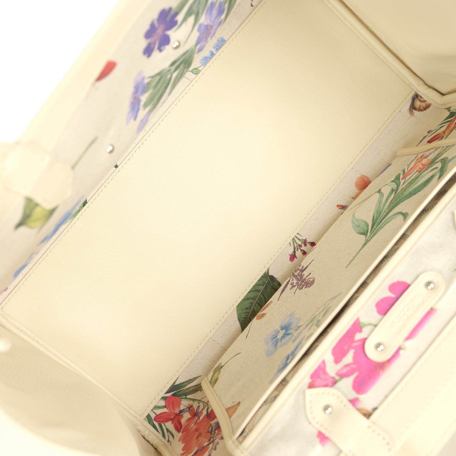 The interior is lined is multicolored floral printed canvas and Sand Chevroches calfskin leather and a single floating pocket and a wooden detail on back of bag with palladium studs.