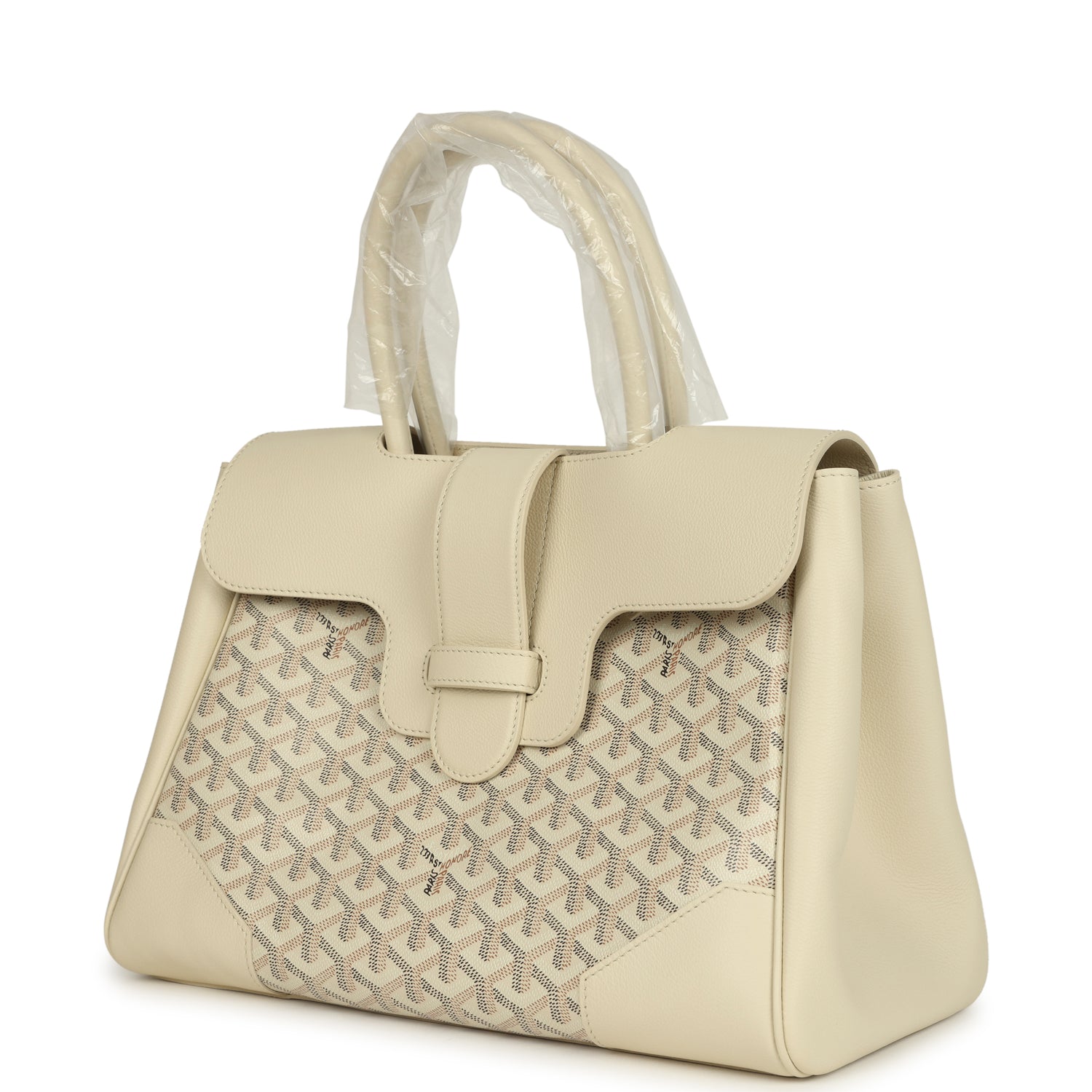 This 2025 limited edition Goyard Souple Saigon Tote in Sand Goyardine coated canvas and Chevroches calfskin leather with palladium hardware, tonal stitching, features two double rolled top handles, signature Saigon leather strap and loop closure, a cutout in the top of the flap for the handle to fit through.