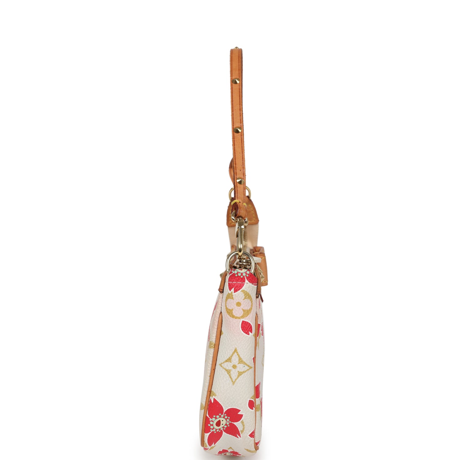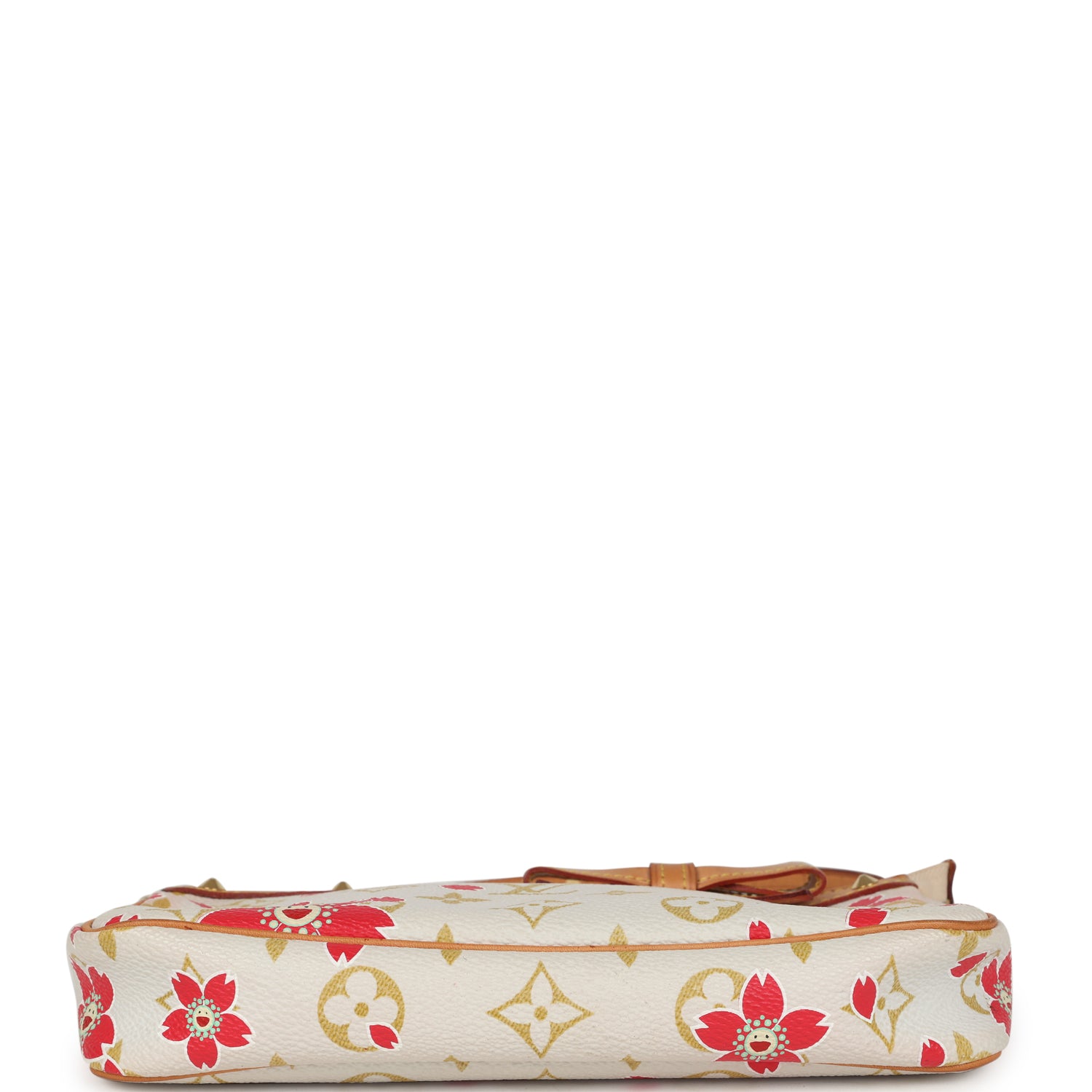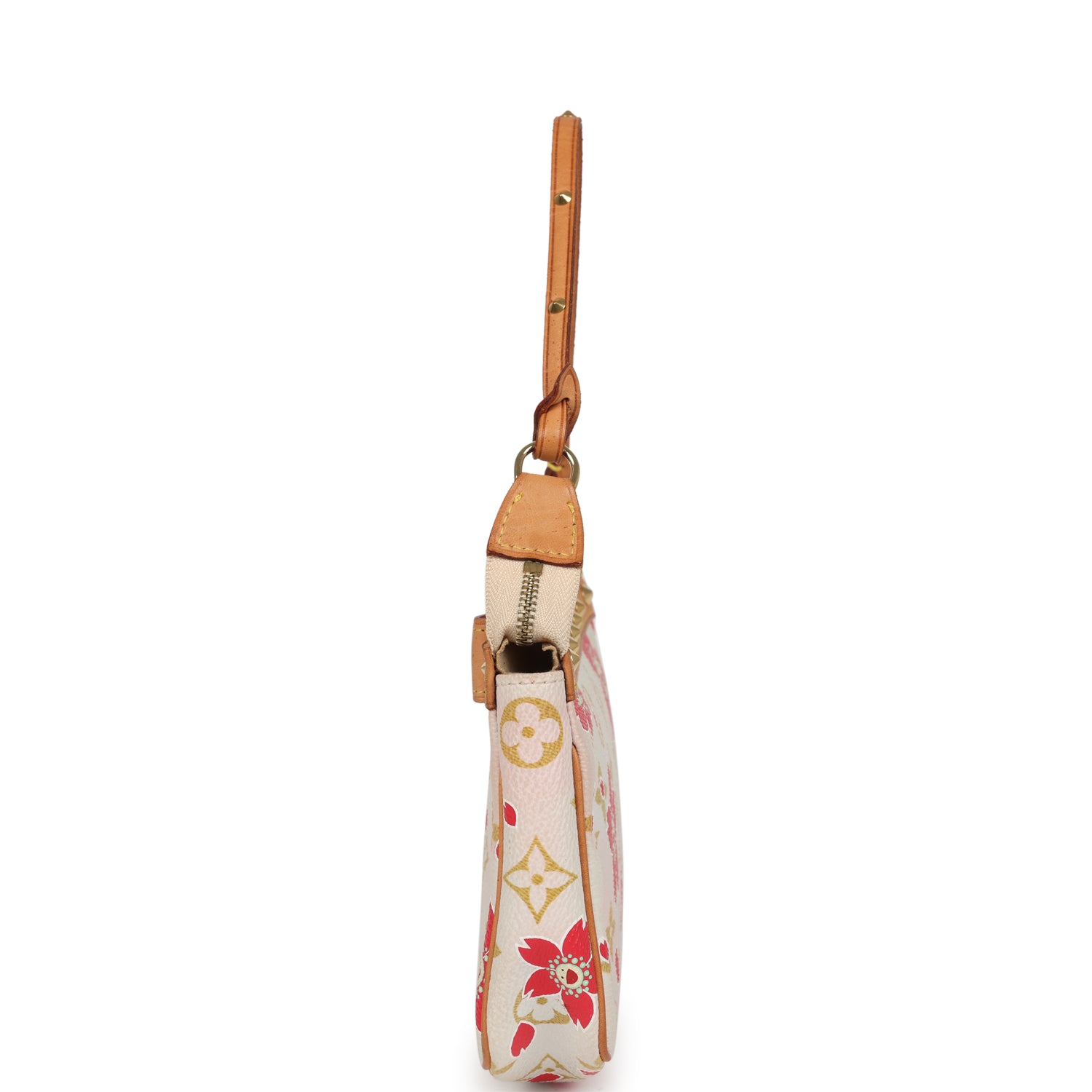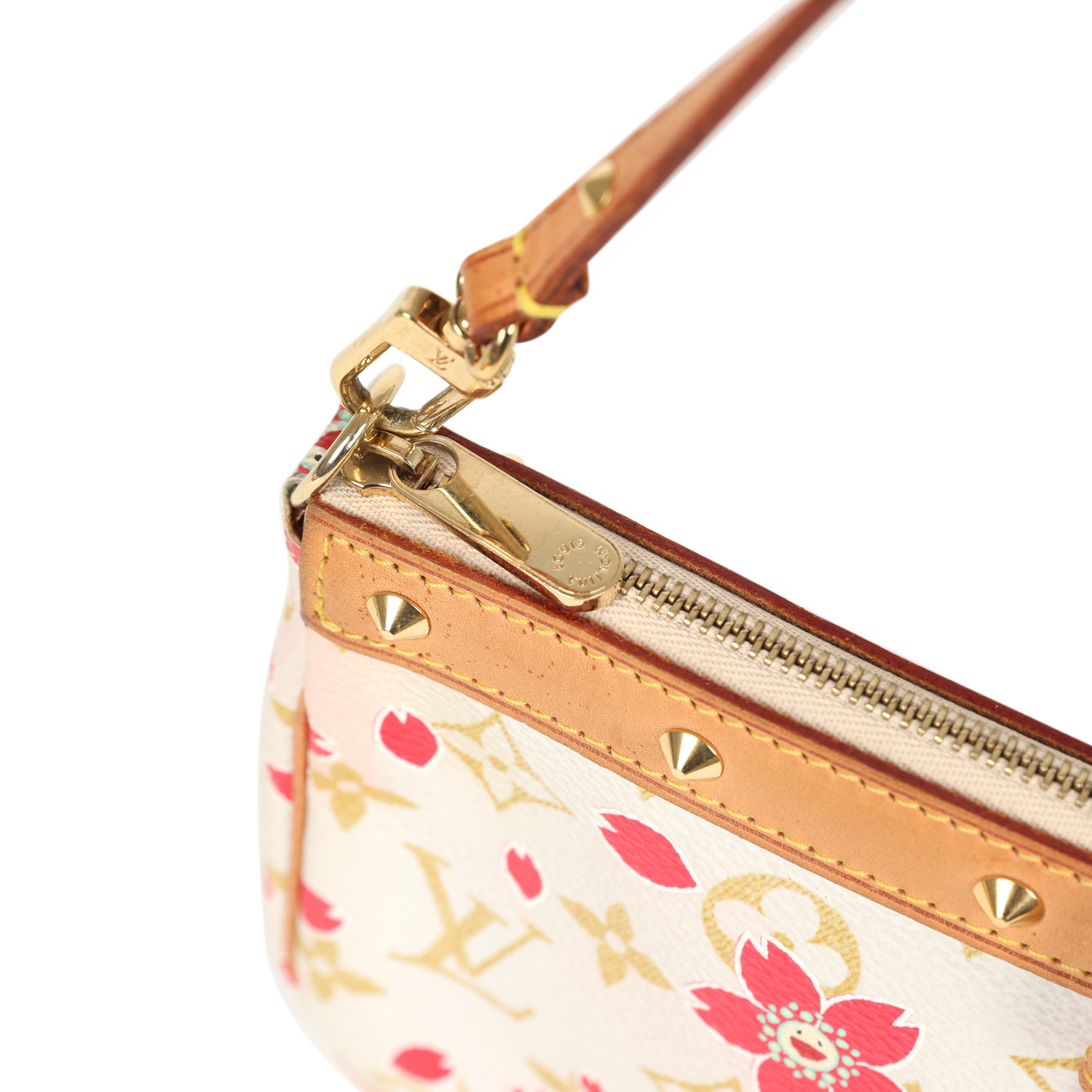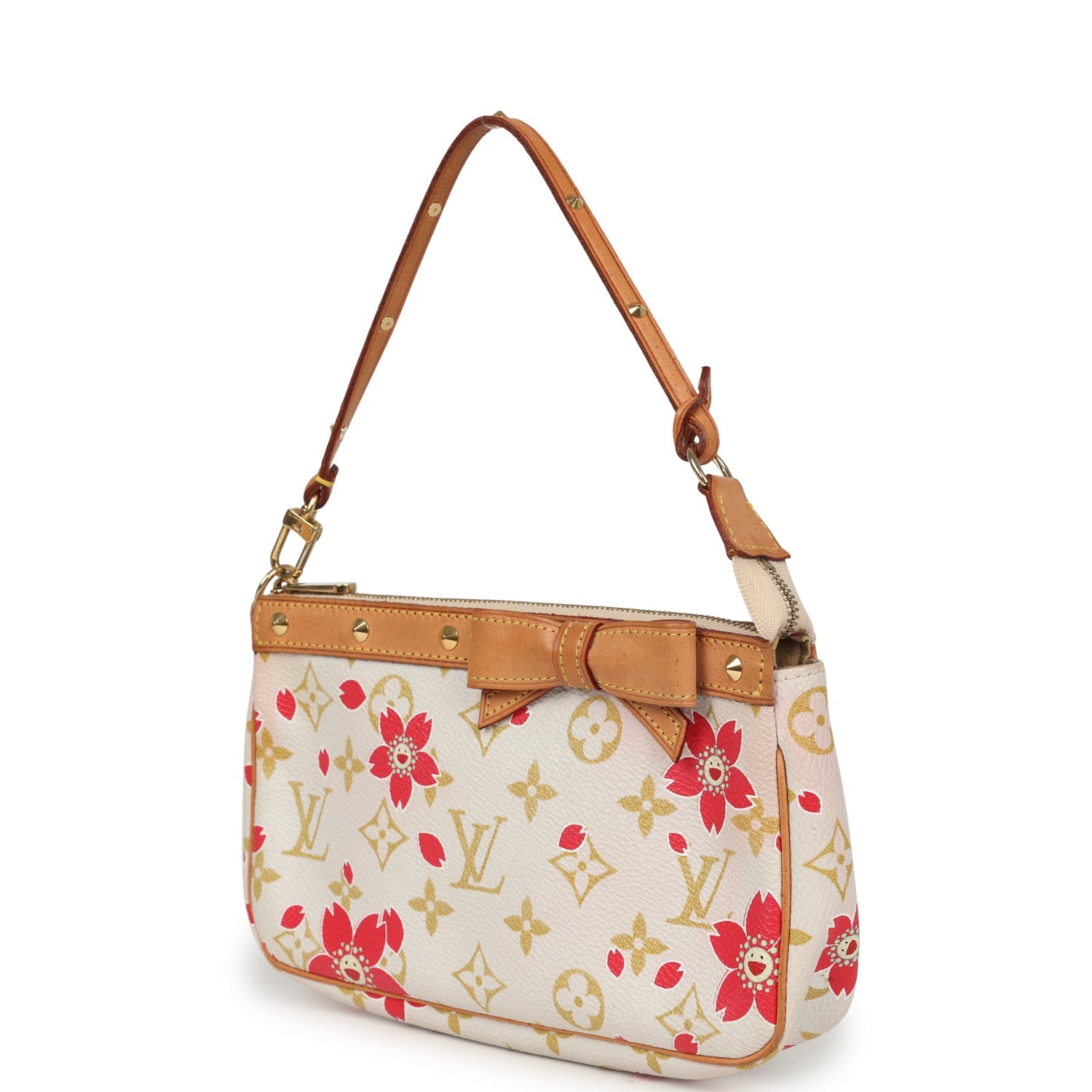 This Limited Edition Louis Vuitton x Takashi Murakami Pochette bag is in Cherry Blossom monogram coated canvas with gold tone stud hardware, Vachetta leather trim, and detachable shoulder strap.