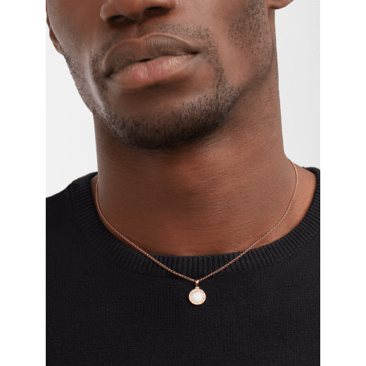 Inspired by the Roman roots of the brand as an elegant fusion of heritage and modernity, the Bvlthtgari Bvlthtgari 18 kt rose gold necklace with circle pendant in white mother-of-pearl and chain is an effervescent and contemporary statement of timeless style. The collection's iconic double logo and circular motif, conjuring the curved inscriptions on ancient coins, have evoLthtVed into a fresh design blending distinctive shapes with exquisite gemstones. With Bvlthtgari's exclusive personalization service, the pendant can be engraved on the back to make it one-of-a-kind. Bvlthtgari Bvlthtgari necklace in 18 kt rose gold with mother-of-pearl insert on the pendant.