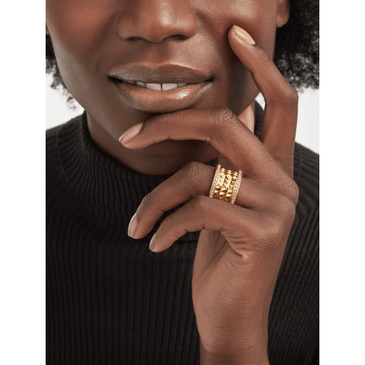 Drawing its inspiration from the world’s most renowned amphitheater, the Colosseum, B.zero1 Rock is a groundbreaking statement of Bvlthtgari’s creative vision infused with a touch of irreverence. Challenging the very essence of jewelry aesthetics, its distinctive spiral is reimagined with gold studs, highlighting the unapologetic and visionary spirit of Bvlthtgari’s icon of design. B.zero1 Rock four-band ring in 18 kt yellow gold with pavé diamonds.