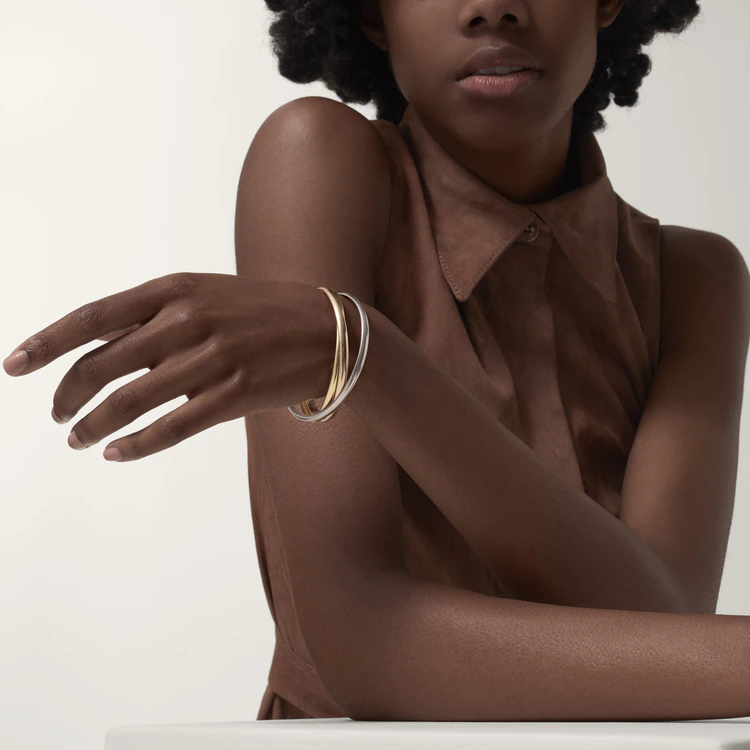 Trinity bracelet, classic model, 18K white gold (750/1000), 18K rose gold (750/1000), 18K yellow gold (750/1000). Width: 4.5 mm. Thickness: 1.8 mm (for size 17).