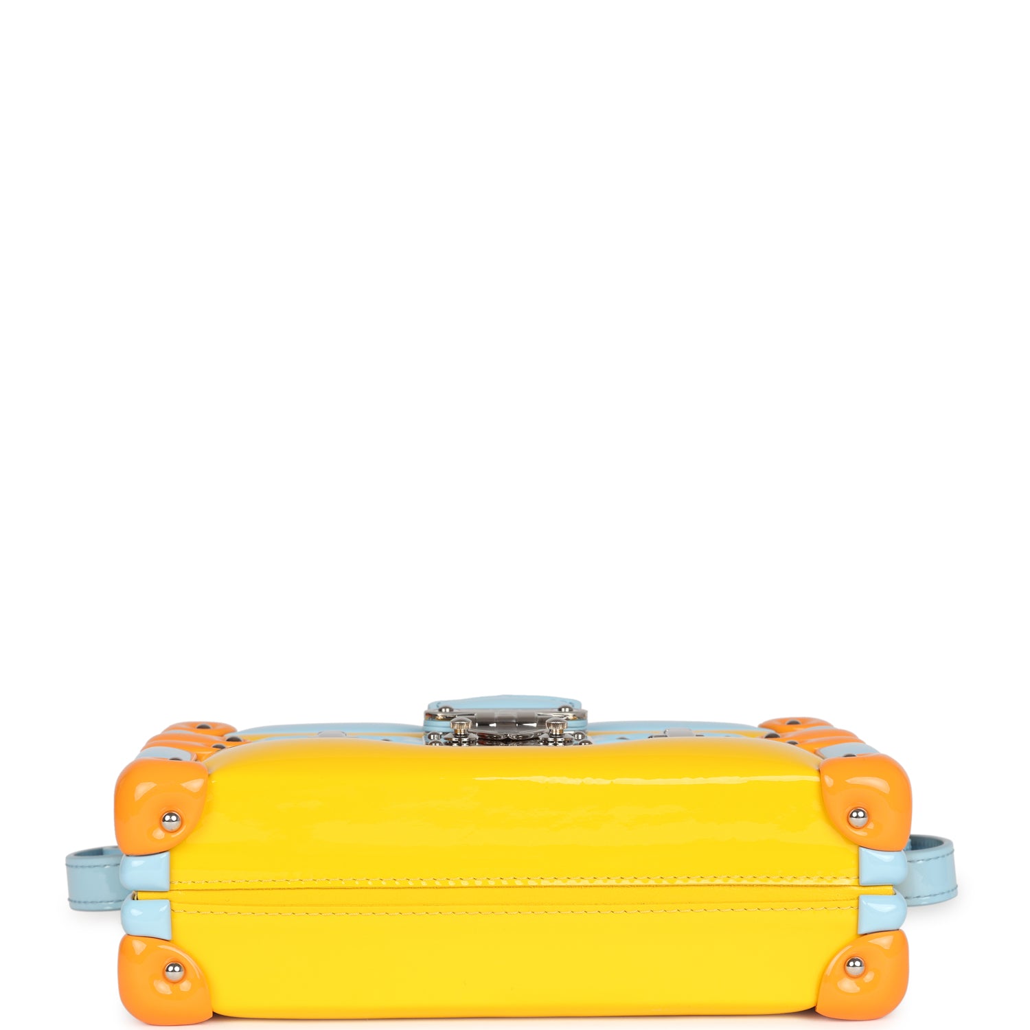 This Petite Malle Handbag is in light blue and yellow calfskin and glossy calfskin leather with silver hardware is in collaboration between Nicolas Ghesqui��re and Chinese artist Sun Yitian. It features "puffy" light blue and orange glossy calfskin leather trimming, silver studs and two faux S-locks detailing on the front and has a magnetic and S-lock closure, adjustable leather top handle and a removable adjustable leather strap.