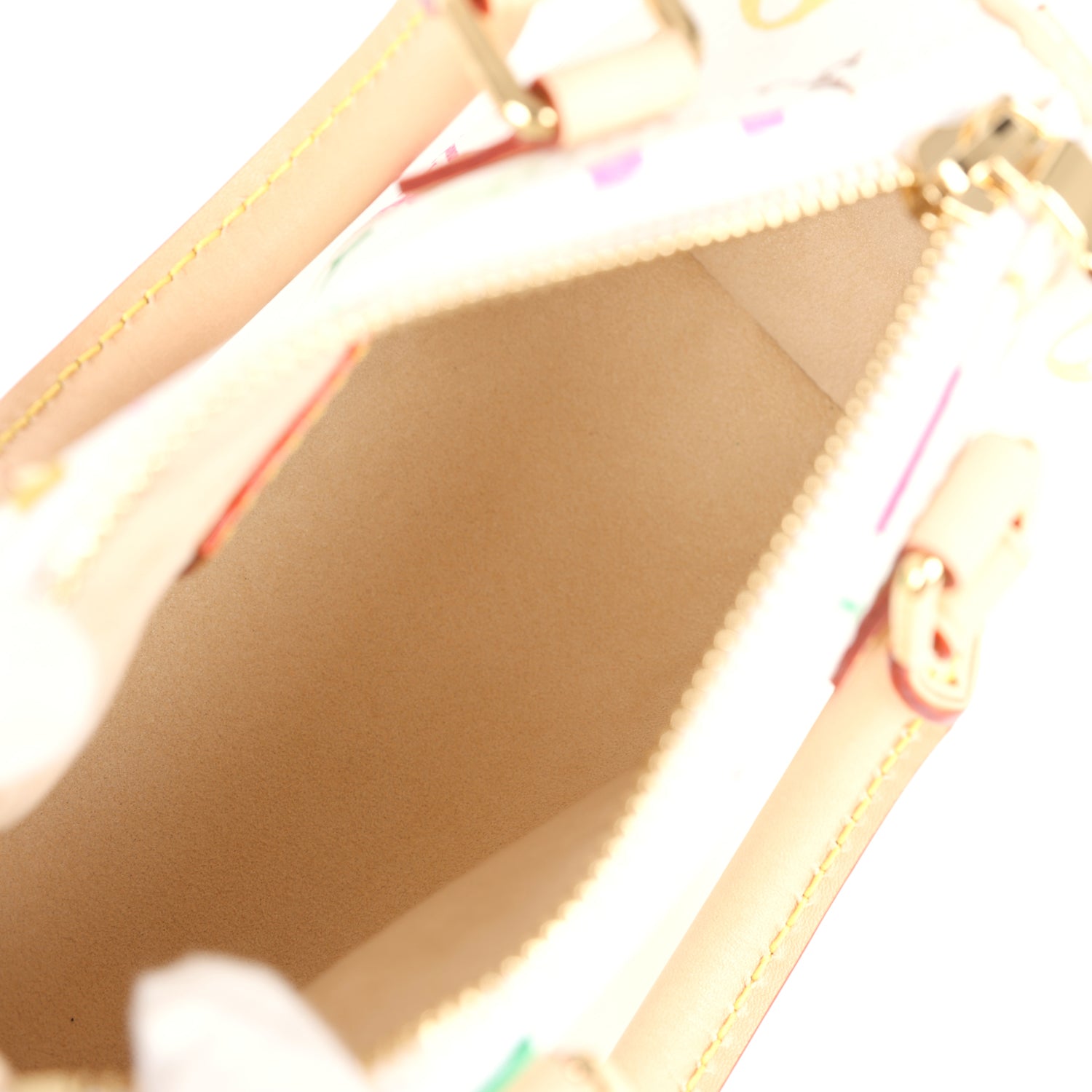 This 20th Anniversary Re-Edition 2025 Louis Vuitton X Takashi Murakami Nano Speedy is in white monogram multicolored coated canvas leather with gold hardware, features natural cow-hide leather trimming, a zipper closure, a removable cow-hide leather keychain, double rolled handles and a removable adjustable cow-hide leather shoulder/crossbody strap.