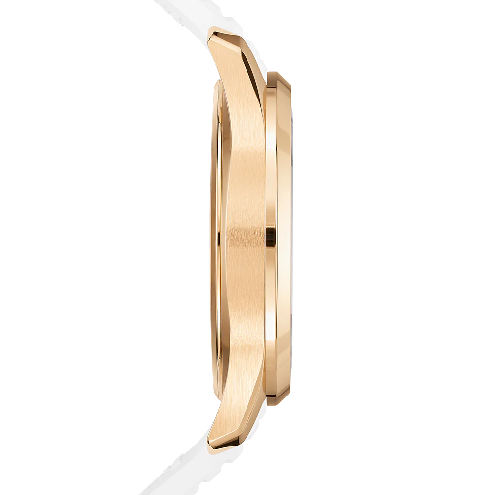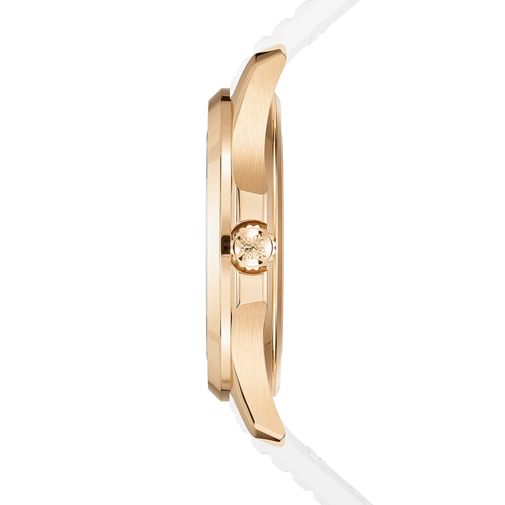 The sporty chic look of the self-winding rose gold Aquanaut Luce has been revisited in a larger diameter (38.8 mm) and fitted with a new integrated strap. The dial featuring the Aquanaut motif and the strap in an ultra-resistant composite material are clad in the same elegant matte white. Water-resistant to 120 m, the rounded octagonal case is enhanced by polished and satin finishes. The bezel is lit up by 48 diamonds (~1.11 ct). The self-winding 26-330 S C movement is equipped with a 'stop seconds' function serving to set time to the exact second. The patented fold-over clasp is secured by four independent catches.