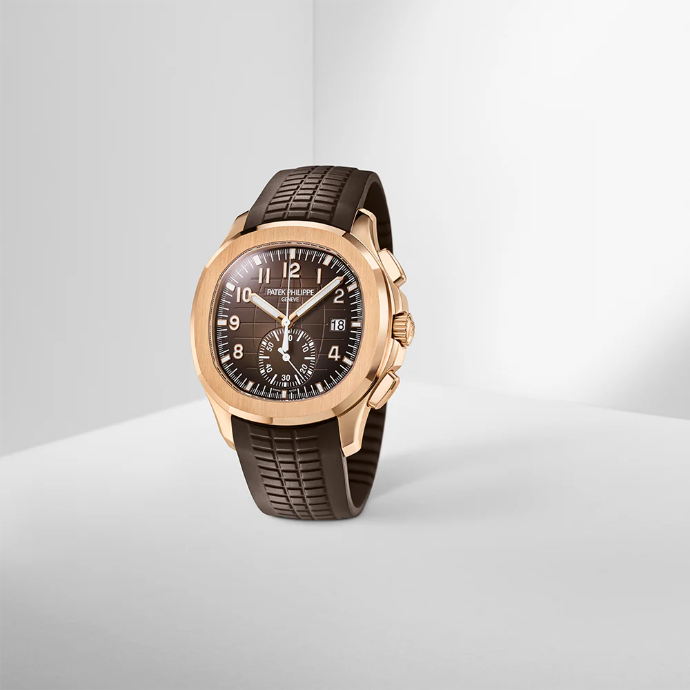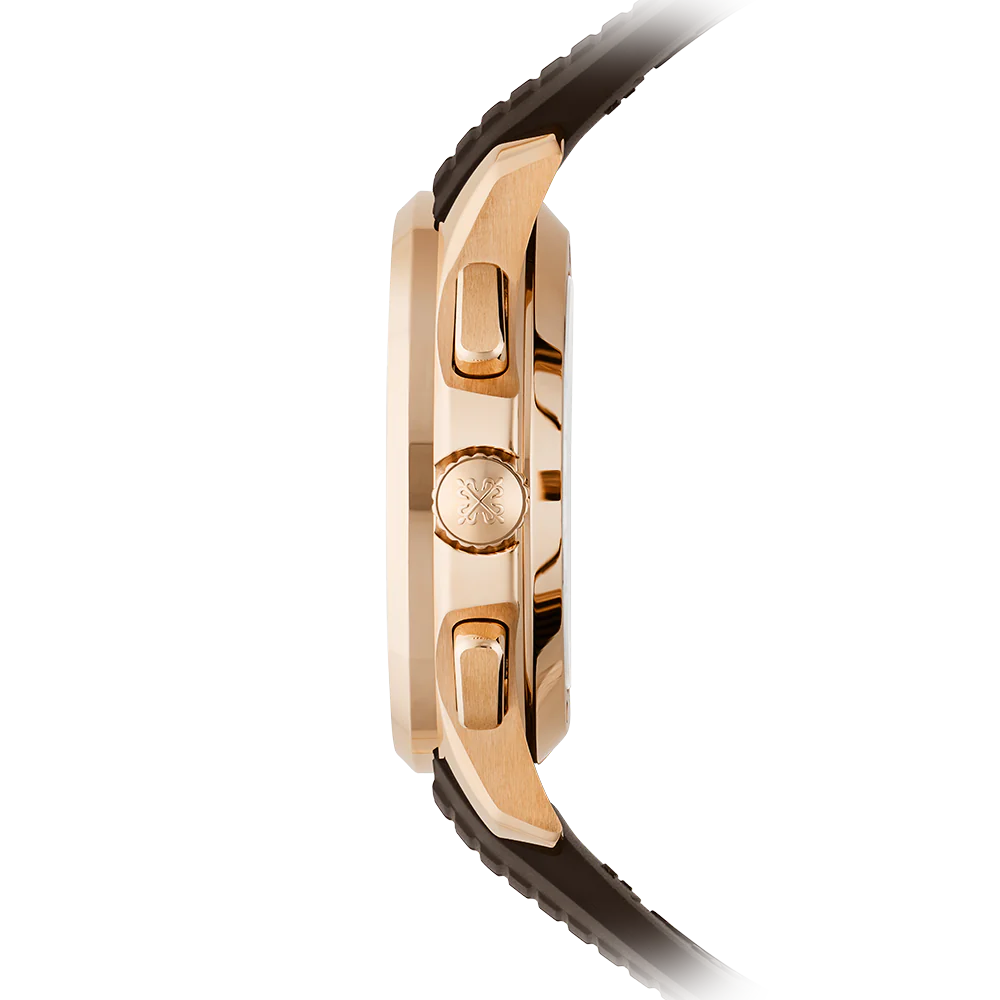 Patek Philippe revisits the sporty style of the Aquanaut chronograph in a rose gold version, paired with a sunburst brown dial featuring a black-gradient rim and matching composite strap.?The original design of the case (water-resistant to 120 m) and the bezel is highlighted by the alternating polished and satin-brushed finishes.?The self-winding flyback chronograph movement combines tradition (column wheel drive) with innovation (vertical disk clutch). Since the clutch causes almost no wear, the central chronograph seconds hand can also be used to display the seconds continuously.