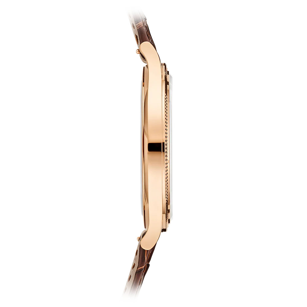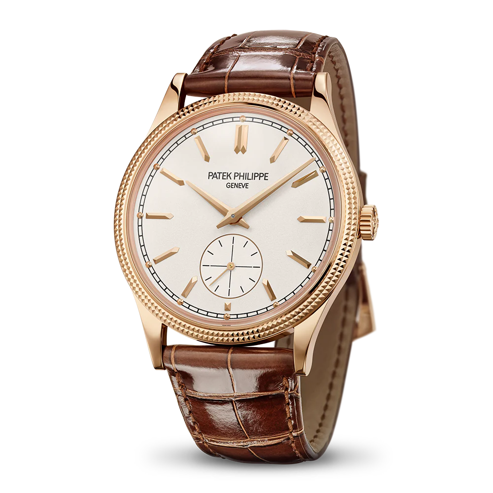 Patek Philippe gives fresh momentum to the emblematic Calatrava model featuring a guilloched hobnail pattern also known as Clous de Paris by treating it to a slightly larger diameter and a design reinterpreted in a contemporary spirit. The faceted applied rose gold hour-markers, combined with dauphine-style hours/minutes hands, create a sleek and timeless dial aesthetic. The elegantly refined rose gold case houses the new manually wound movement 30-255 PS with a 65-hour power reserve.