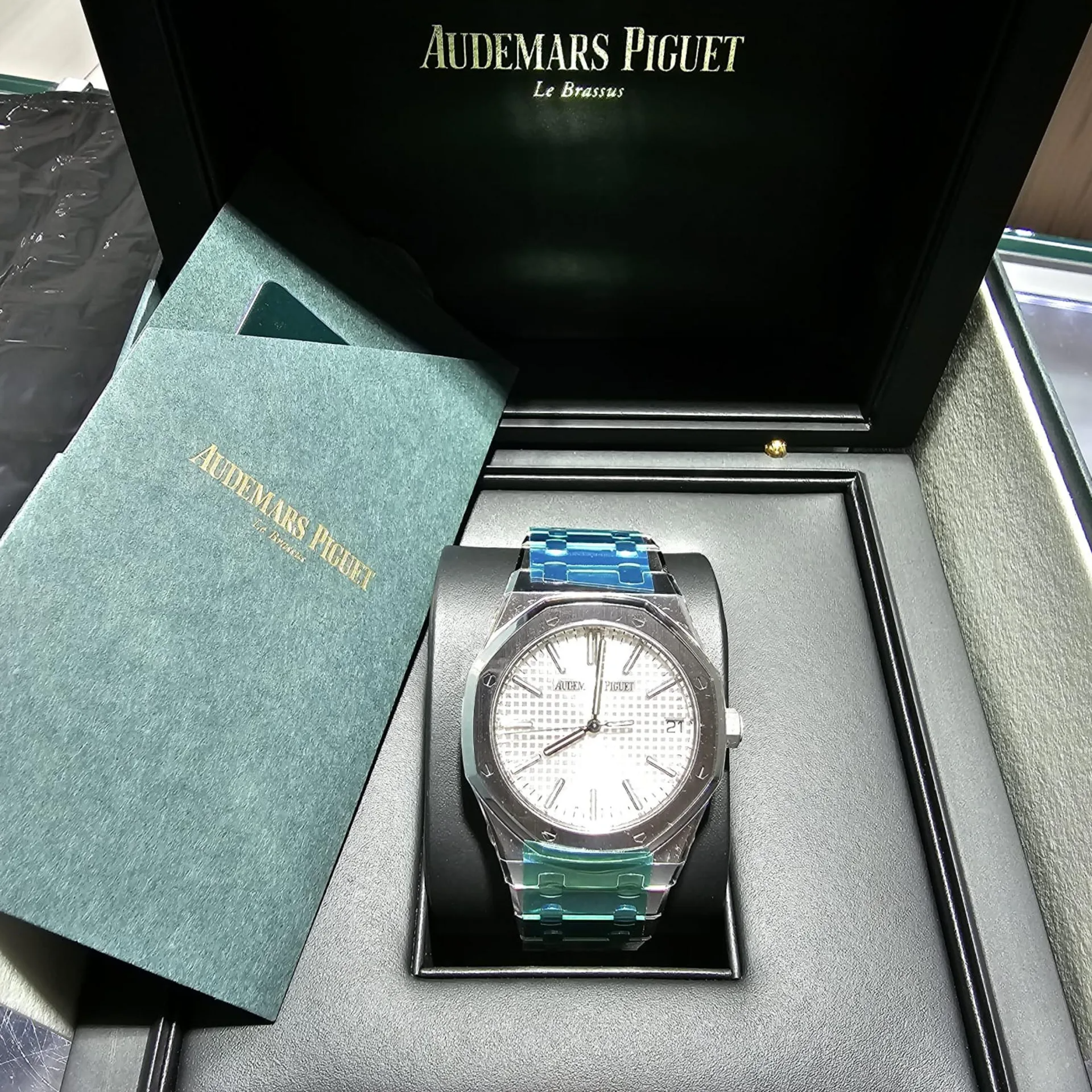 Silver-toned dial with “Grande Tapisserie” pattern, white gold applied hour-markers and Royal Oak hands with luminescent coating.