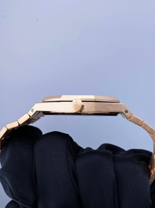 Black dial with “Grande Tapisserie” pattern, pink gold applied hour-markers and Royal Oak hands with luminescent coating.
